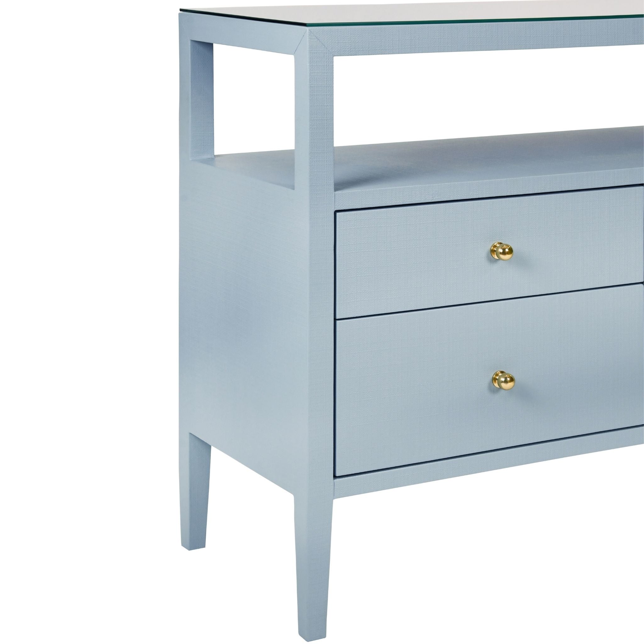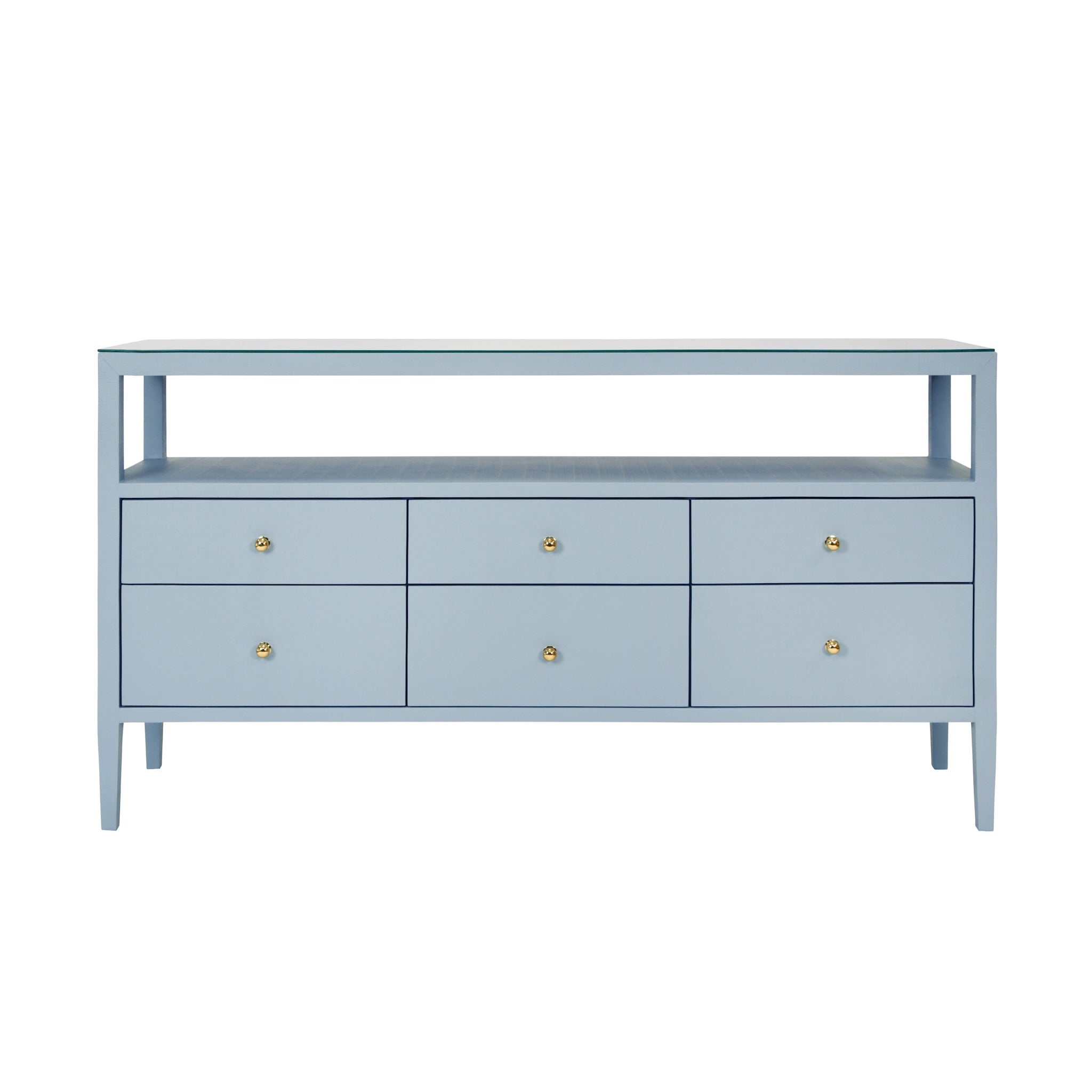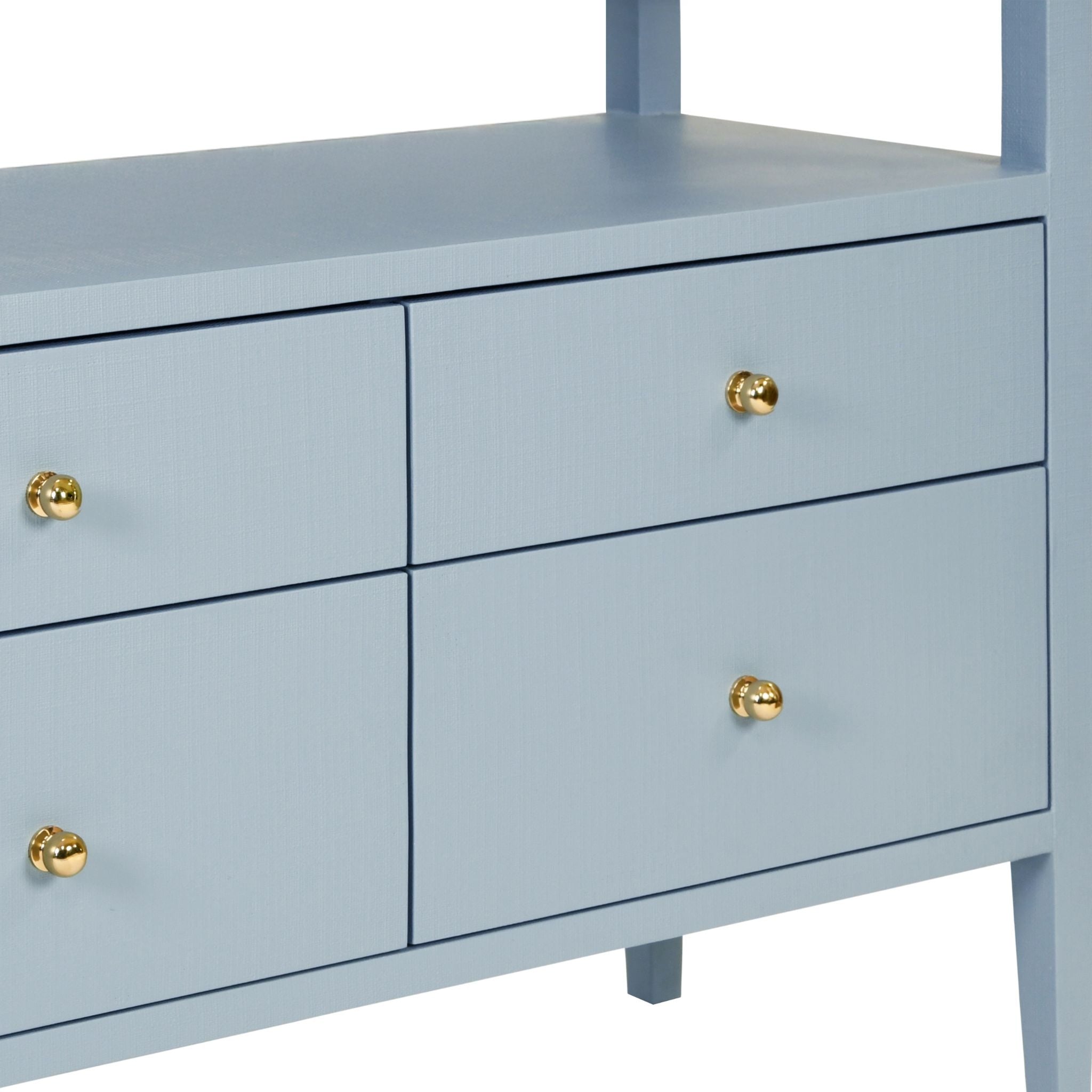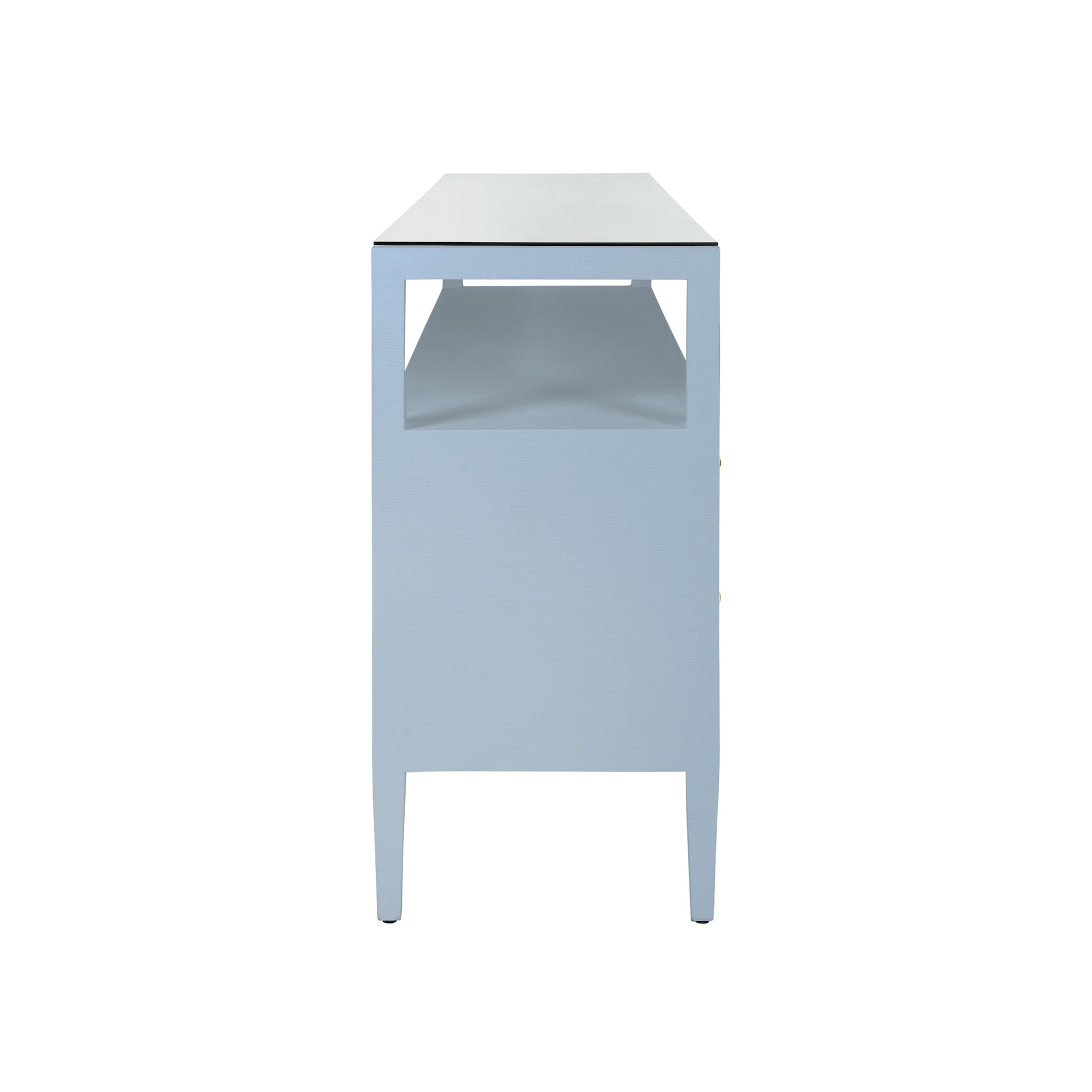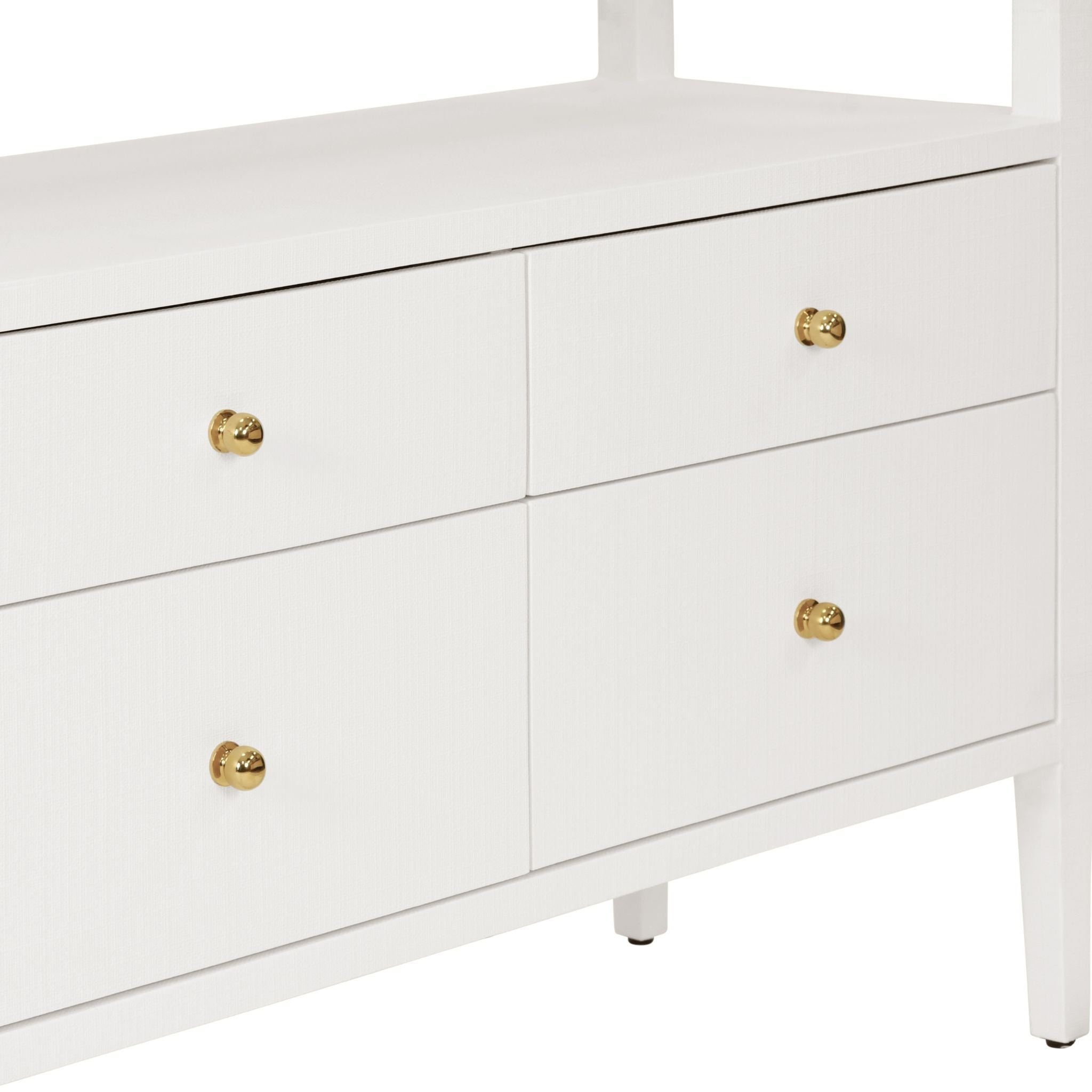 The Jordan Console showcases six spacious drawers and an open shelf, all wrapped in rich burl wood and finished with polished brass knobs and a sleek glass top. Its refined design and generous storage make it a standout piece that brings warmth, texture, and sophistication to any space.