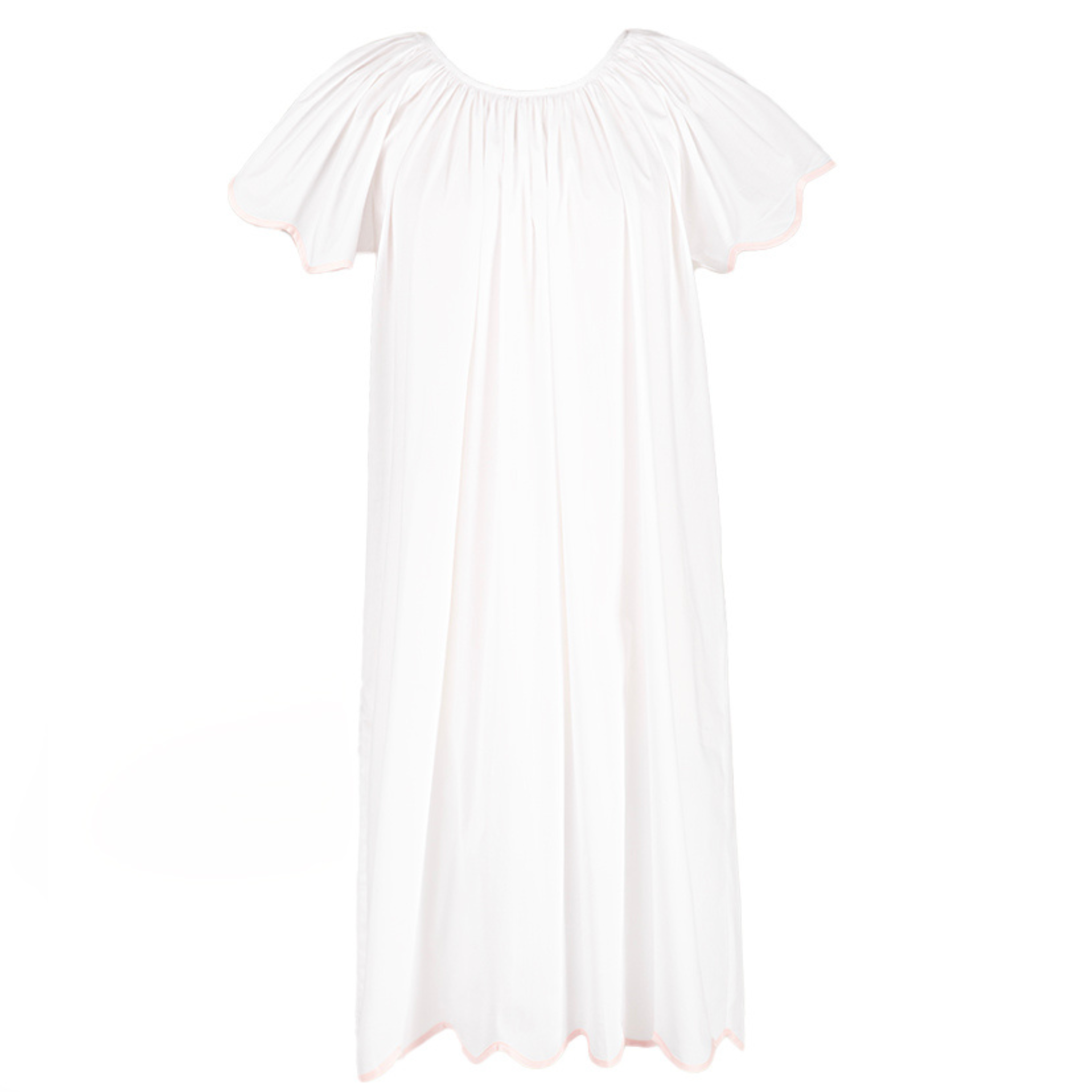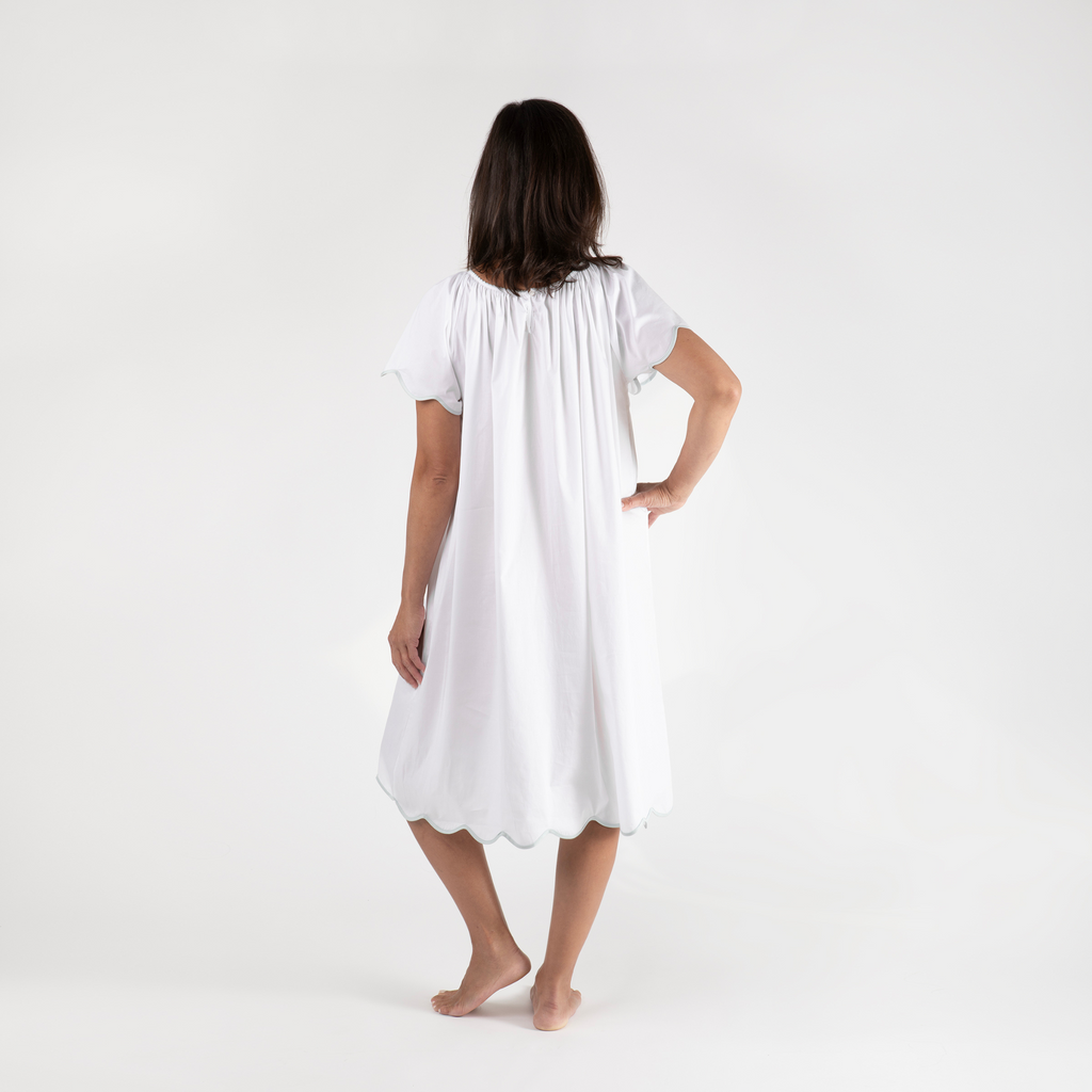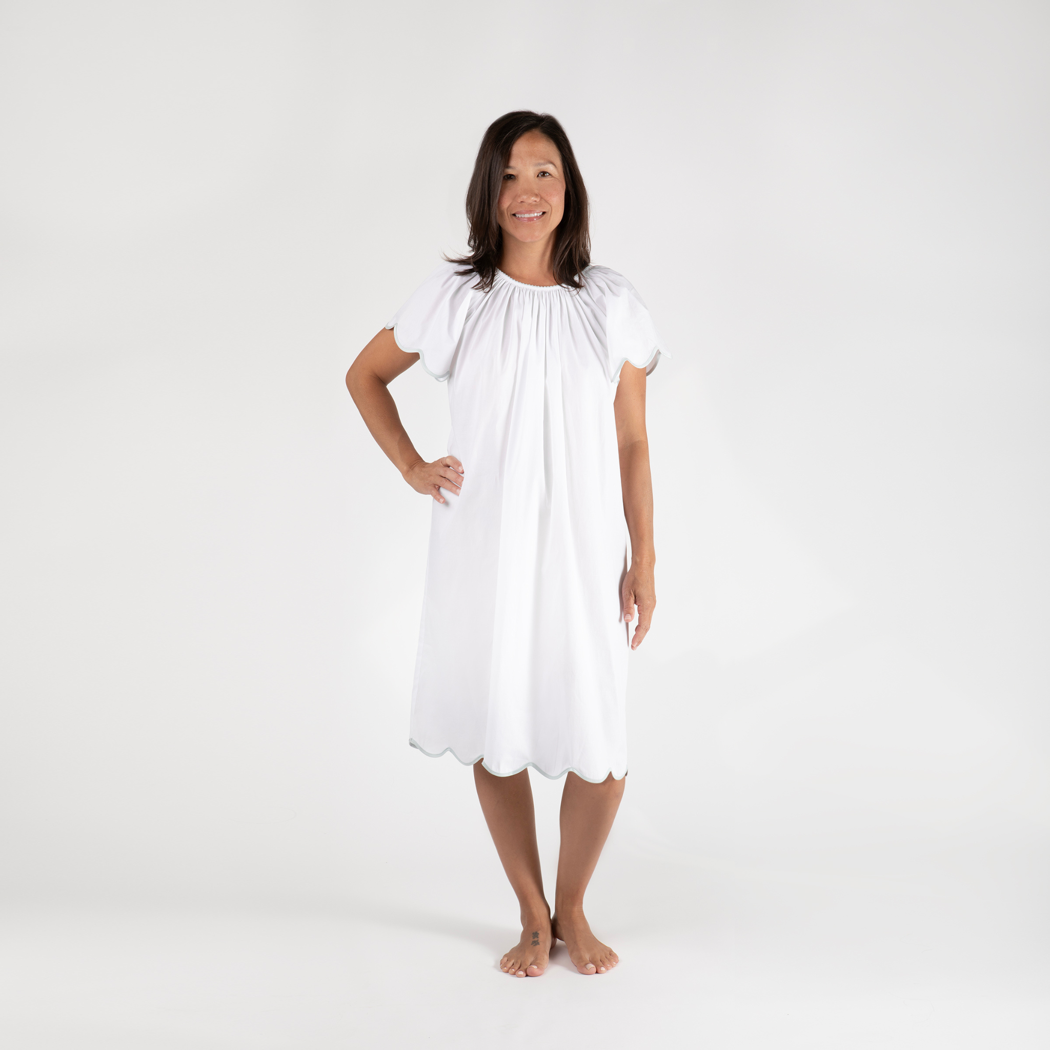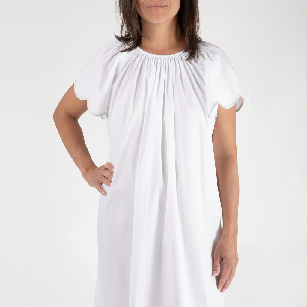An epitome of grace and comfort, the Vandy Cotton Nightgown is adorned with scalloped tape trim on the sleeves and hemline. Elegantly finished with a single button for a touch of refined simplicity, the Vandy Nightgown boasts a full silhouette crafted by a gathered jewel neckline. Drift into dreamland wrapped in the timeless allure of the Vandy Cotton Nightgown, where every detail whispers comfort and sophistication.