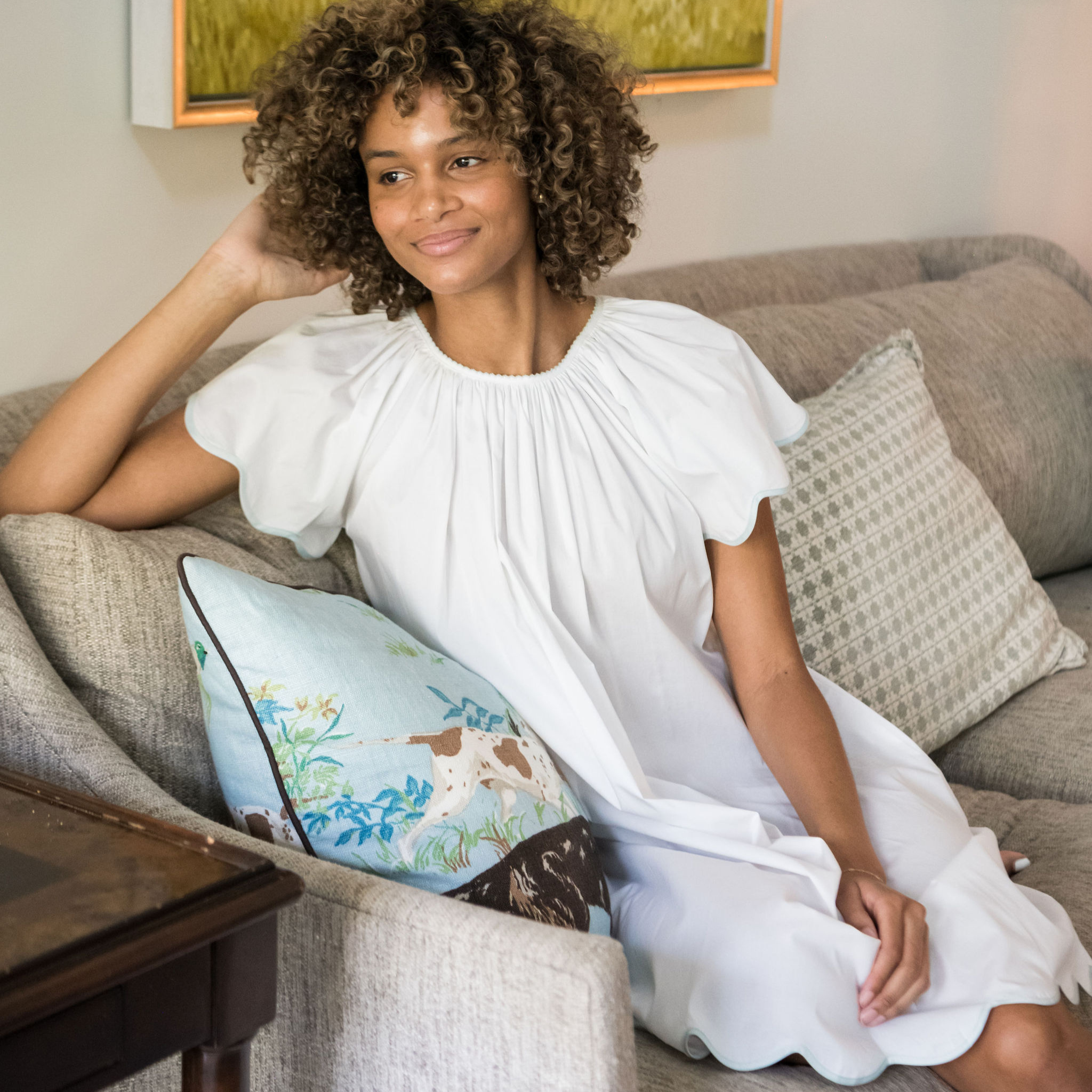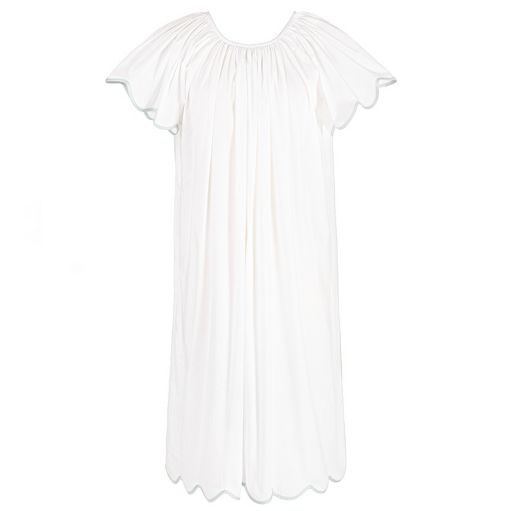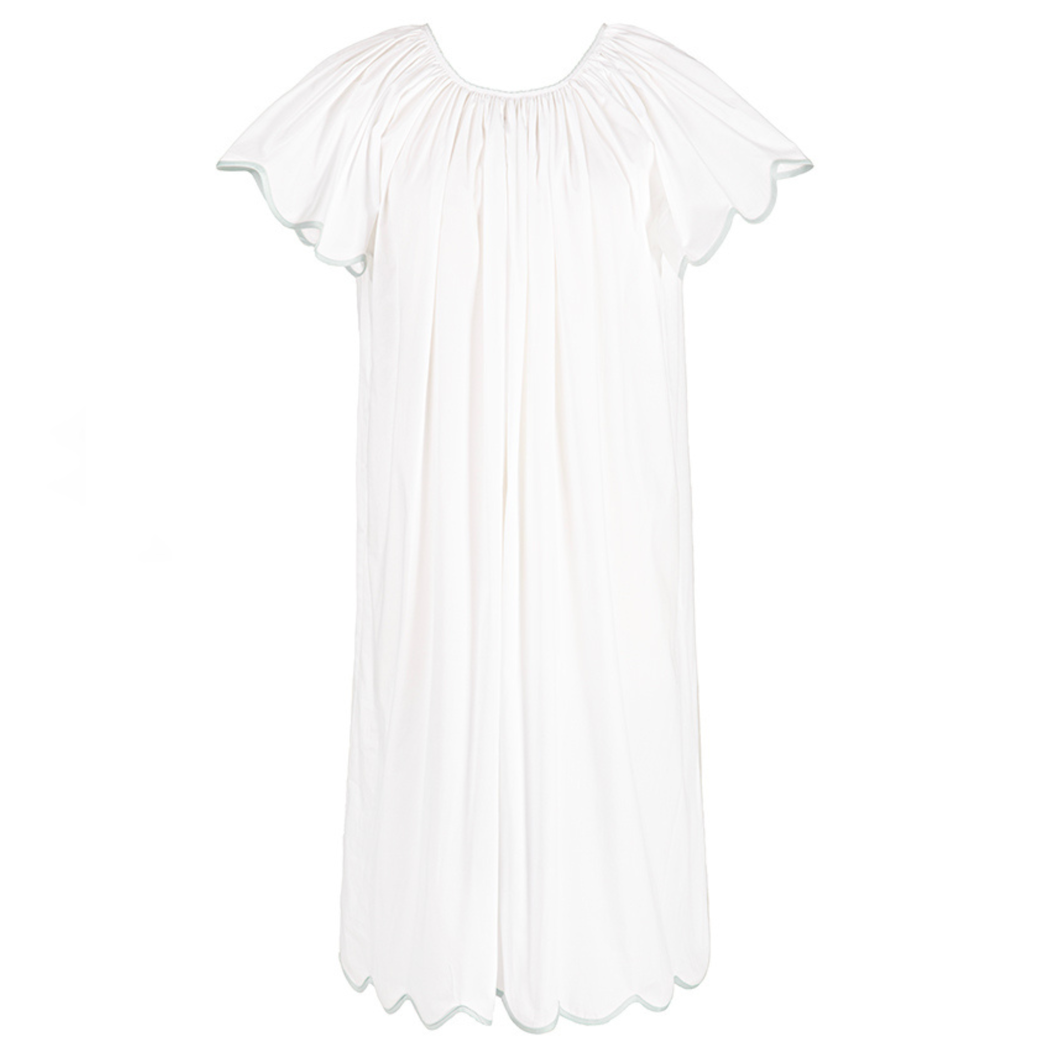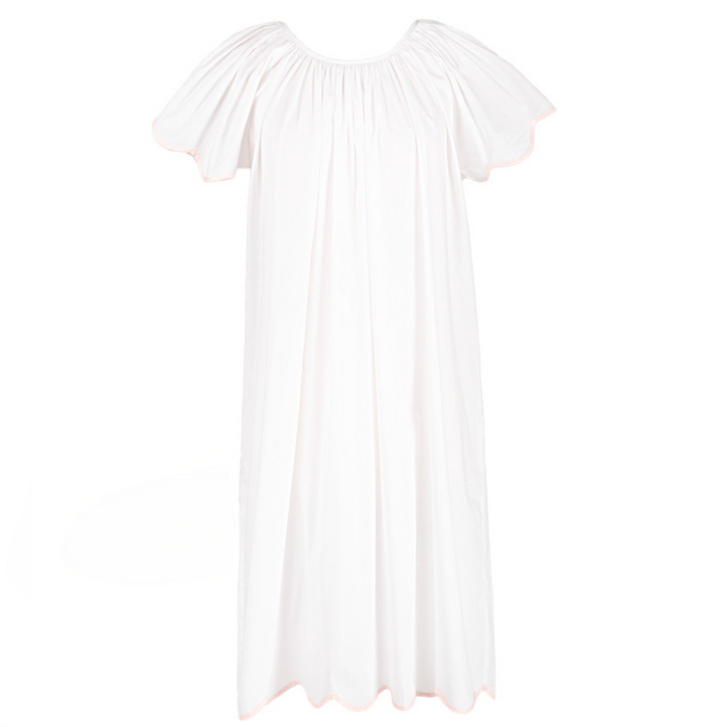 An epitome of grace and comfort, the Vandy Cotton Nightgown is adorned with scalloped tape trim on the sleeves and hemline. Elegantly finished with a single button for a touch of refined simplicity, the Vandy Nightgown boasts a full silhouette crafted by a gathered jewel neckline. Drift into dreamland wrapped in the timeless allure of the Vandy Cotton Nightgown, where every detail whispers comfort and sophistication.