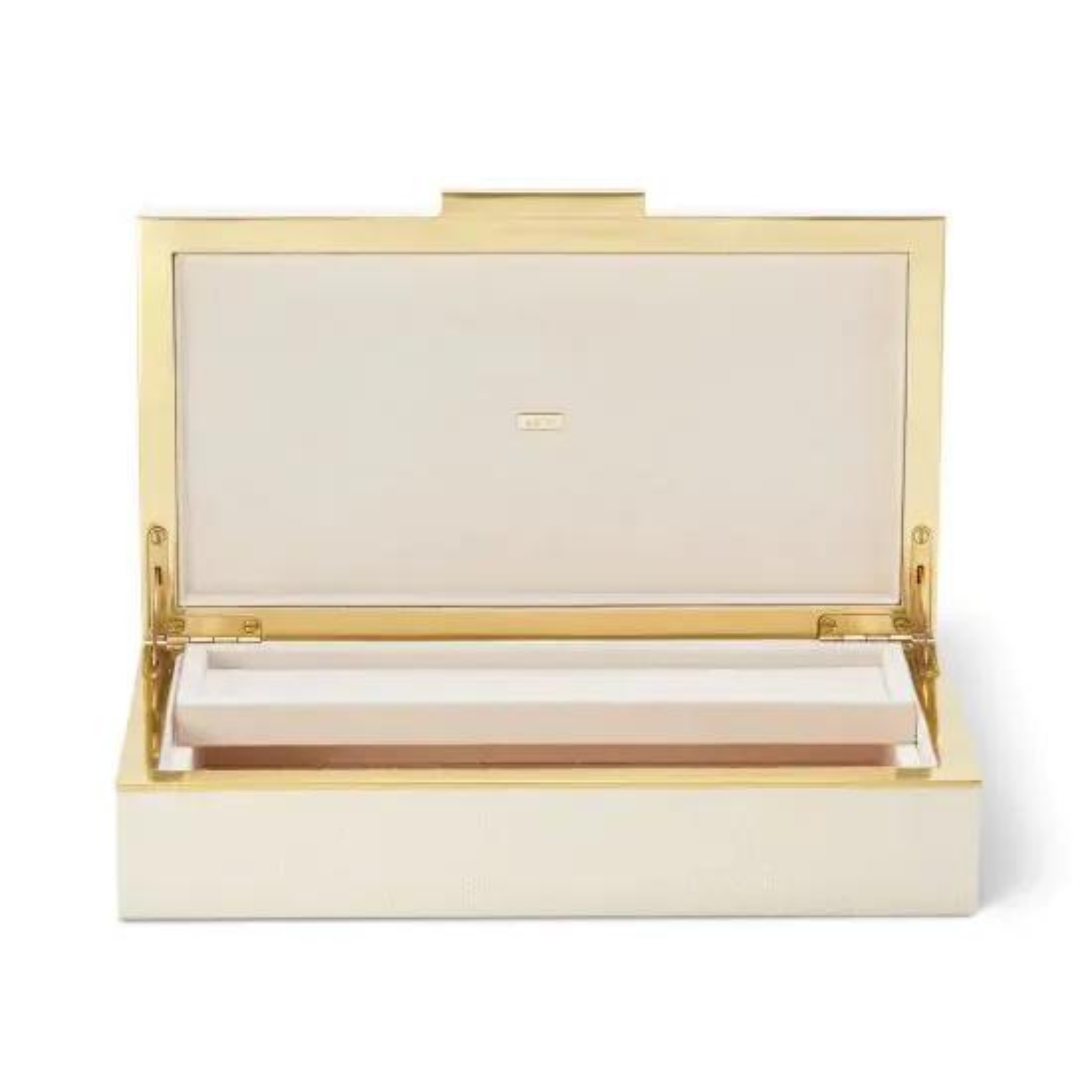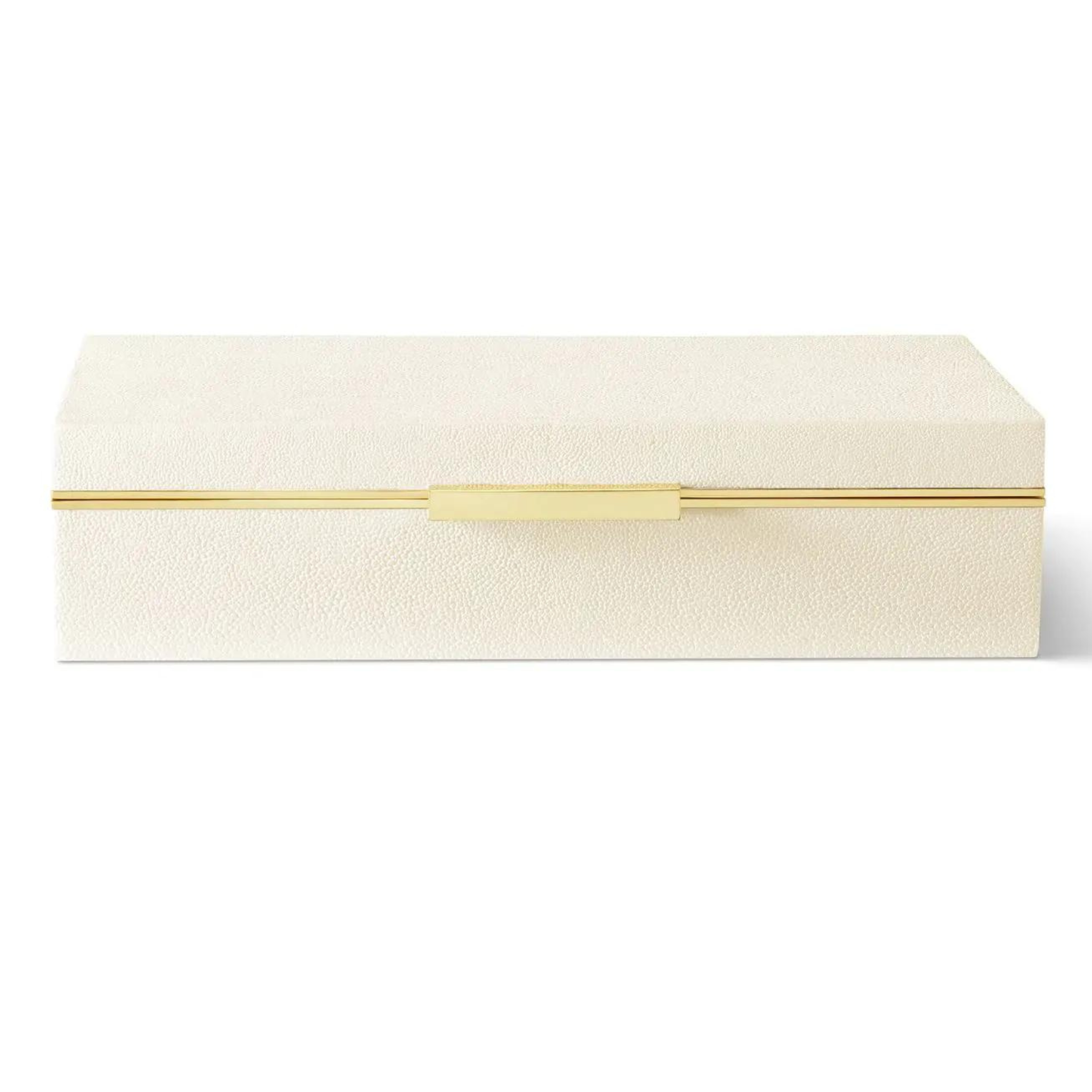Keep a desk organized with this beautiful envelope box in luxurious shagreen edged in brass. A removable pencil tray is a practical addition. A sophisticated way to keep an office in order.