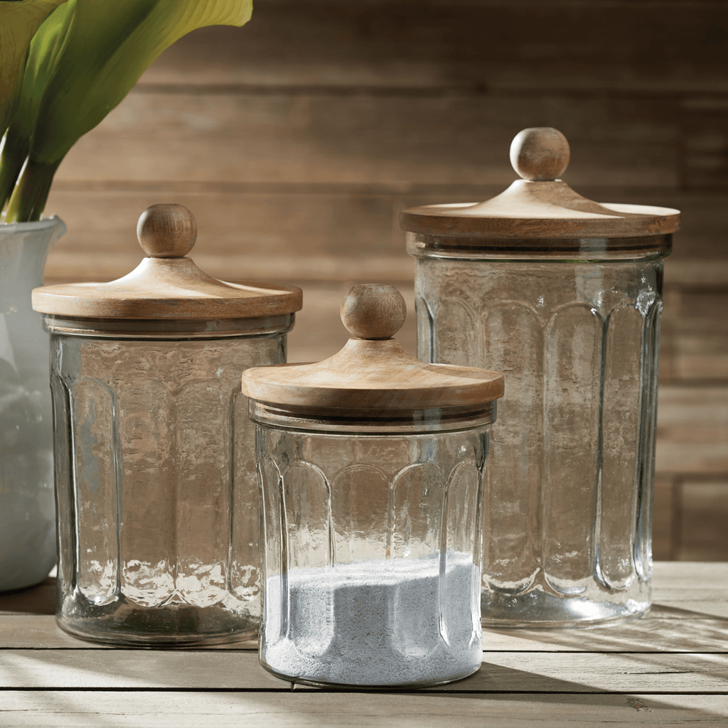 Upgrade your kitchen with these pretty and practical canisters. In a classic mix of seeded glass and wood, these canisters are a beautiful set. Perfect for countertop storage, or beautiful accents on their own.