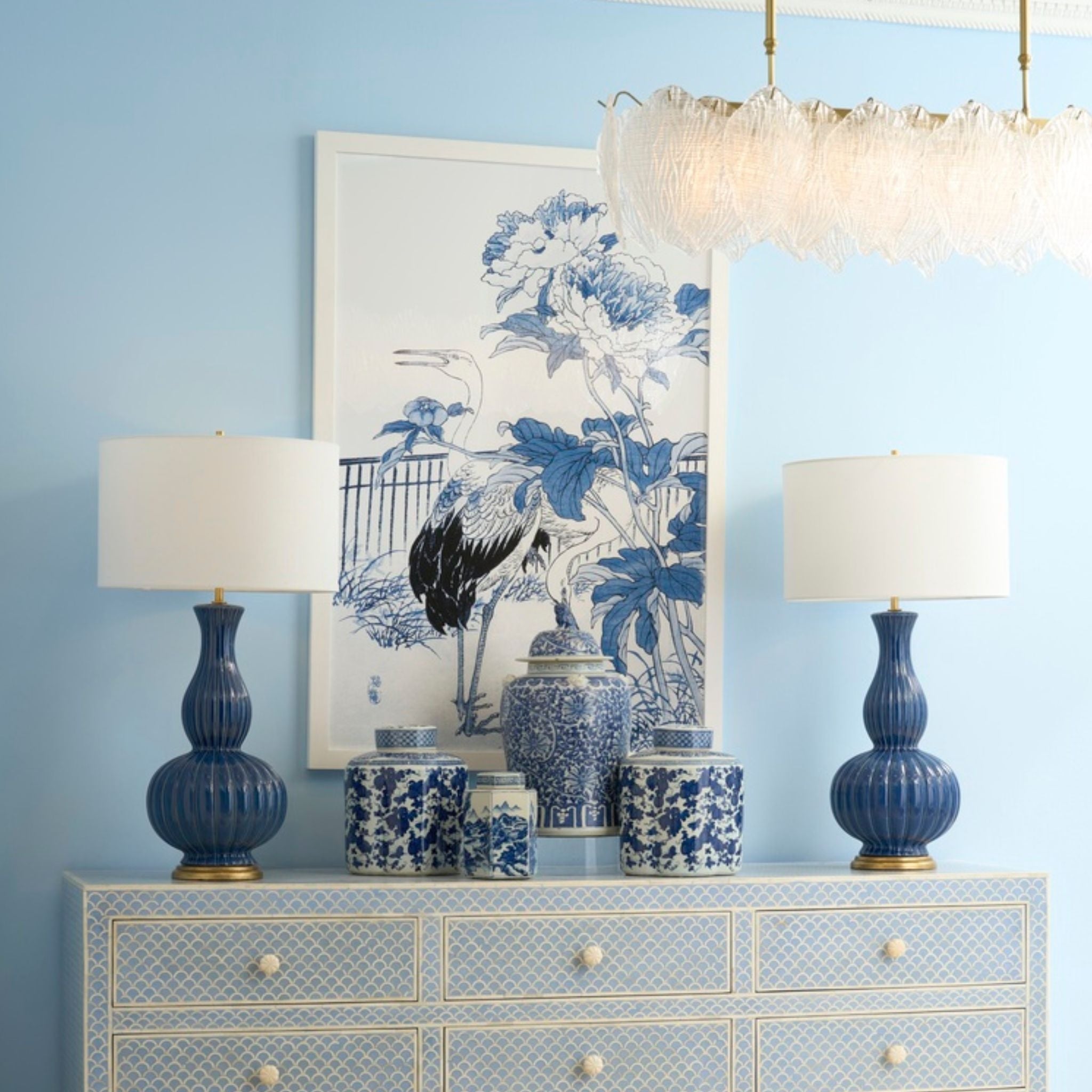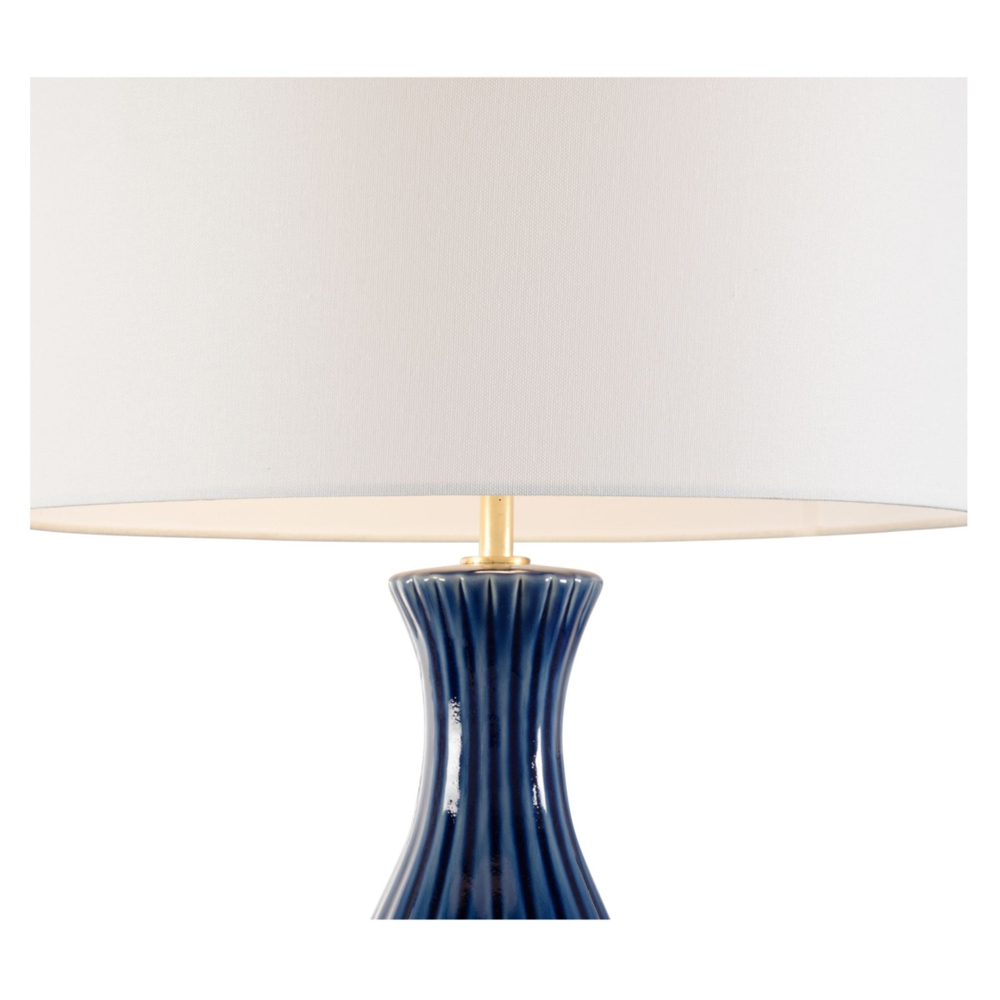 The timeless ceramic shape with blue matte finish and white shade of the Augusta Lamp creates understated luxury appeal and versatile styling.