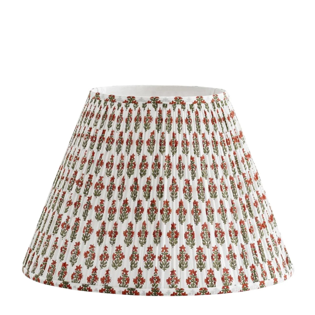 Patterned lampshades have long been a decorator’s secret to adding color and texture to a space in a unique way. Bunny Williams Home's exclusive patterned shades are the perfect tool for this - made of cotton voile fabric that is handblocked in India and shirred and assembled in the USA. This bold red flower pattern is exotic and has the unrestrained essence of bohemian flair - imagine the sultry glow in a den or next to your most comfortable armchair. Scaled to work on nearly all of the Bunny Williams Home table lamps.