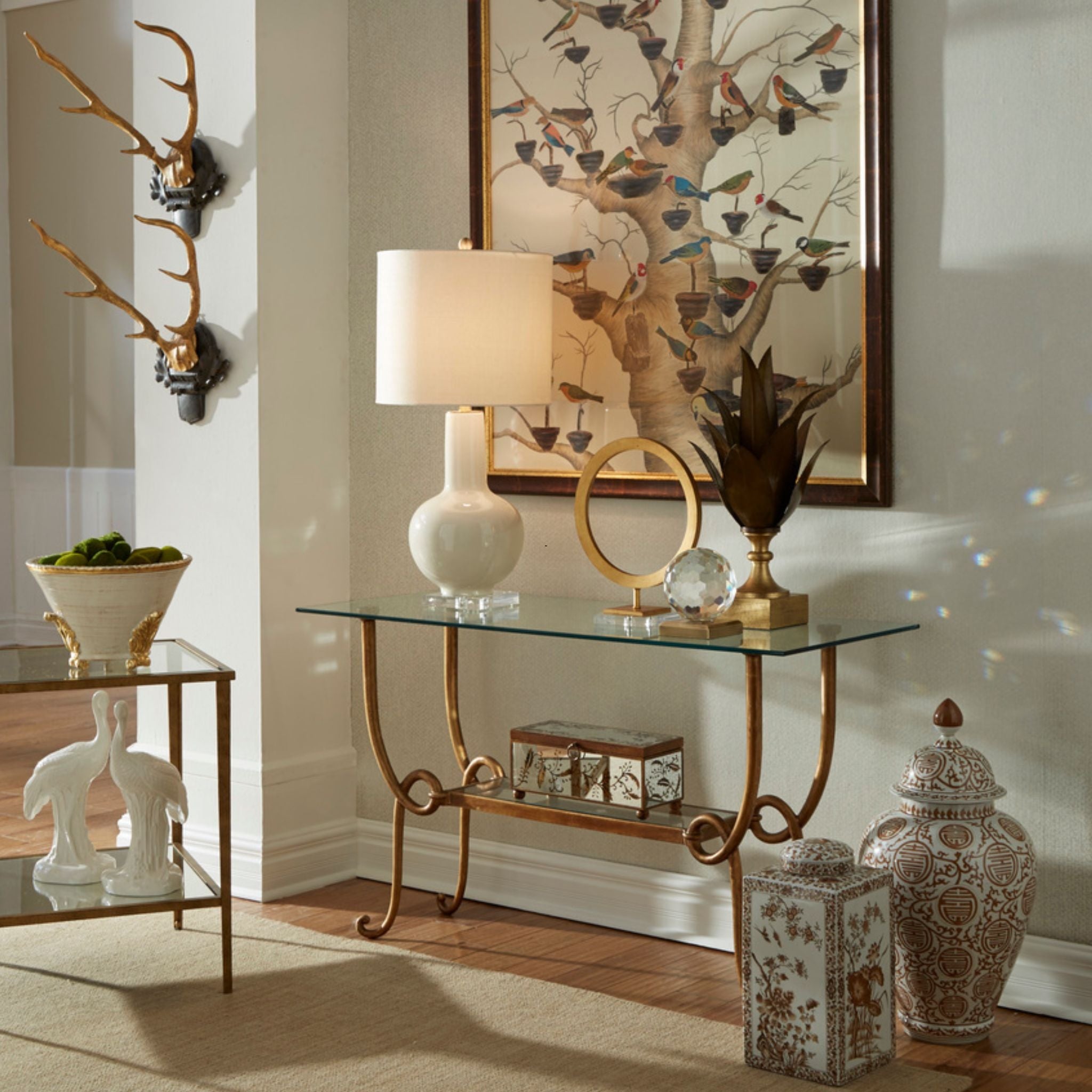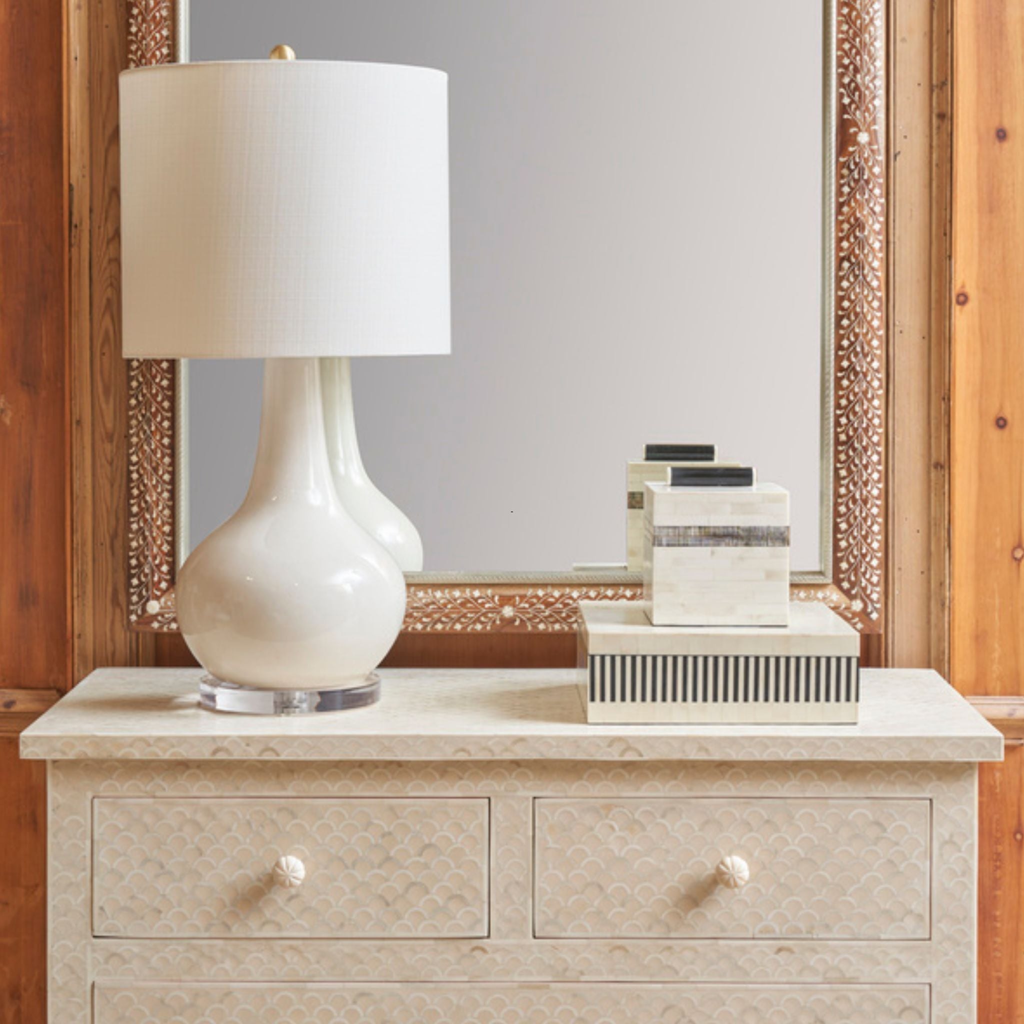 Guaranteed to become an instant favorite in your decor, this versatile table lamp will make any room shine. The cream glazed ceramic body boasts a gently curved silhouette that is mounted on a clear acrylic base. A cream linen drum shade is secured by a brass ball finial creating a neutral, contemporary design that blends seamlessly with any existing decor.