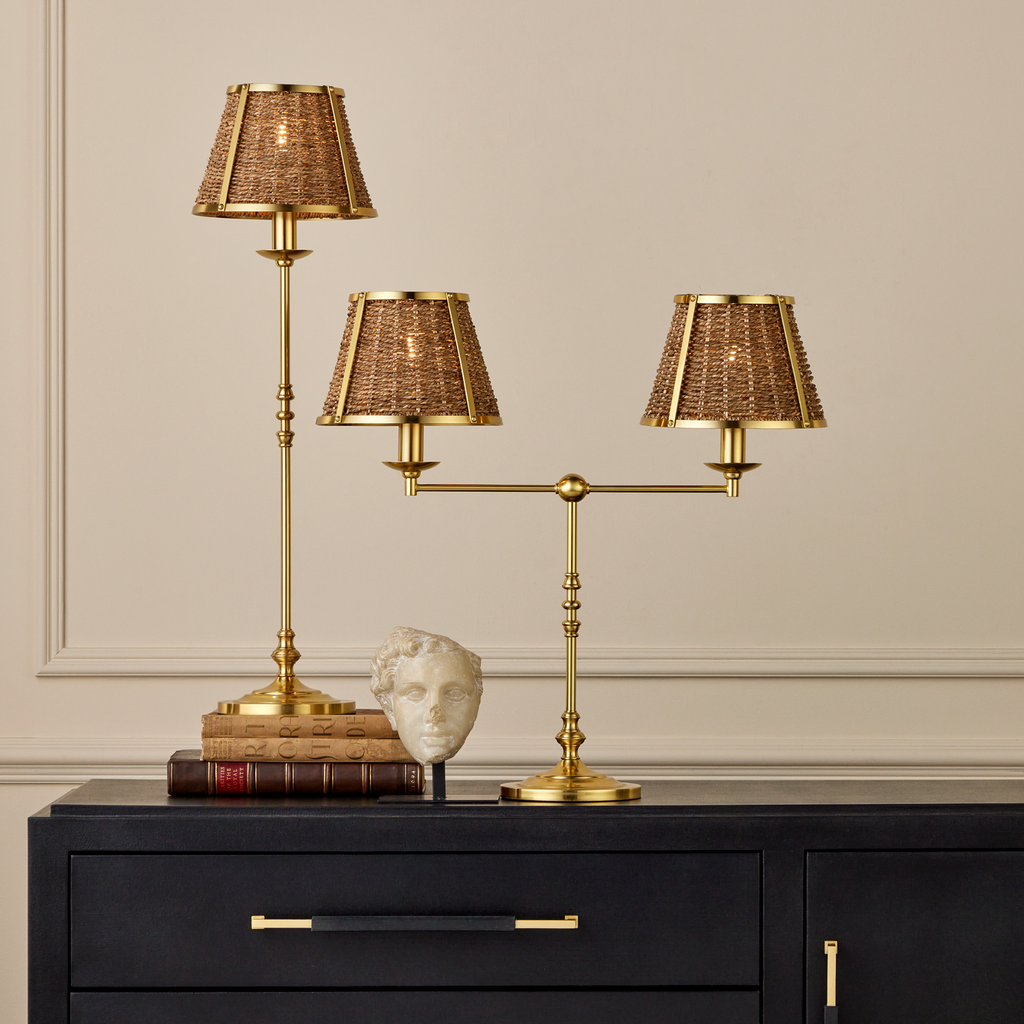 This Table Lamp was created by Suzanne Duin, who founded the Houston shop and design studio Maison Maison, and is known for a keen eye in sourcing authentic French antiques and home accessories from around the globe. Each piece in her line of woven light fixtures is handmade by artisans in Southeast Asia; the Deauville an example in natural seagrass and steel in a polished brass finish. This tailored table lamp trimmed in gold will bring both texture and French flair.