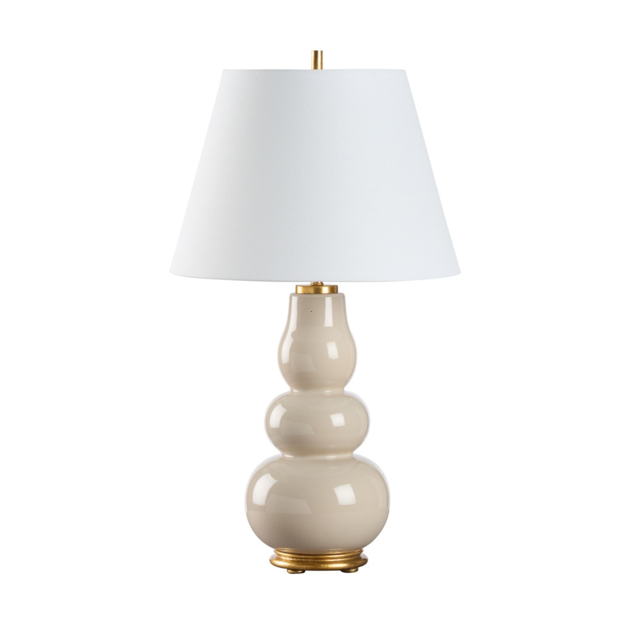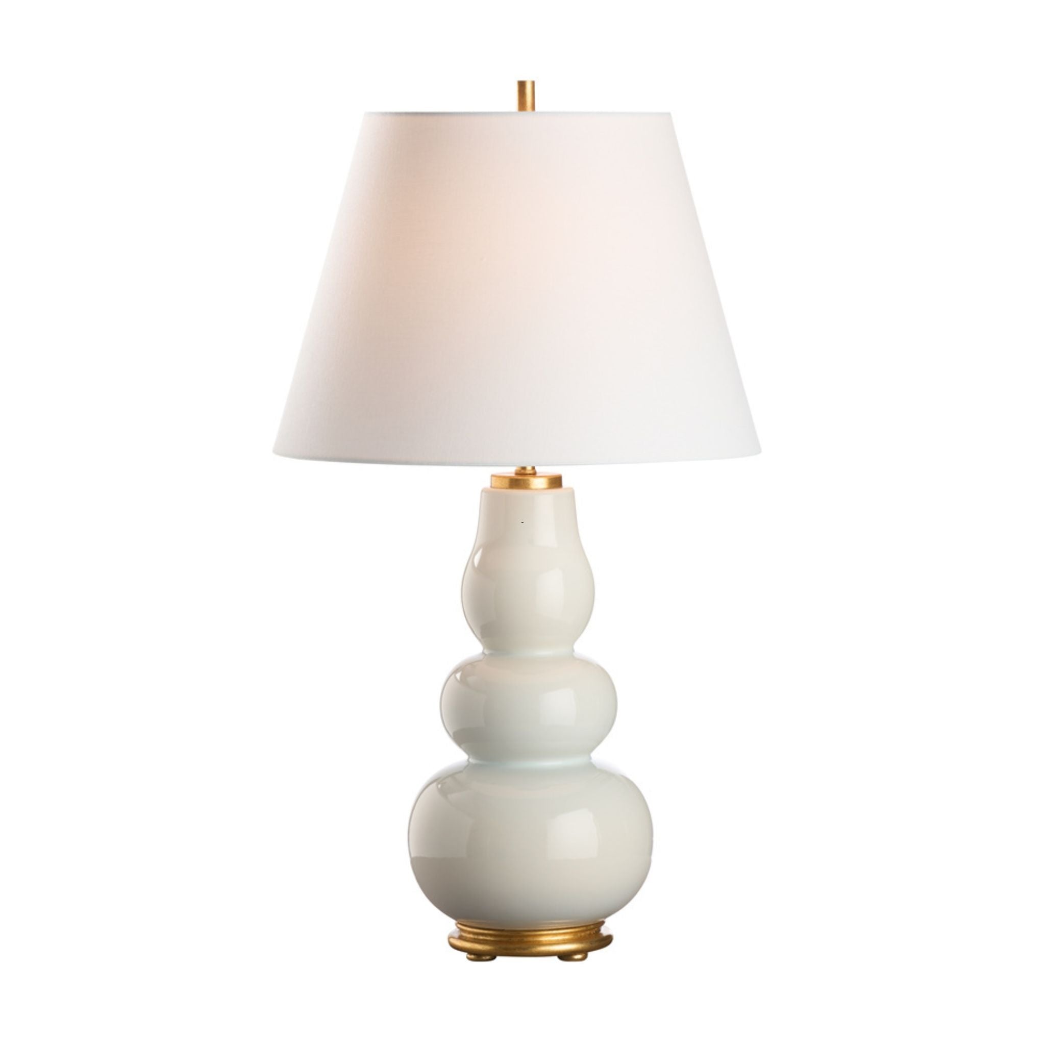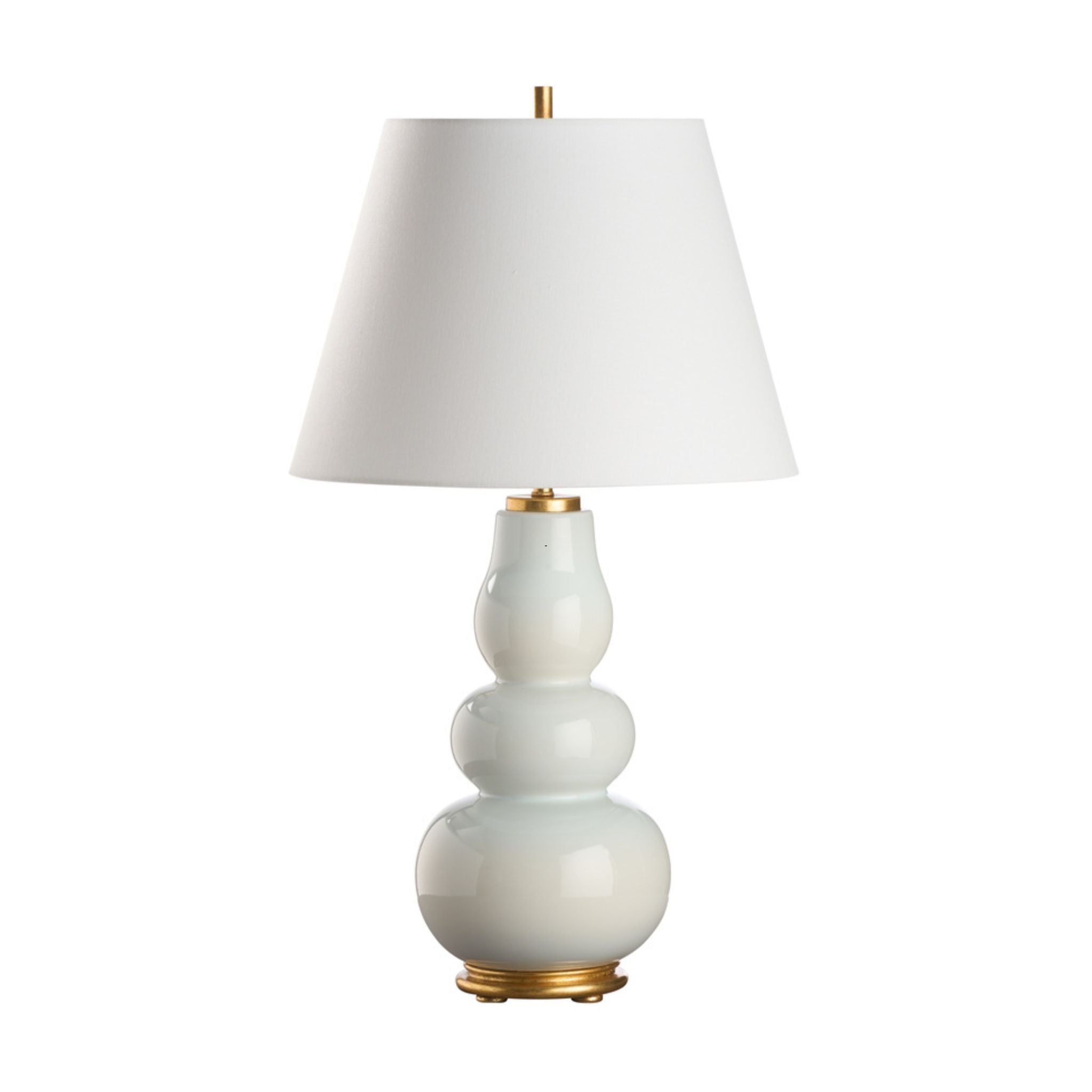This elegant ceramic lamp features soft, flowing curves in a soft white color, creating a calming and sophisticated aesthetic. Its gold base adds a touch of luxury, making it a striking addition to any space. Designed by Jamie Merida.