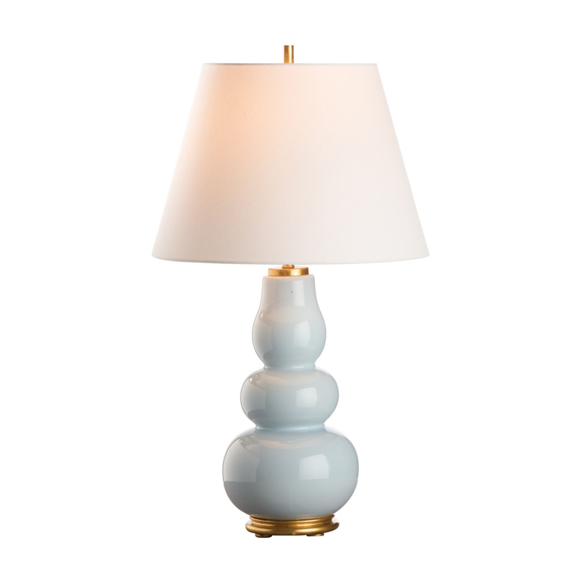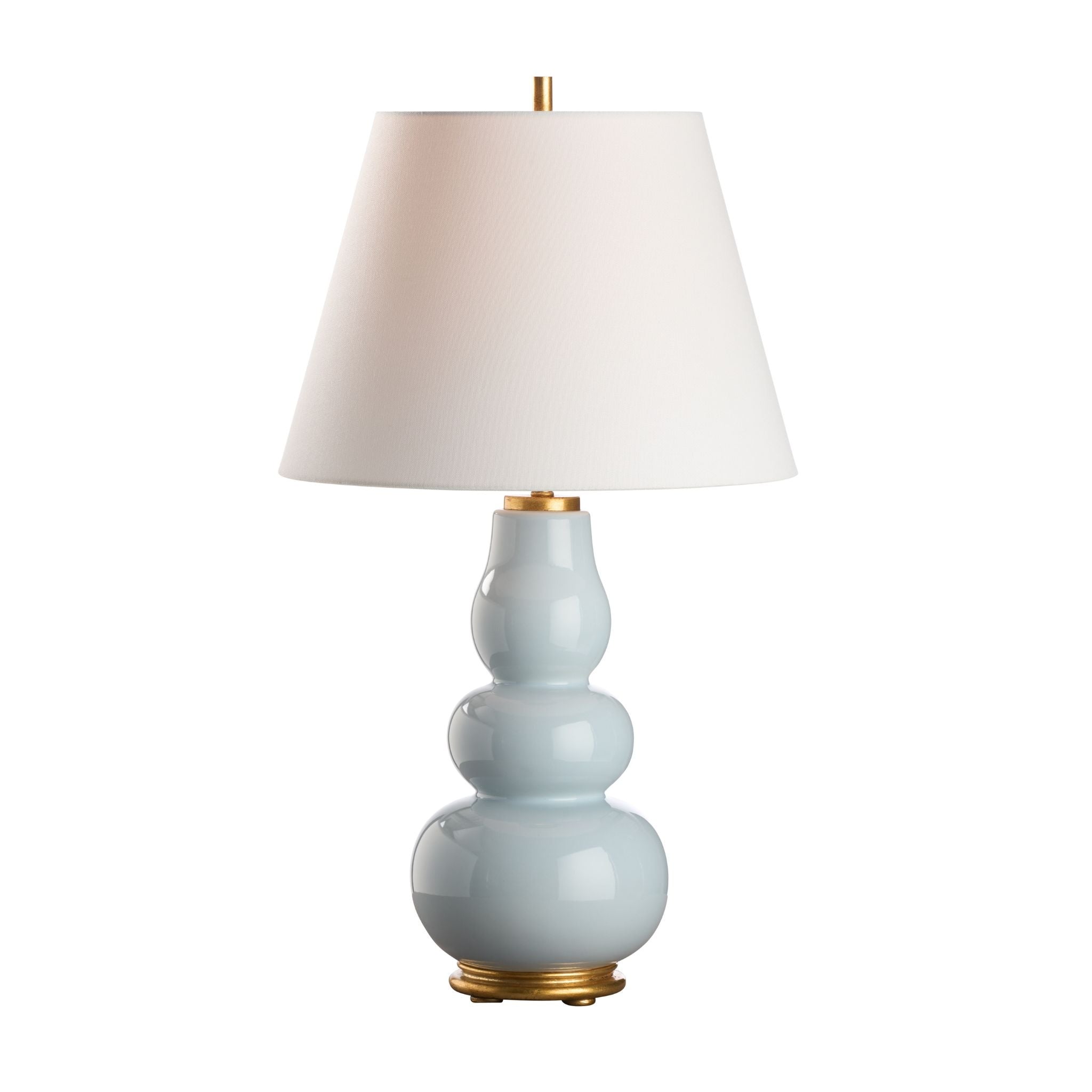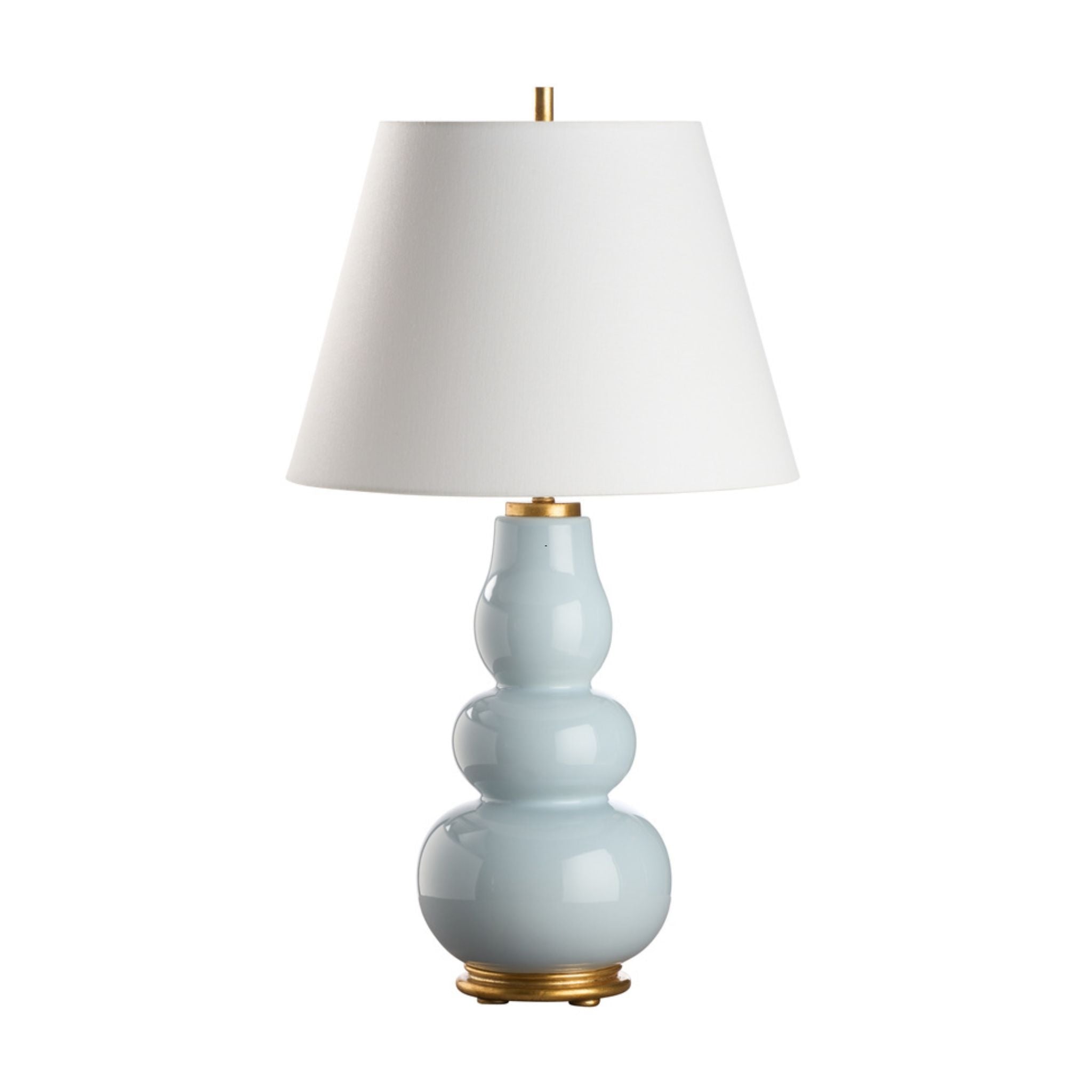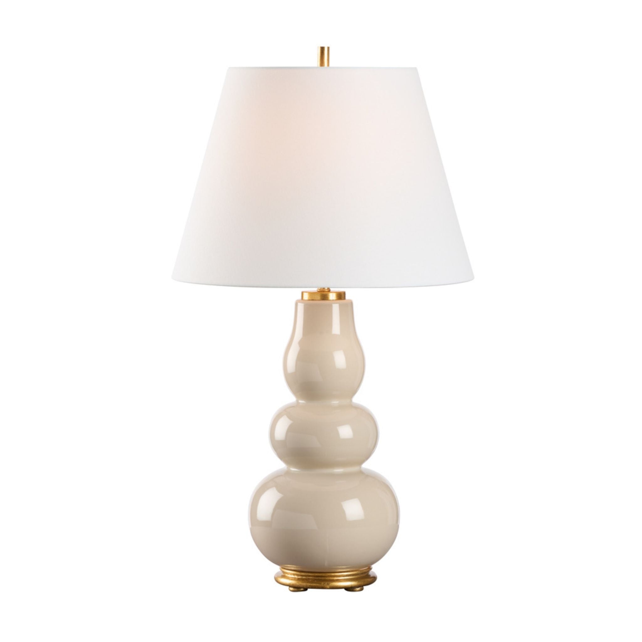 This elegant ceramic lamp features soft, flowing curves in a soft white color, creating a calming and sophisticated aesthetic. Its gold base adds a touch of luxury, making it a striking addition to any space. Designed by Jamie Merida.
