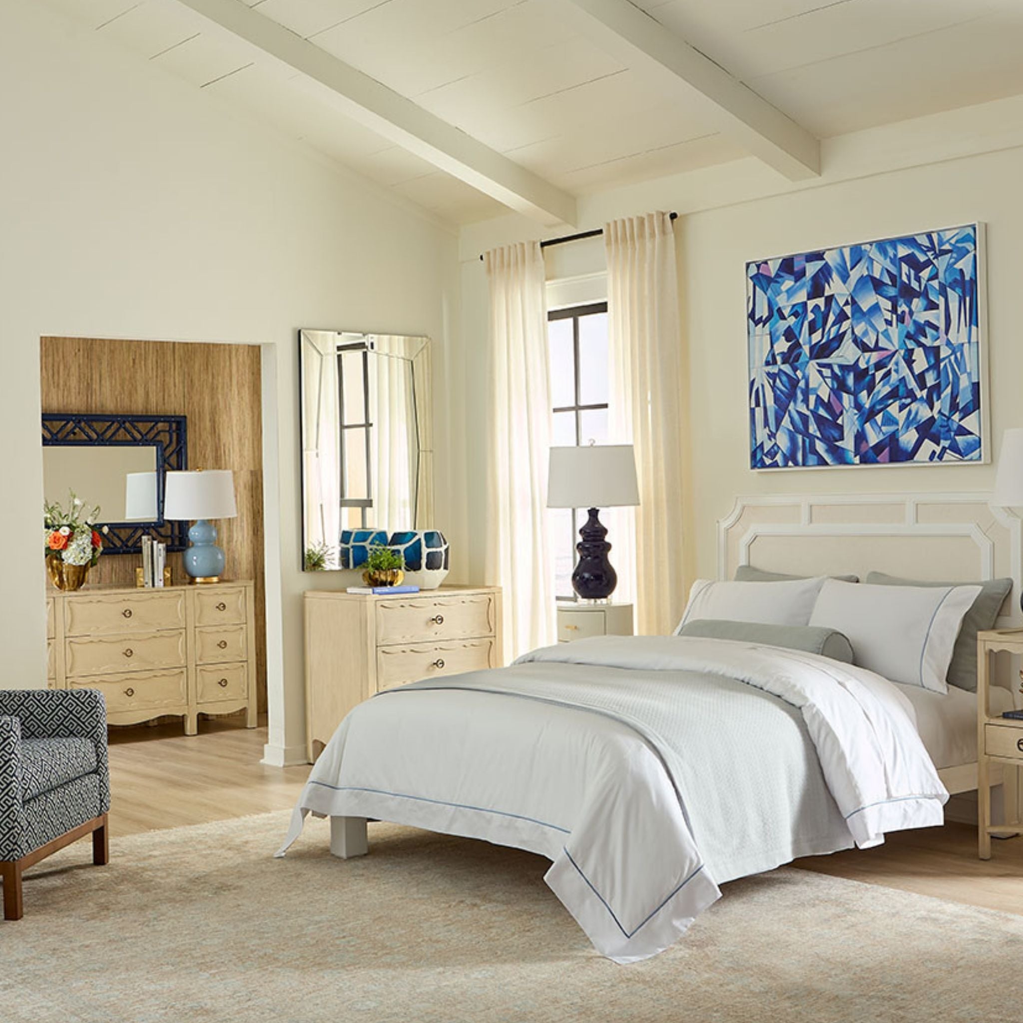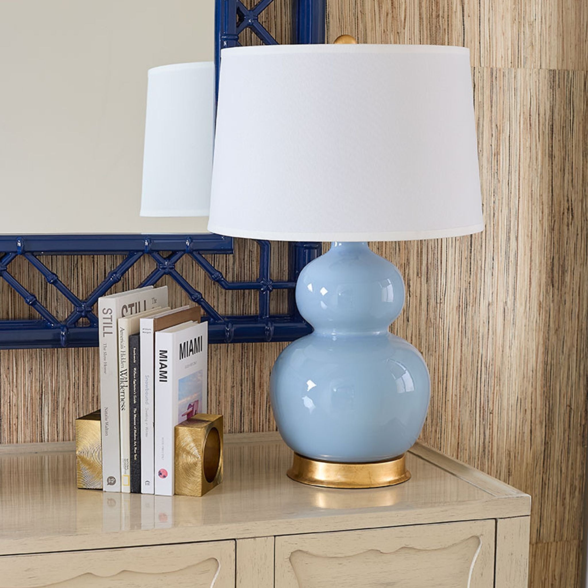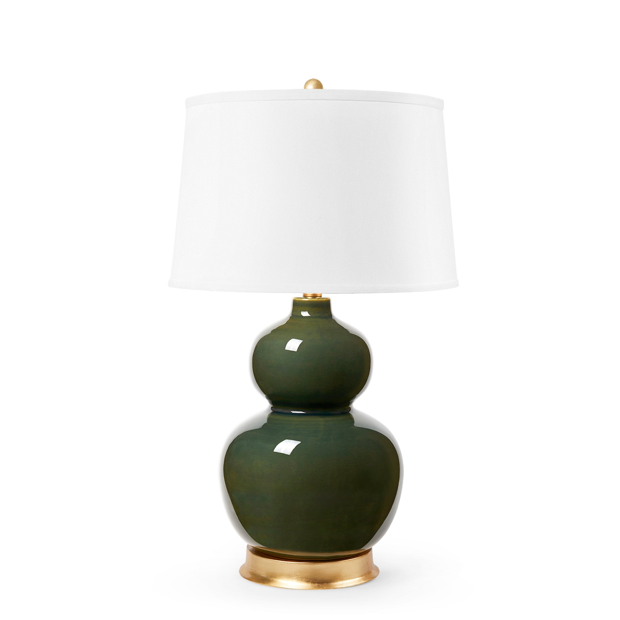 The Jade Lamp features a classic double-gourd silhouette crafted from glazed porcelain for a smooth, luminous finish. Accented with gold-leaf details and a crisp white linen shade, it brings timeless sophistication to any space.