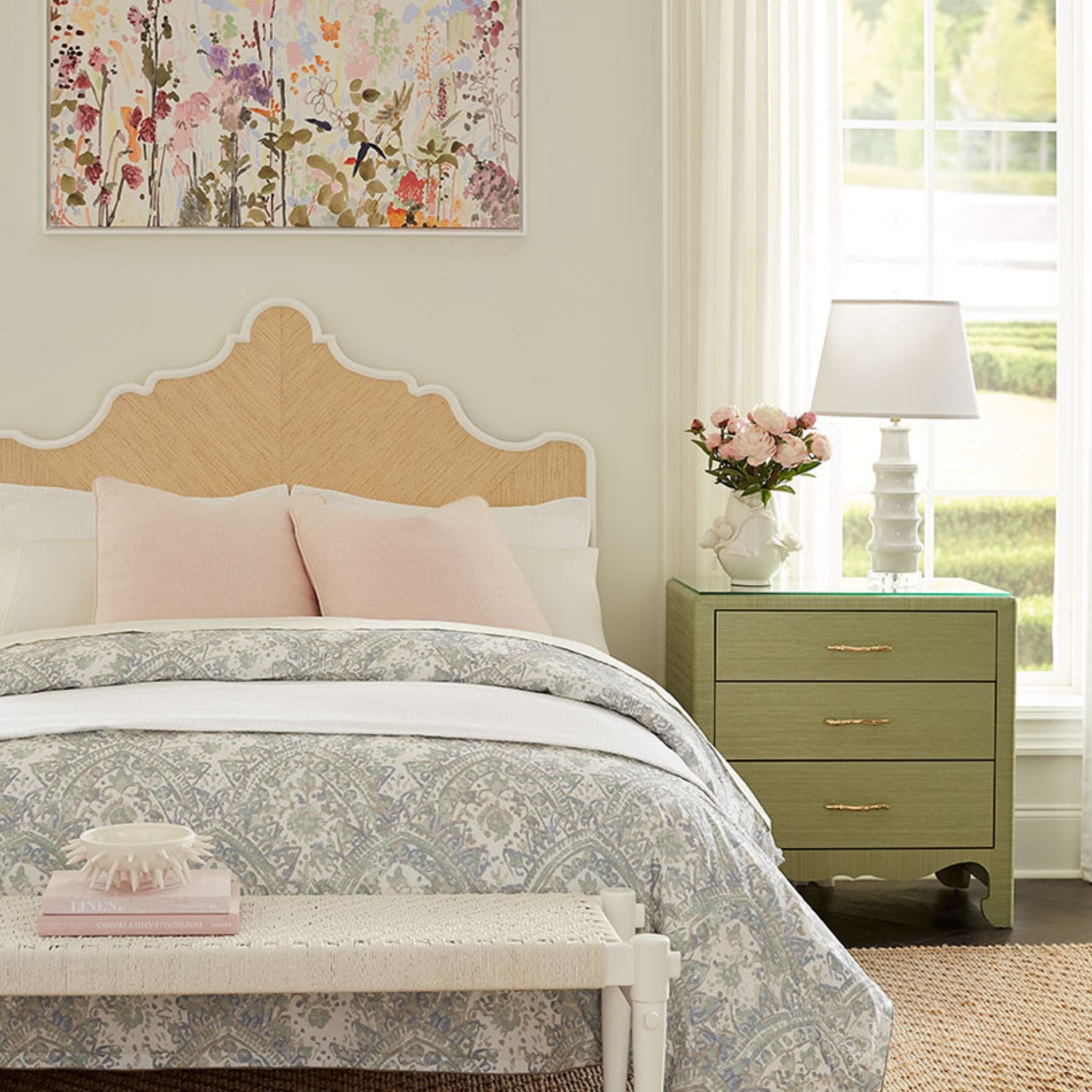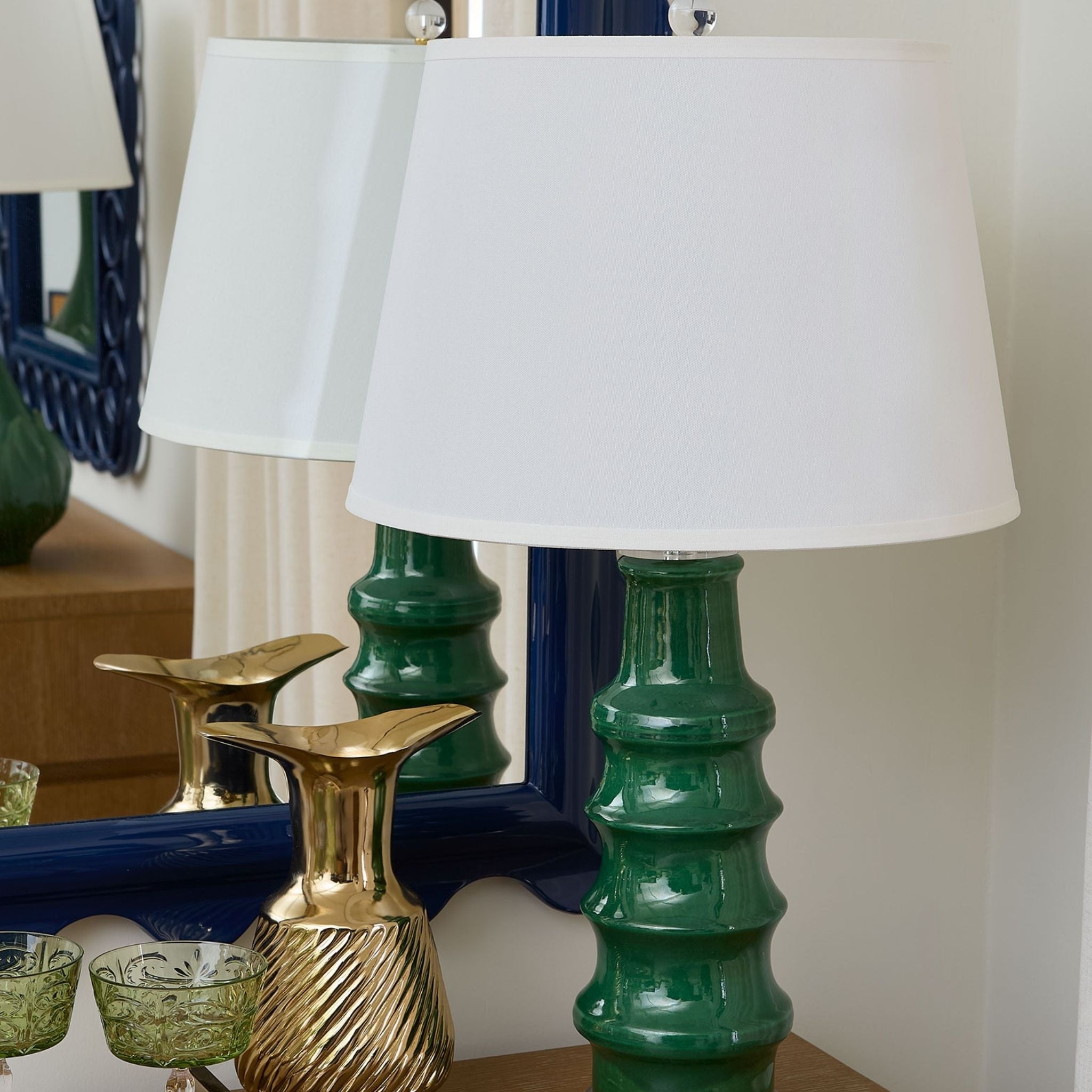 The Jesse Lamp features a bamboo-inspired ceramic silhouette with a subtly varied glaze, adding depth and artisanal character to any space. Finished with a clear acrylic base and white linen shade, it blends traditional inspiration with modern elegance.
