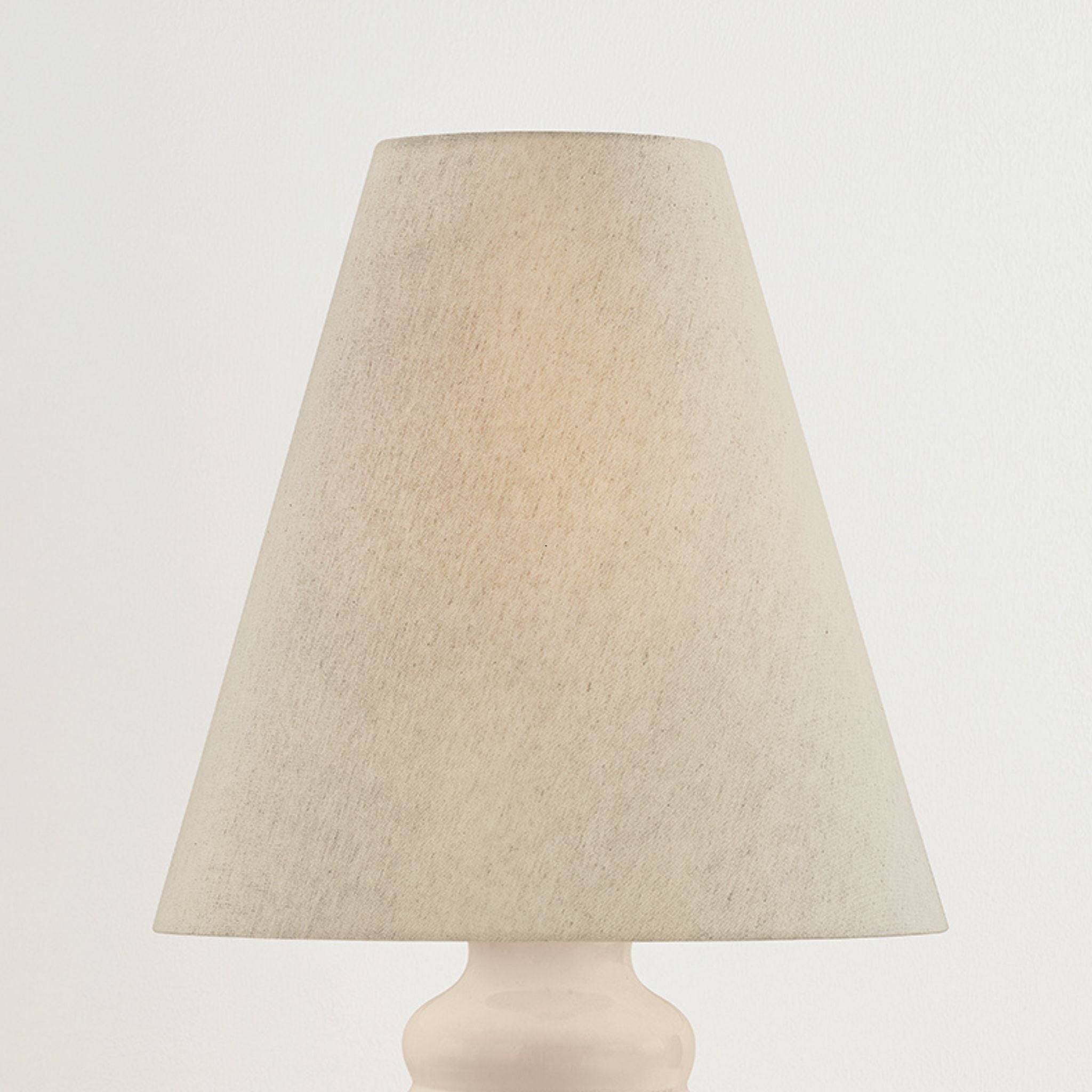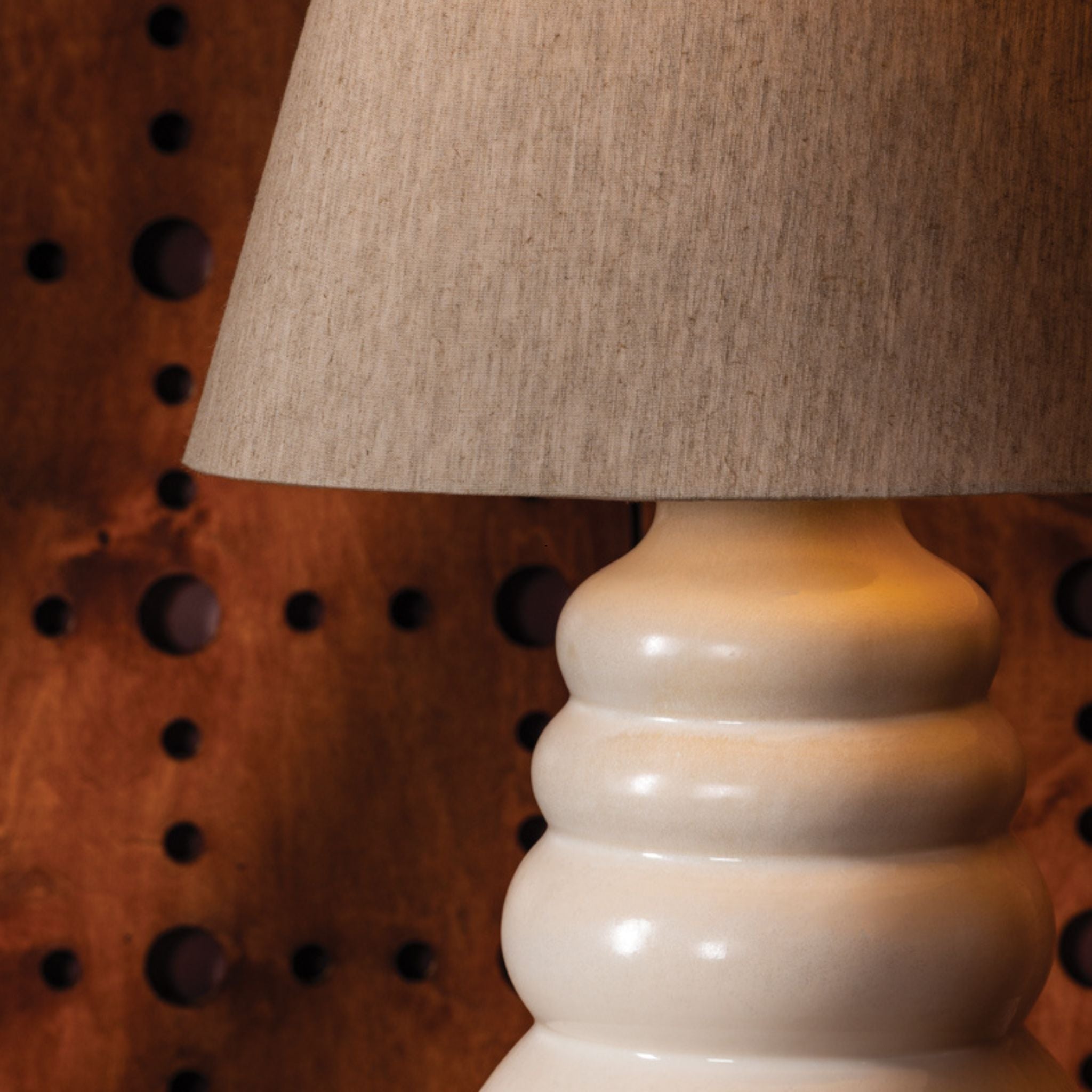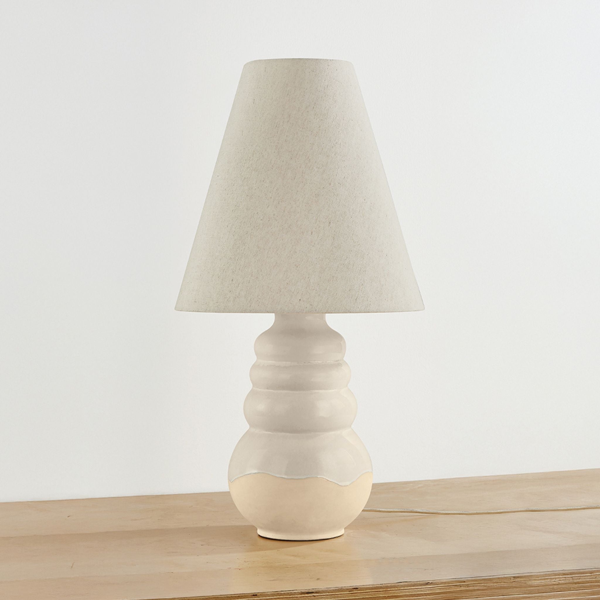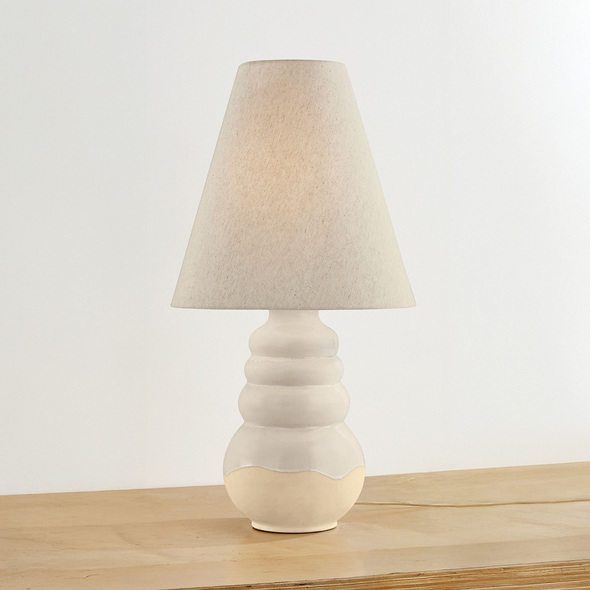 Pairing an oversized natural linen shade with a funky ceramic base, the Tybee table lamp feels peppy and offbeat, though still refined. The unique Elemental White Ceramic glaze has an organic dripping effect that lends an artisanal note to the base. Tybee’s joyful, handcrafted aesthetic dresses up a space as it creates an effortless focal point. Finished with Aged Brass hardware.