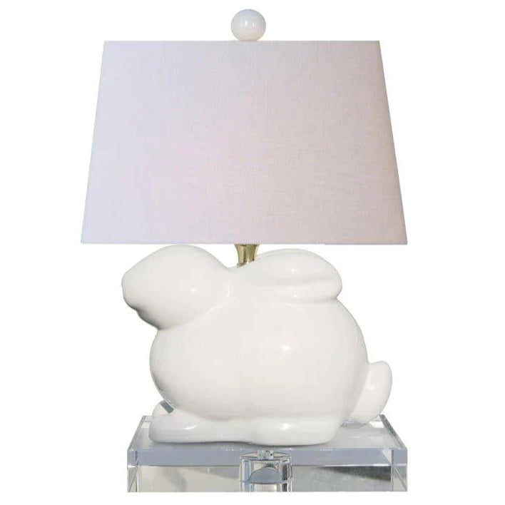 This adorable porcelain table lamp features a whimsical white bunny with a crystal base a white shade. The lamp measures 11"W X 15"H, the lamp base measures 5.5" X 7.5" and the shade measures 11" in diameter. The lamp takes a single 40-watt max bulb.Shade and color variations are intrinsic to the beauty of handmade items and are not a product defect. Each product is unique, and the product photo shown represents one, but colors can vary. Click on image for greater detail.