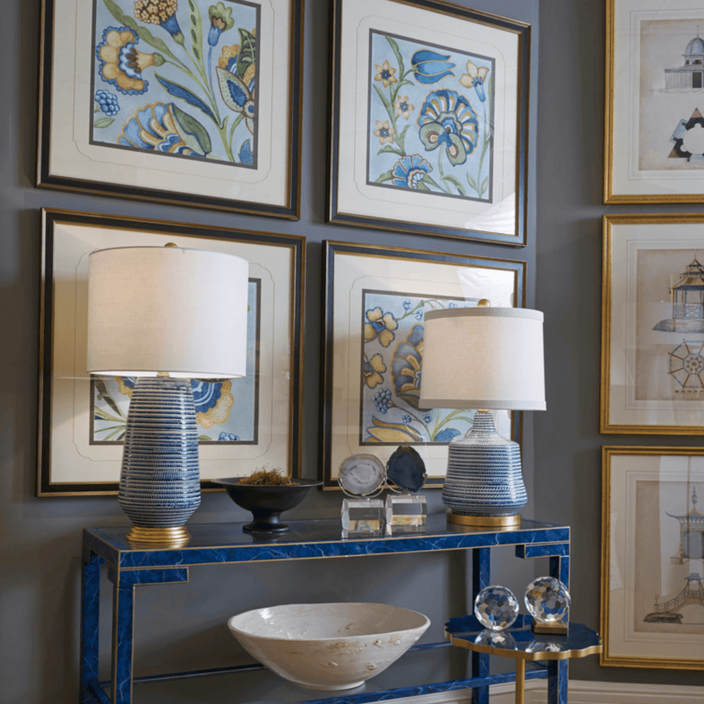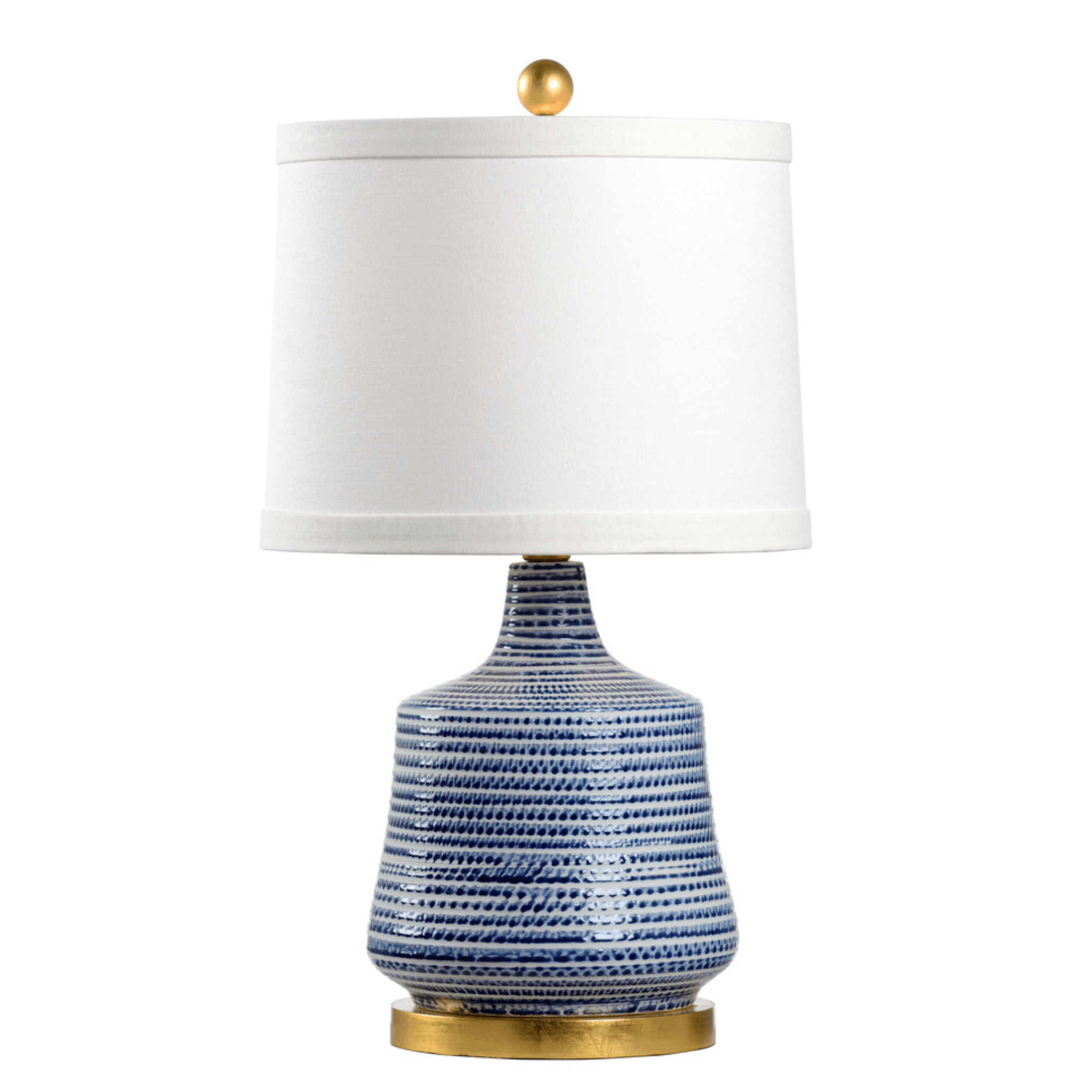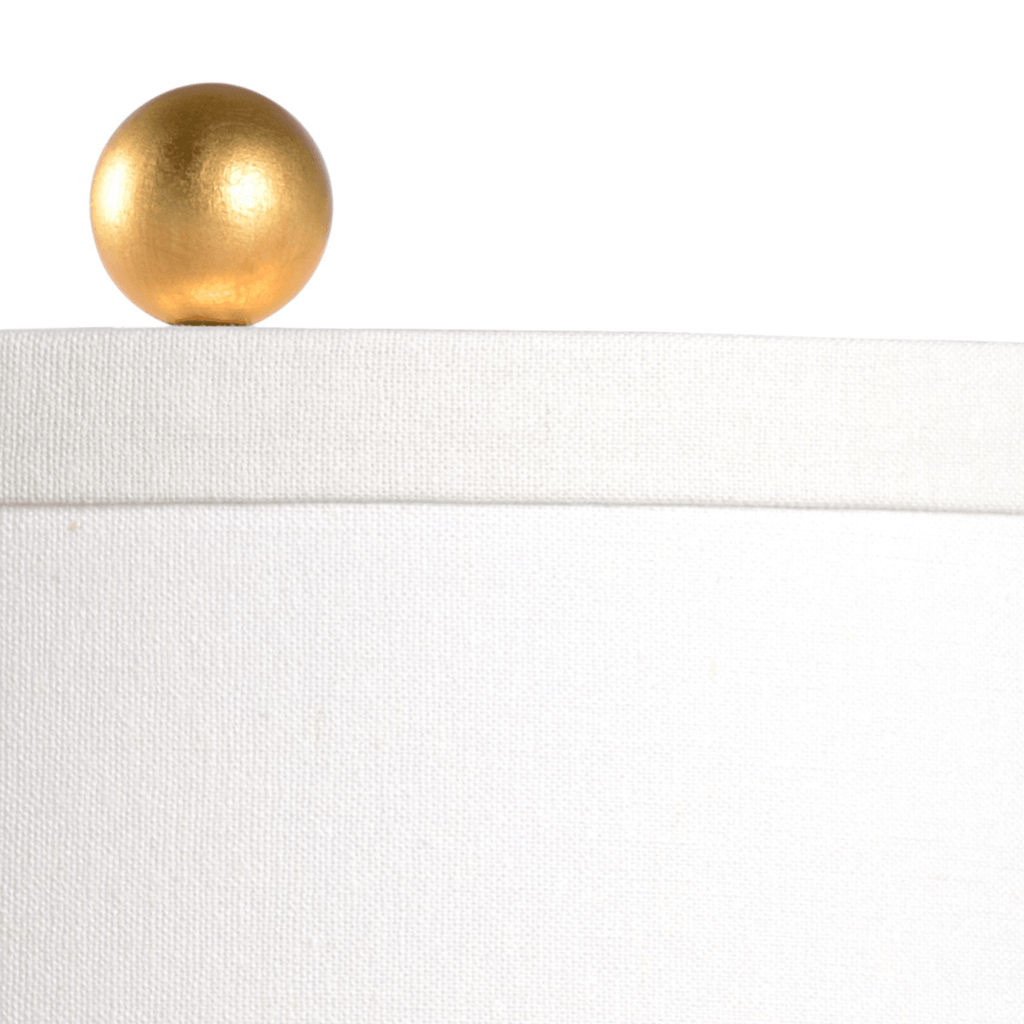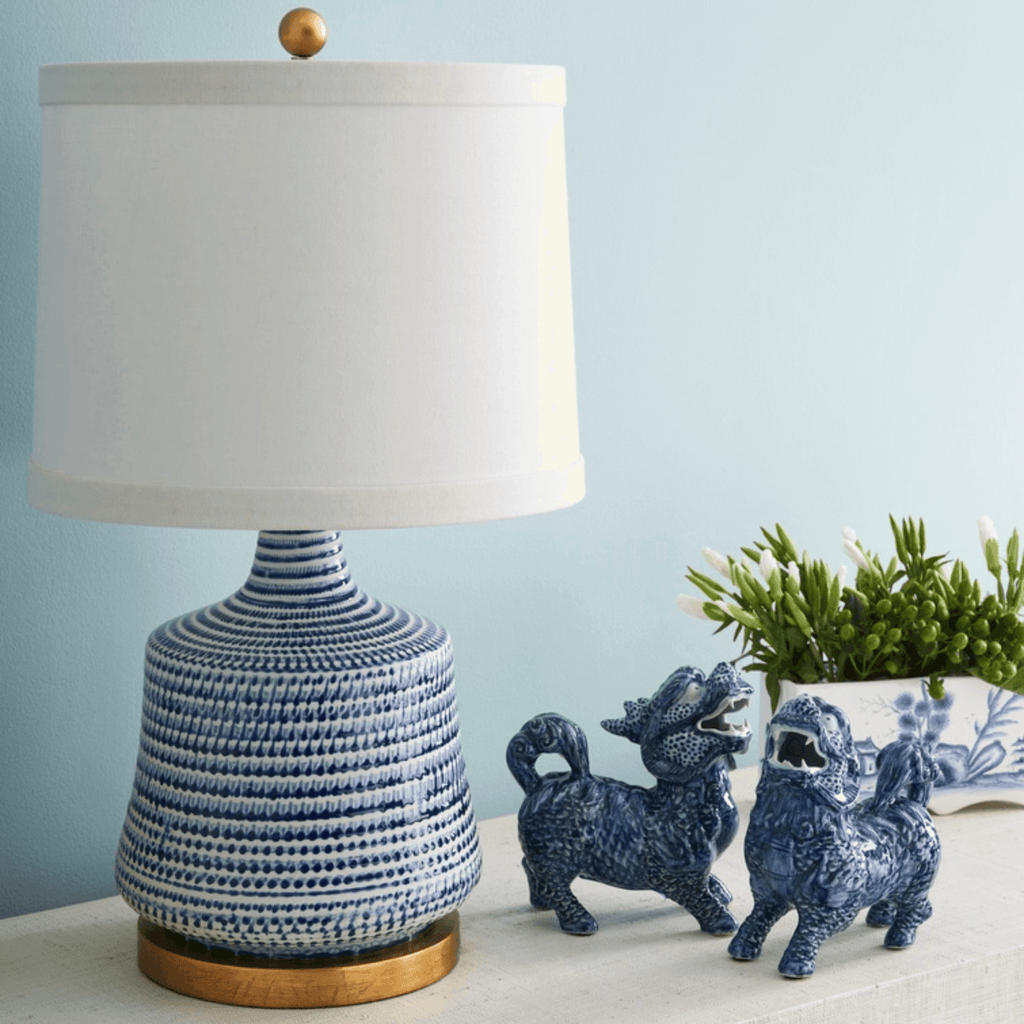 Blue and white is always in style! This fabulous table lamp features an antique gold leaf base and an off white linen shade.