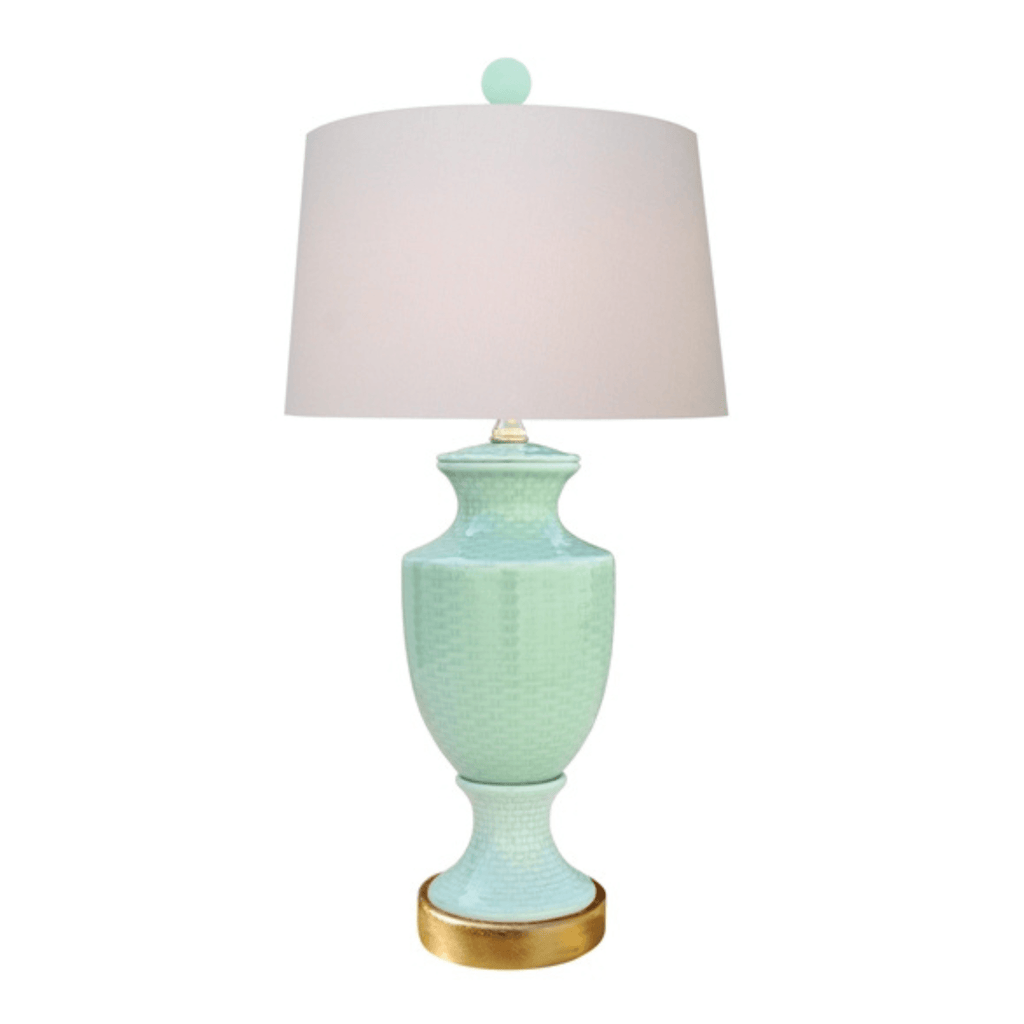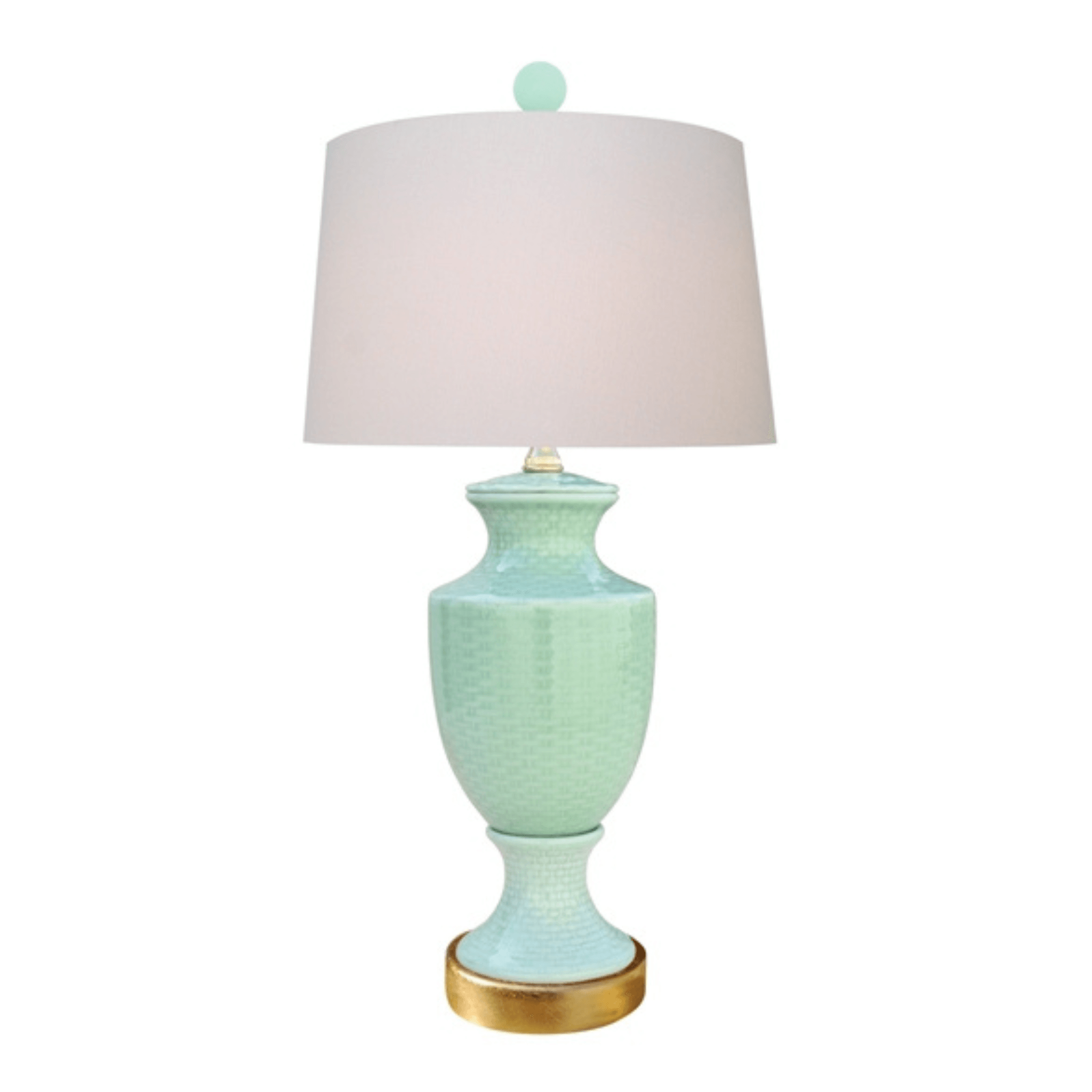 This lovely porcelain table lamp features a celadon finish and is topped off with a white drum shade and finial. The lamp measures 14"W X 24"H. Lamp body height is 17.5". The shade is white with a hand rolled edge. The lamp features a three-way socket and takes a 150-watt max bulb.Shade and color variations are intrinsic to the beauty of handmade items and are not a product defect. Each product is unique, and the product photo shown represents one, but colors can vary. Click on image for greater detail.