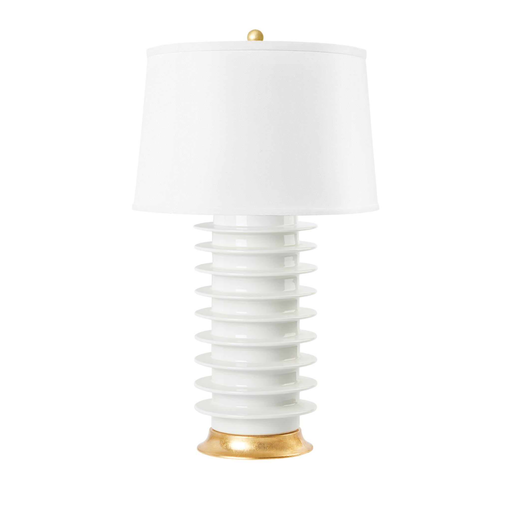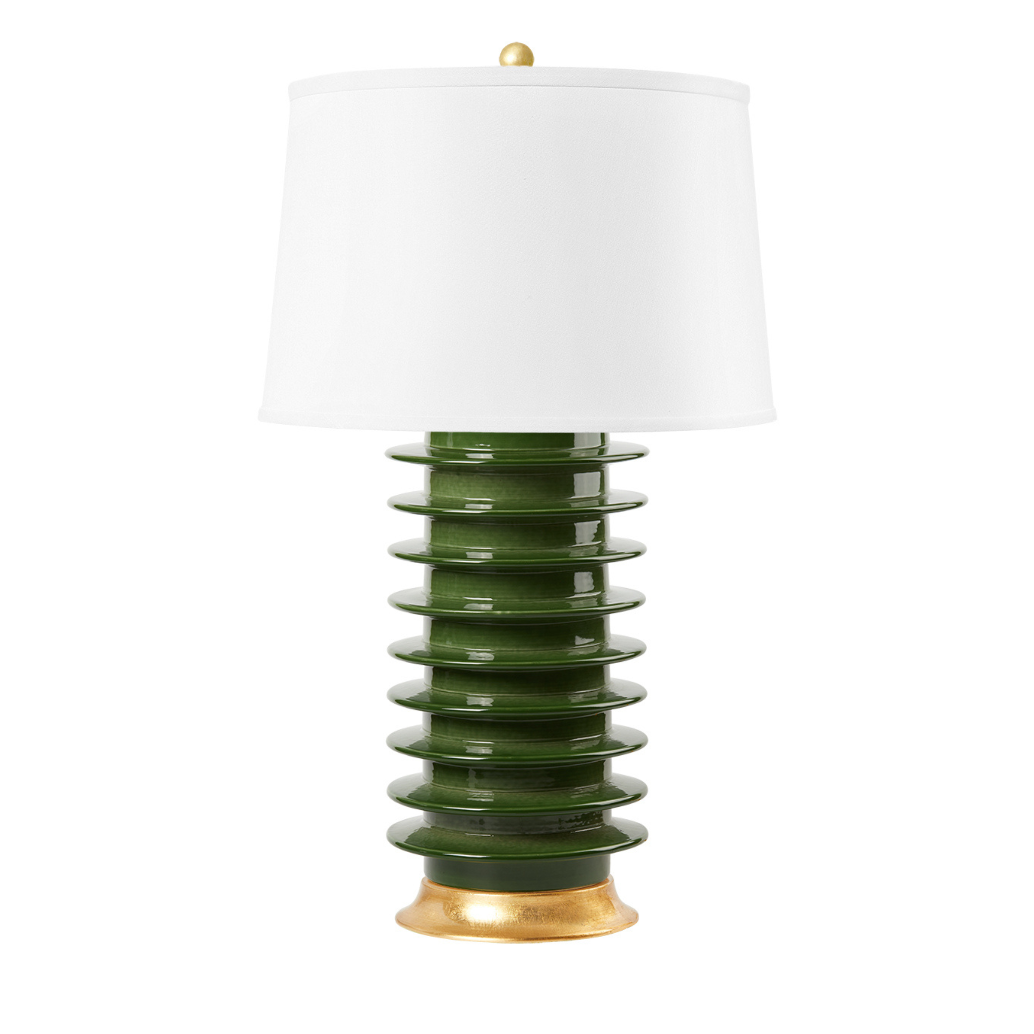 The Elektra Lamp Collection is a knockout. This modern industrial silhouette meets traditional style in richly saturated glazed porcelain finished with a hand gold-leafed base and ball finial. Geometric in all the right ways, the Elektra Lamp makes a bold statement in any living room.