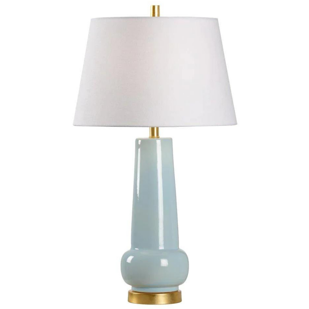 This lamp features a transitional design that blends effortlessly in any space. A robin's egg blue glaze is applied to a modern gourd shaped ceramic vase that sits atop a warm gold leaf steel base. An off white linen shade adds elegance and provides direction for the opulent light to shine throughout the room. Overall Dimensions: 31"h x 7"w x 7"d. Click on images for greater detail.