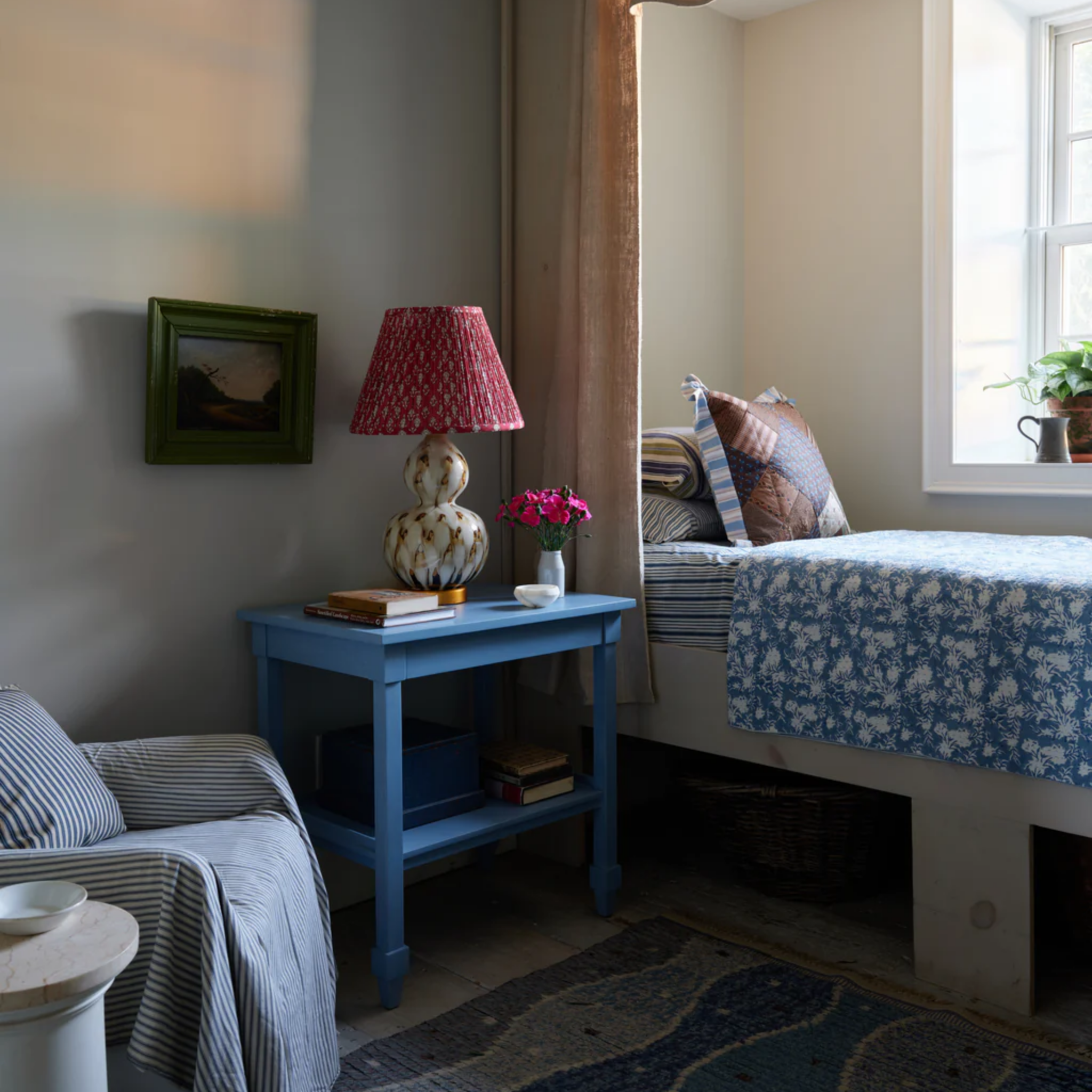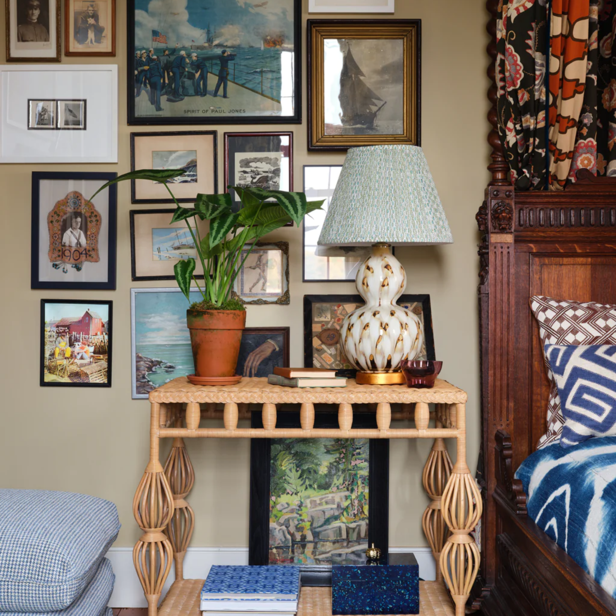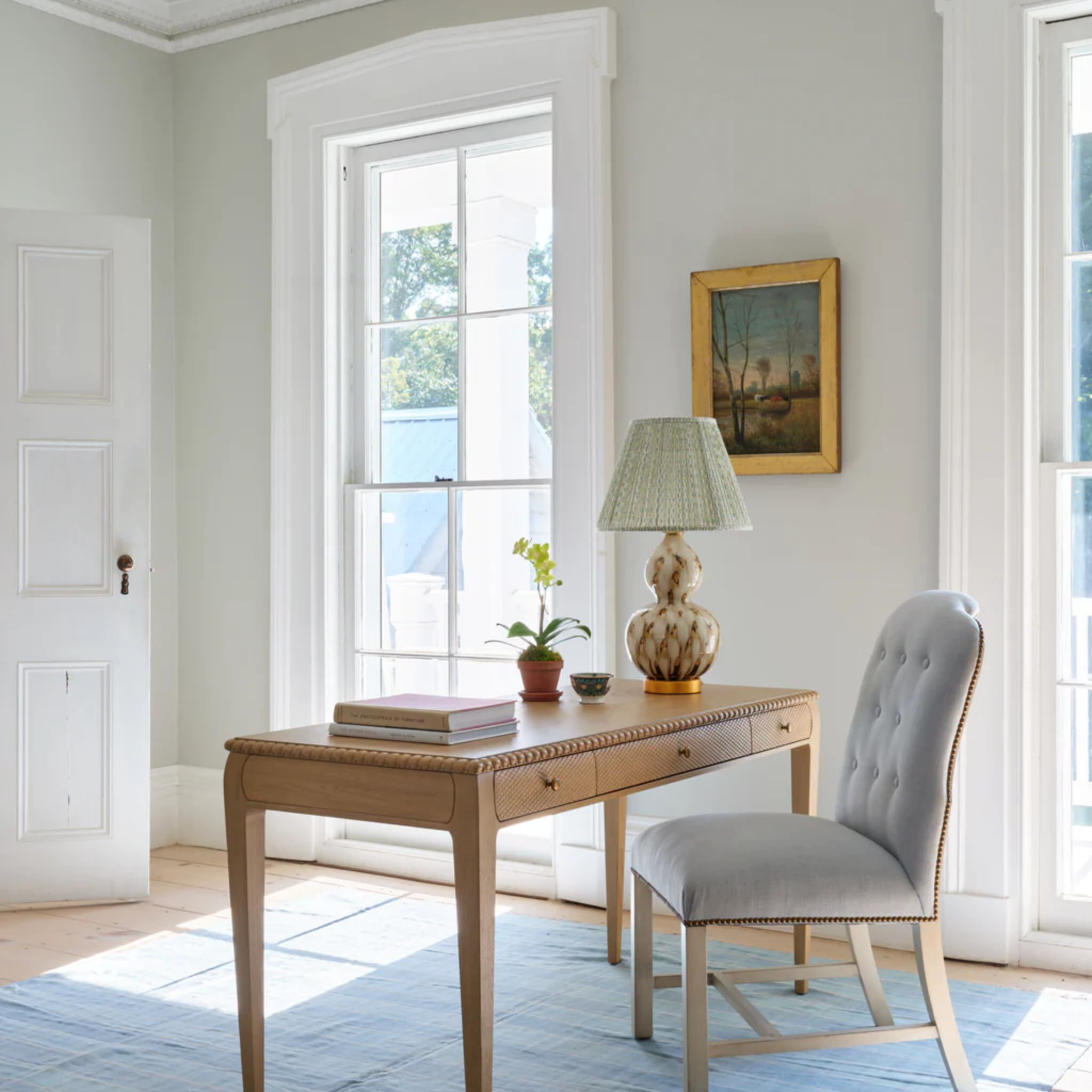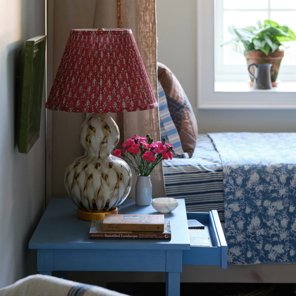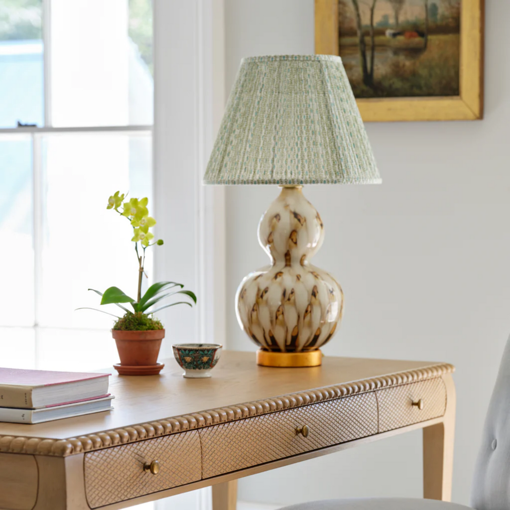This lamp is inspired by the traditional sancai or tri-colored glaze technique, where colors often mix together. Features an elegant gourd shape, with a gold base. The pheasant feather lamp adds a graceful, subdued ambiance to any side table. The lamp’s ceramic vase is hand-painted before a final glazing and firing. Click images for greater detail.