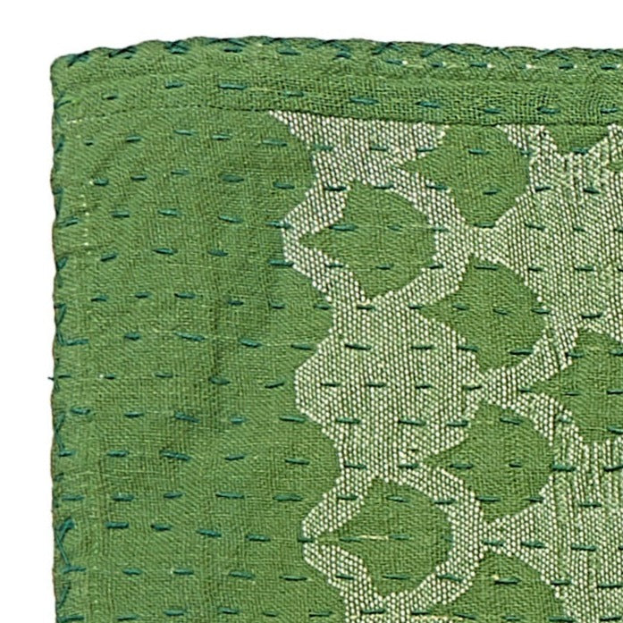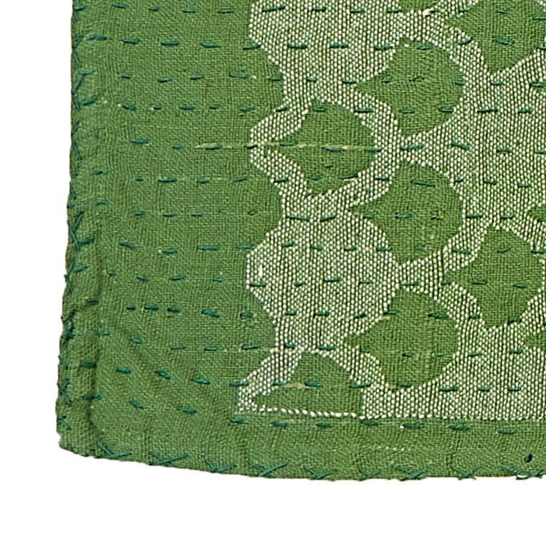 Let this inviting runner welcome you and your dinner party to a beautiful table, whether you are dining indoors or al fresco. Gorgeous color, contemporary pattern, and the evidence of artisan’s hand combine to make this a conversation piece that feels special, fresh, and elegant. Green stitching runs across the hand-loomed green ginkgo pattern. Lined with natural color linen.