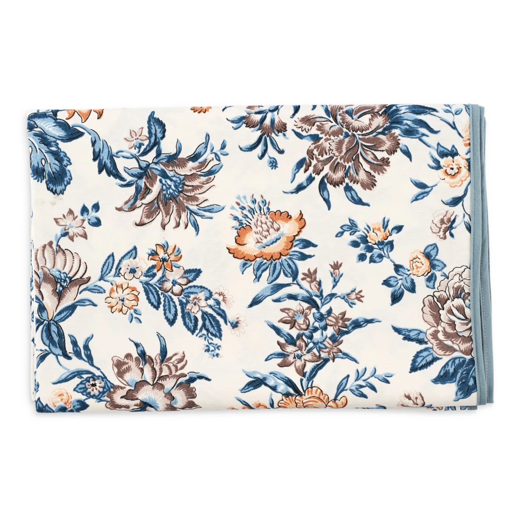 This gorgeous floral table cloth features grey-blue trim. Get your table ready for fall. This item is final sale and is not eligible for return. Click images for greater detail.