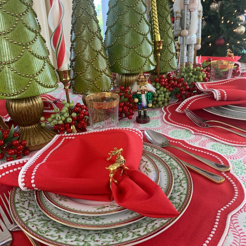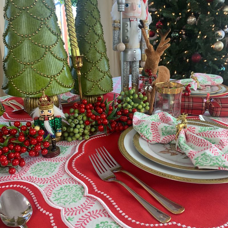 Enjoy grand holiday vines. An array of delicately printed red and green motifs creates a classic design that delights. This print will have you ready for Christmas-time entertaining.