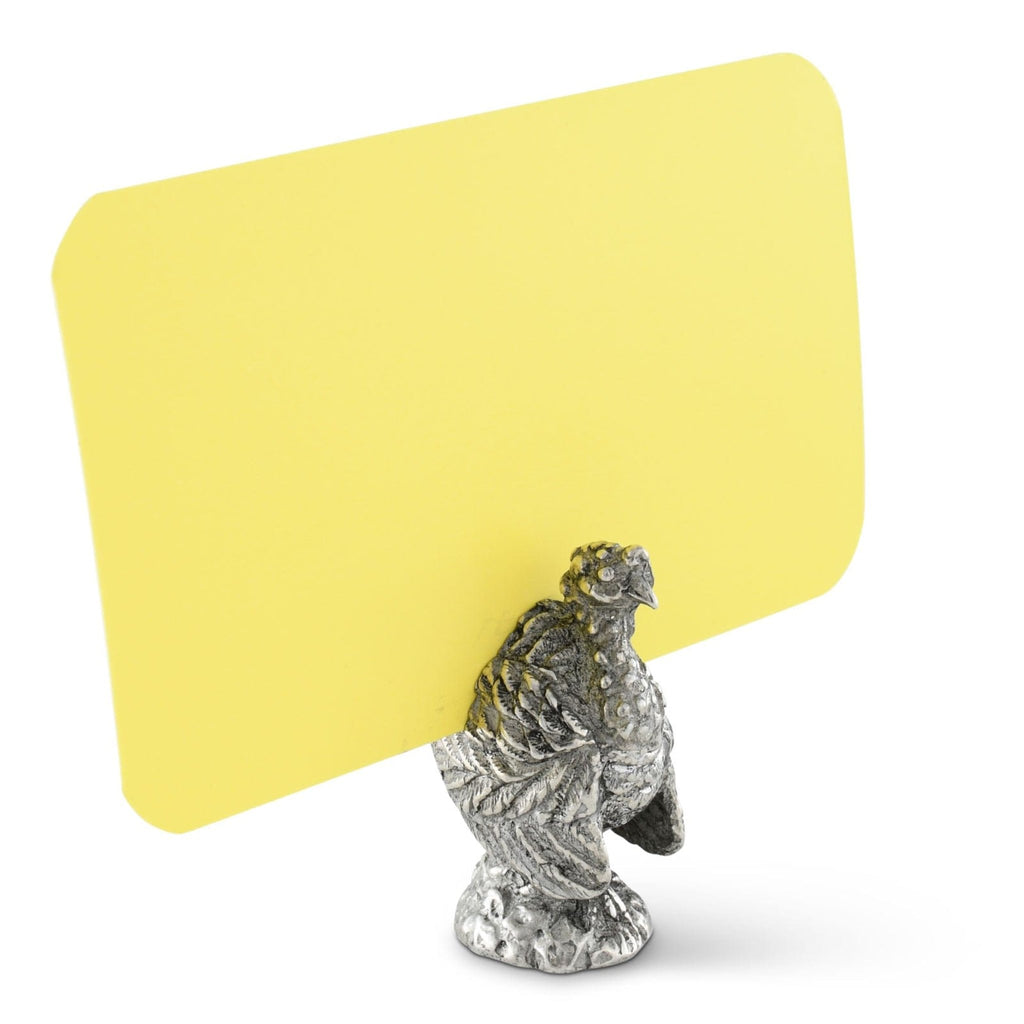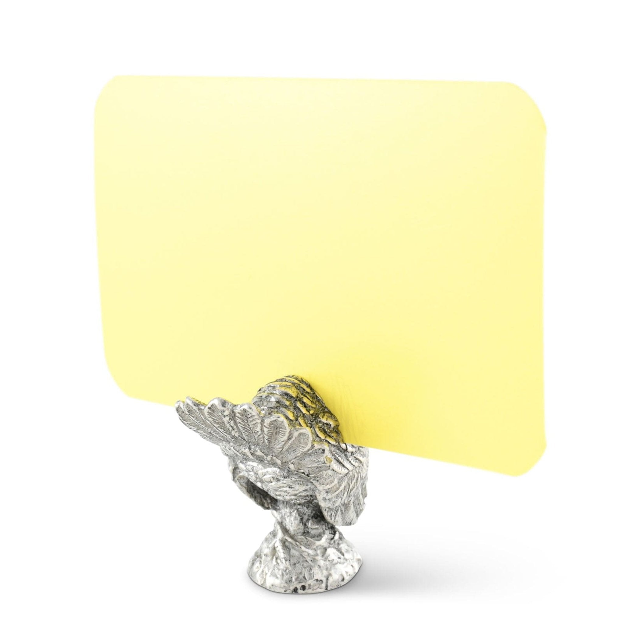 Complement your Harvest Collection with this exquisite Turkey Place Card Holder from Vagabond House. Crafted in luxury-grade pewter, our turkey features intricate feathers, large wings and realistic claws. Standing nearly two inches tall, the statuette holds cards in the opening just in front of its decorative tail.