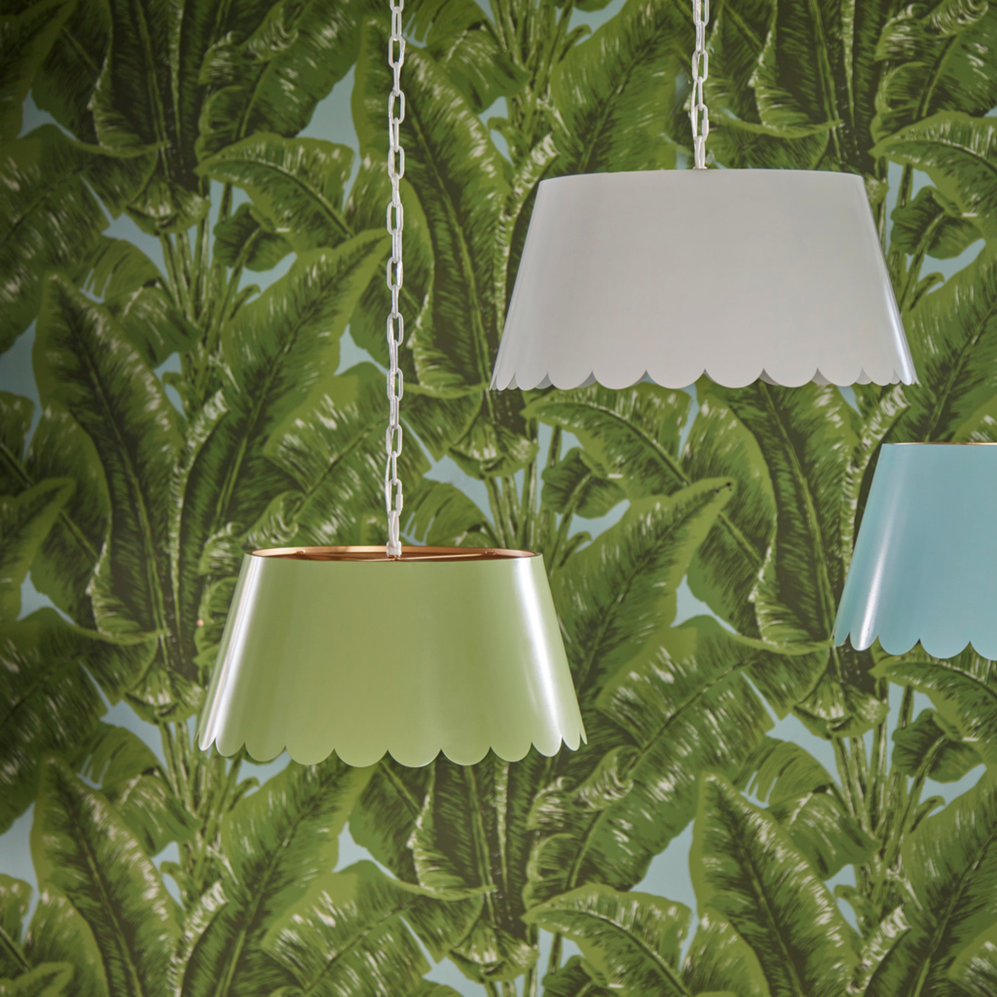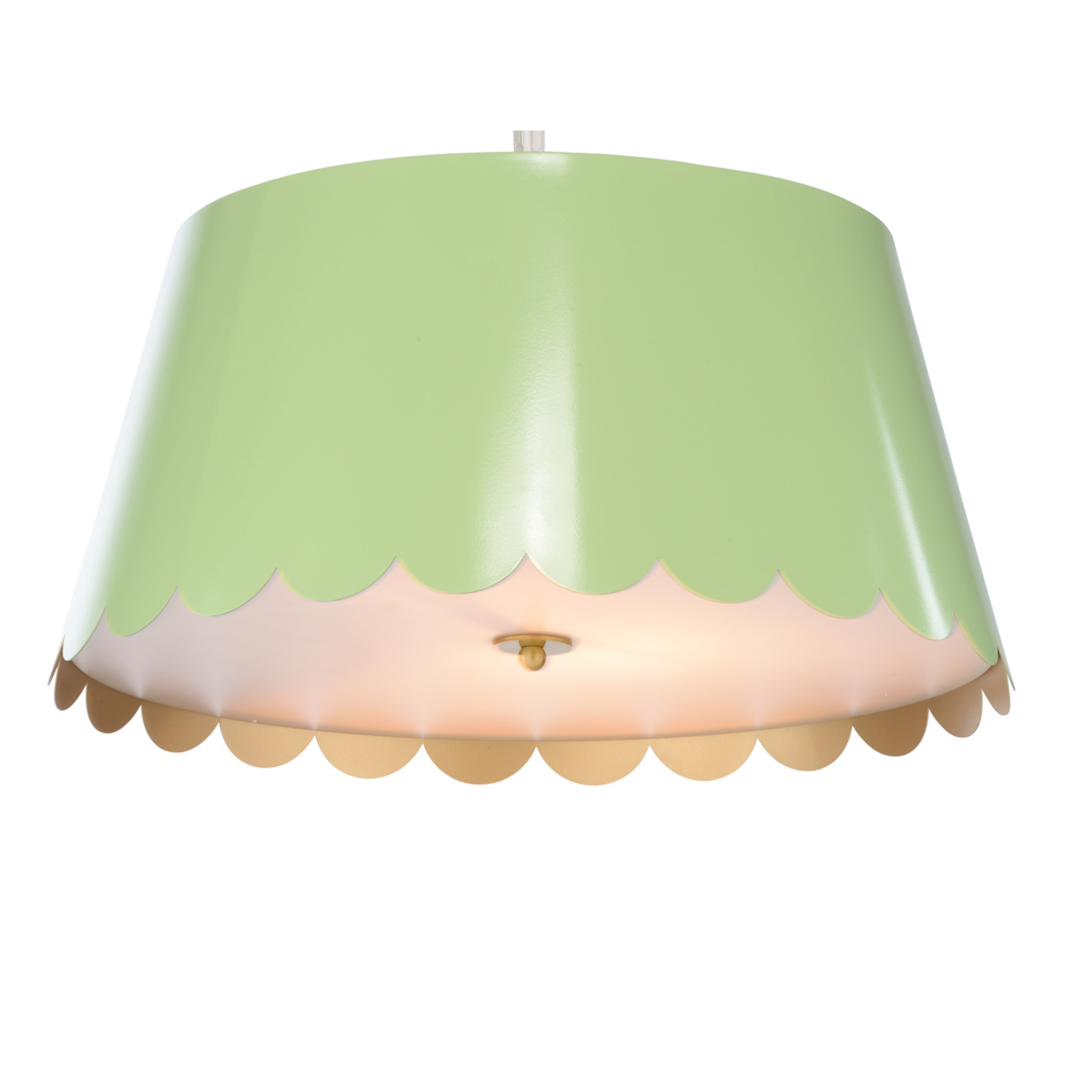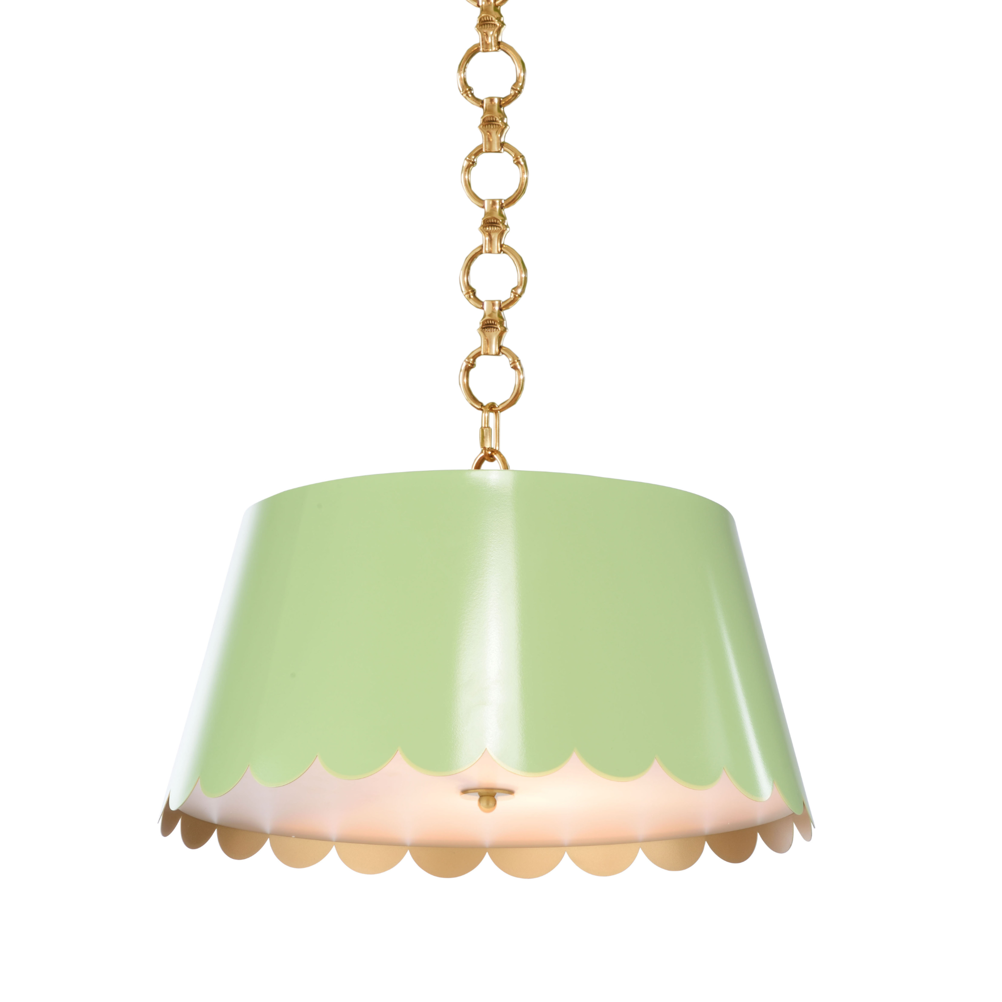 Designed by Meg Braff Designs, this sleek pendant features a playful scalloped detailing suspended from a white chain. (Inside of shade is gold). Mirasol Pendant will add a fun pop of color to a child's room, a breakfast nook or a small foyer. Comes with a 5" canopy and 6' of chain.