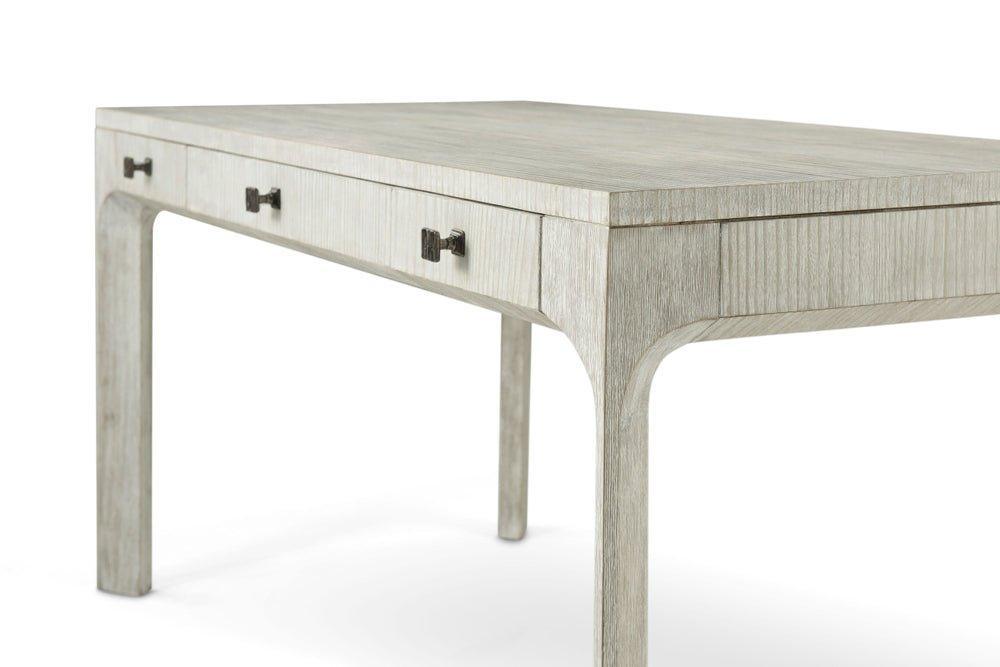 Handcrafted wire-brushed cerused pine in a light and subdued Sea Salt finish, the Breeze Desk displays three functional drawers with organic ribbed metal knobs in our Dark Sterling finish and a beveled shaped cross section.