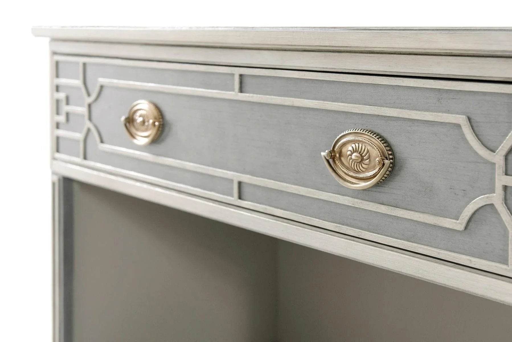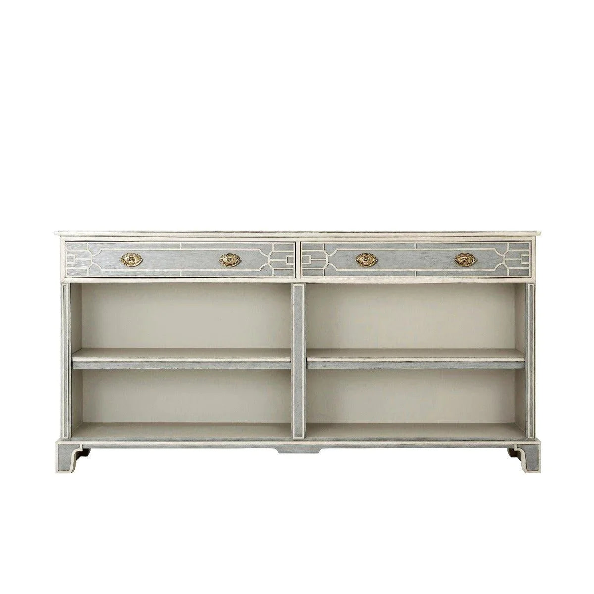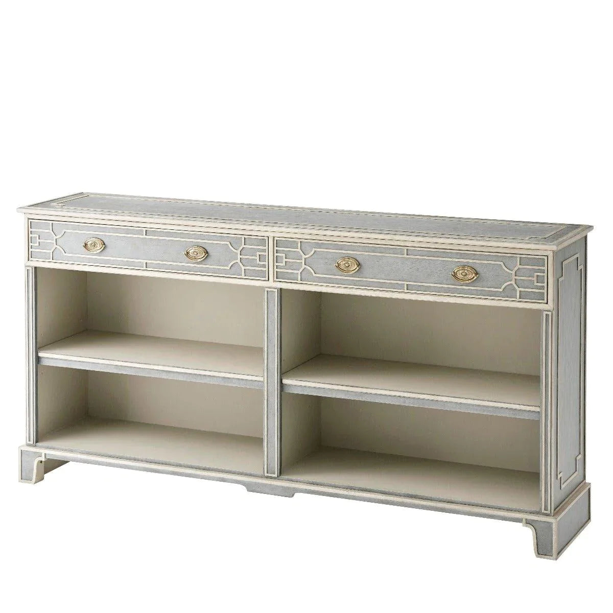 Morning Room Grey Fretwork Low Bookcase Console with Two Drawers