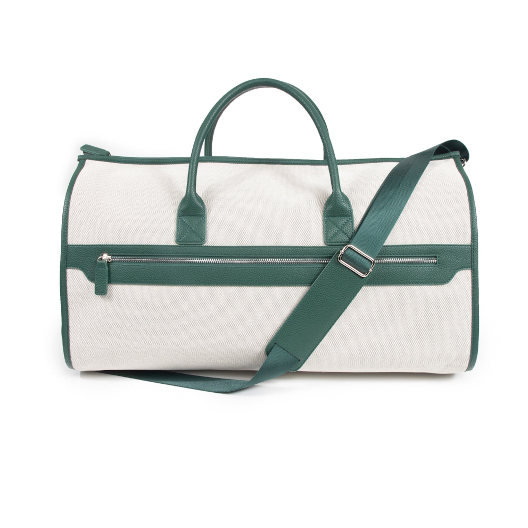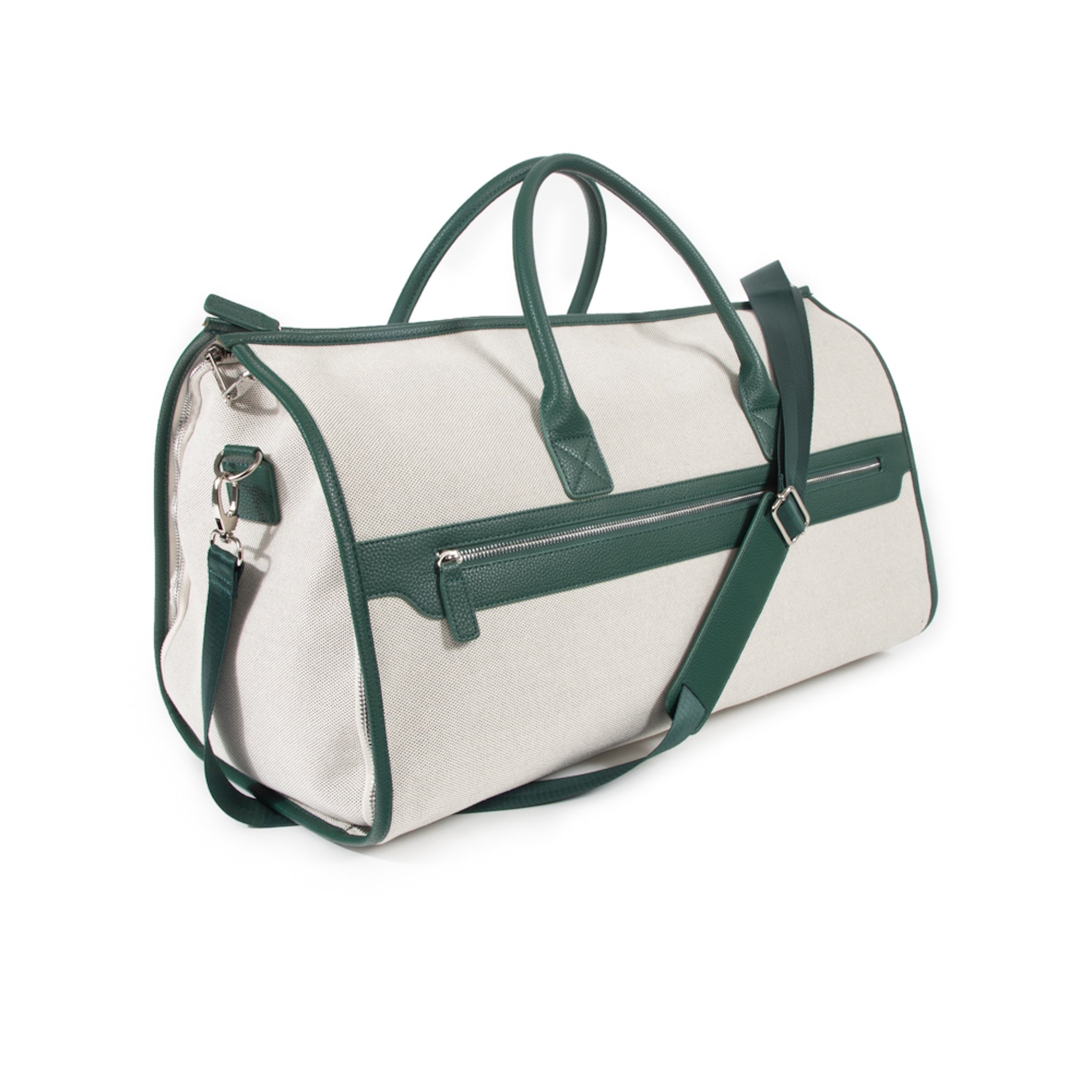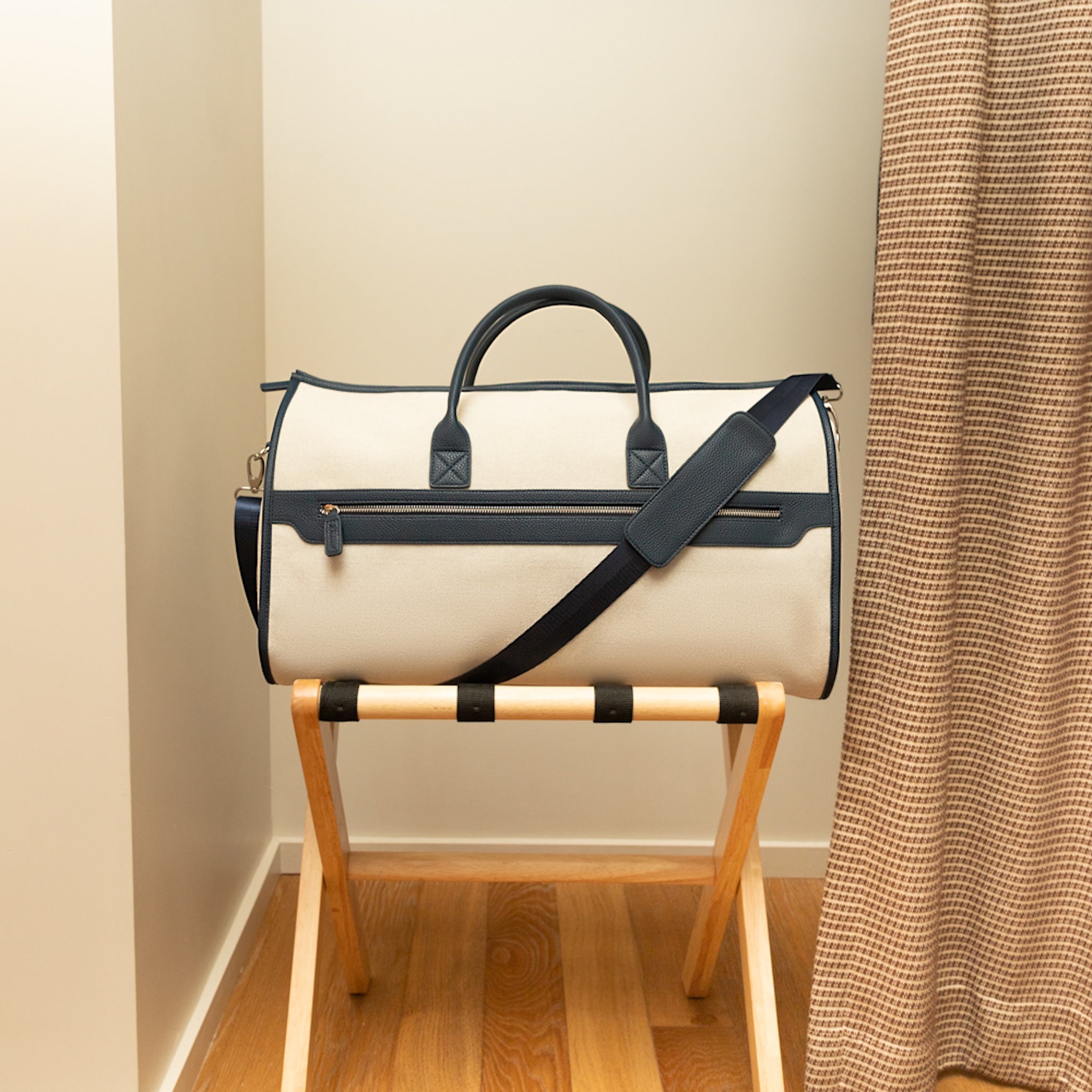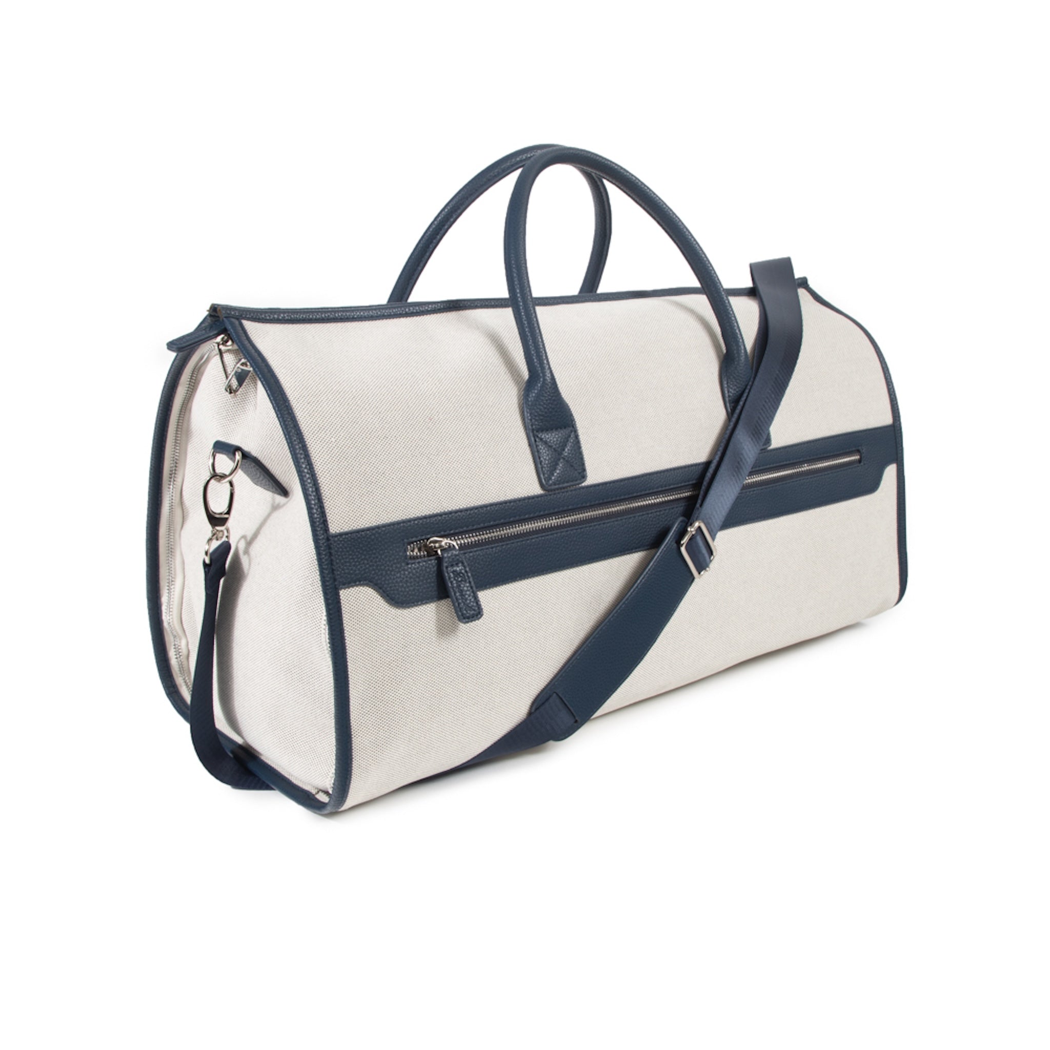 The Capri 2-in-1 garment bag is designed with the business traveler in mind, stylish enough for overnights that include some leisure time. Made from a lightweight canvas and accented with vegan leather. Features a adjustable shoulder strap; outer zipper compartment for quick access and extra interior pockets for quick access of your phone, wallet and keys.