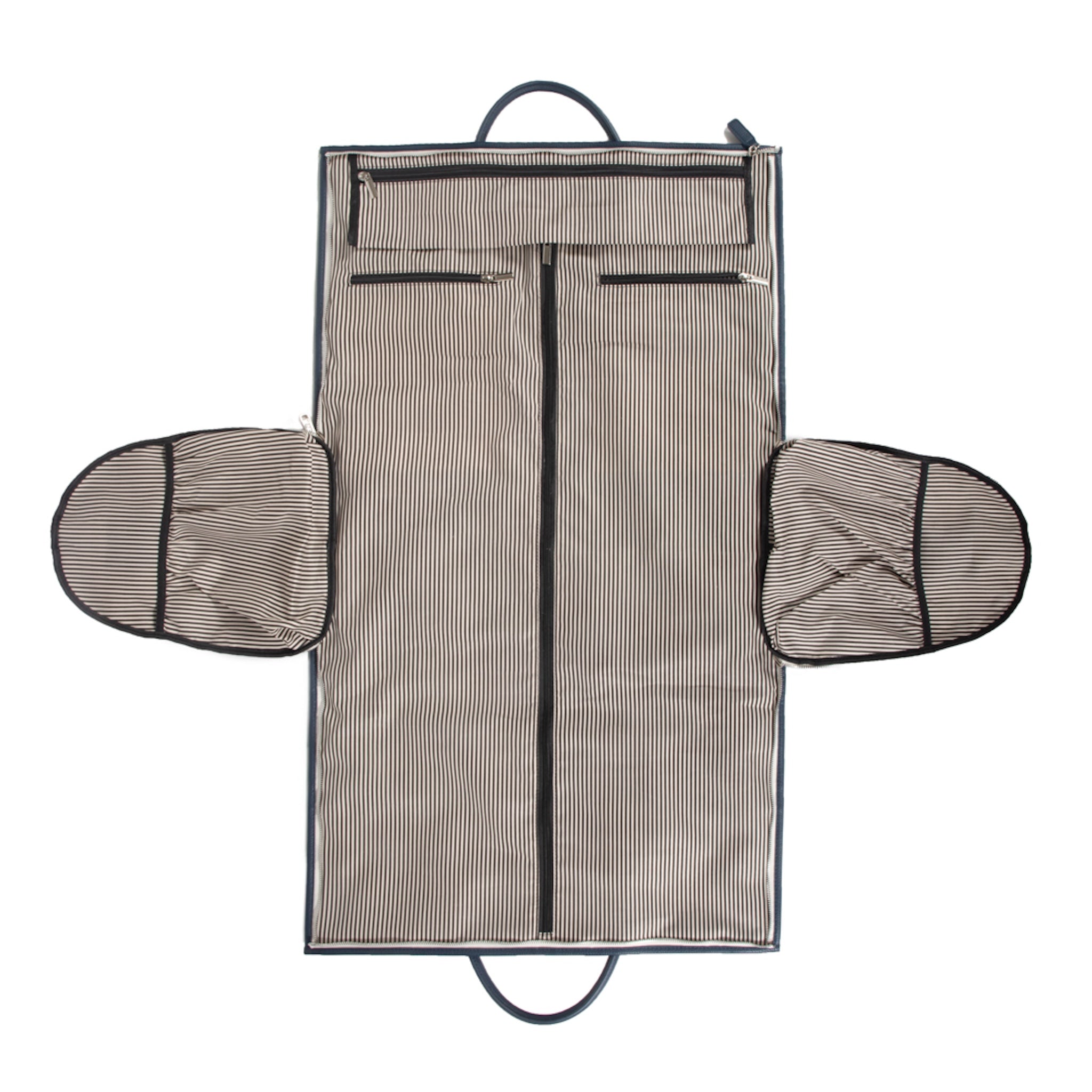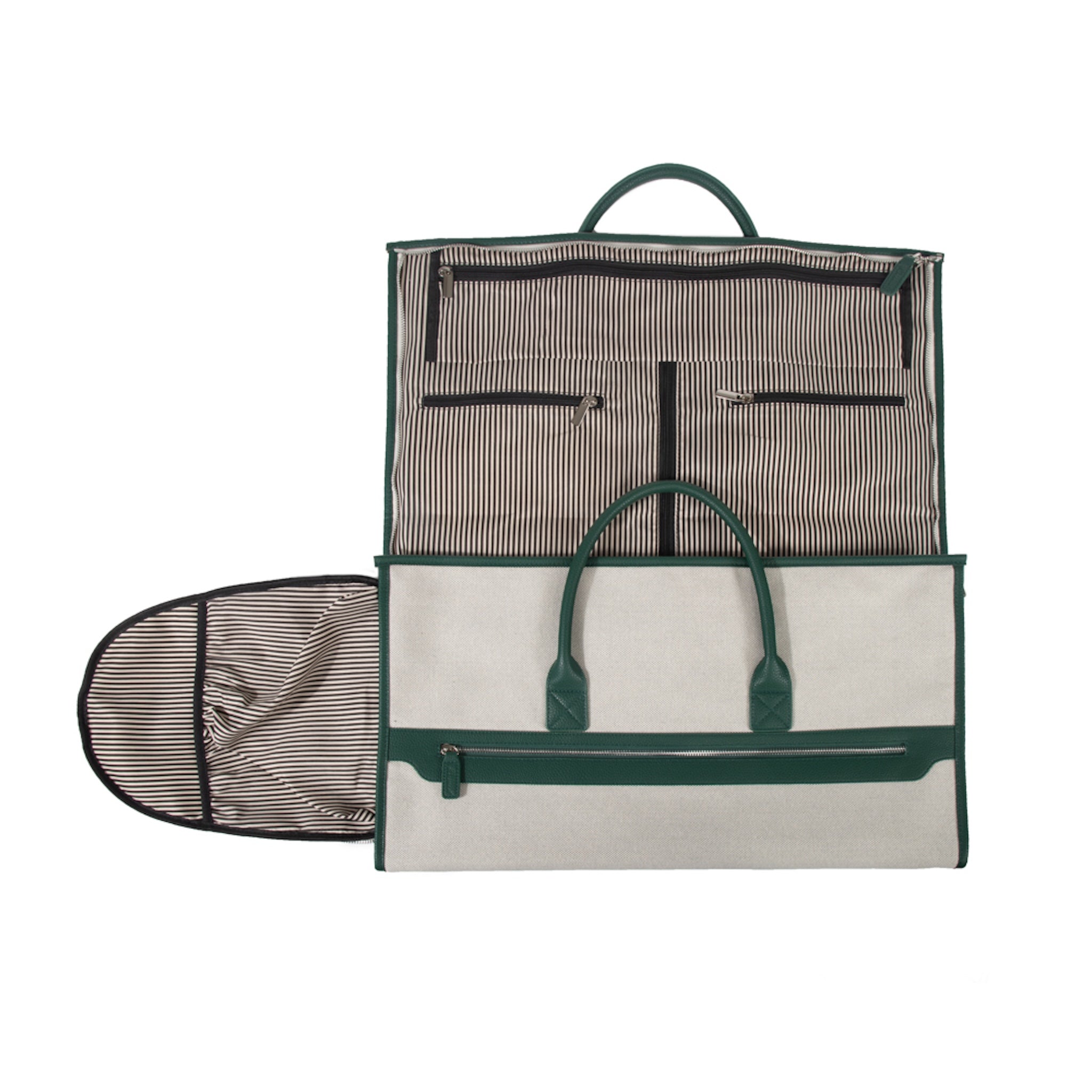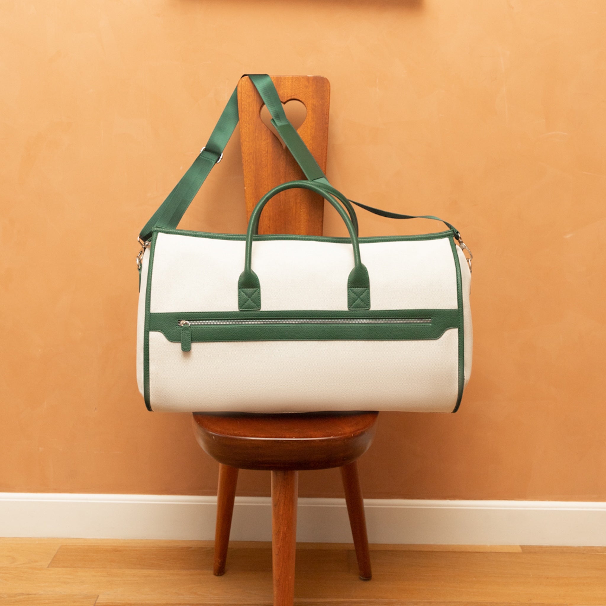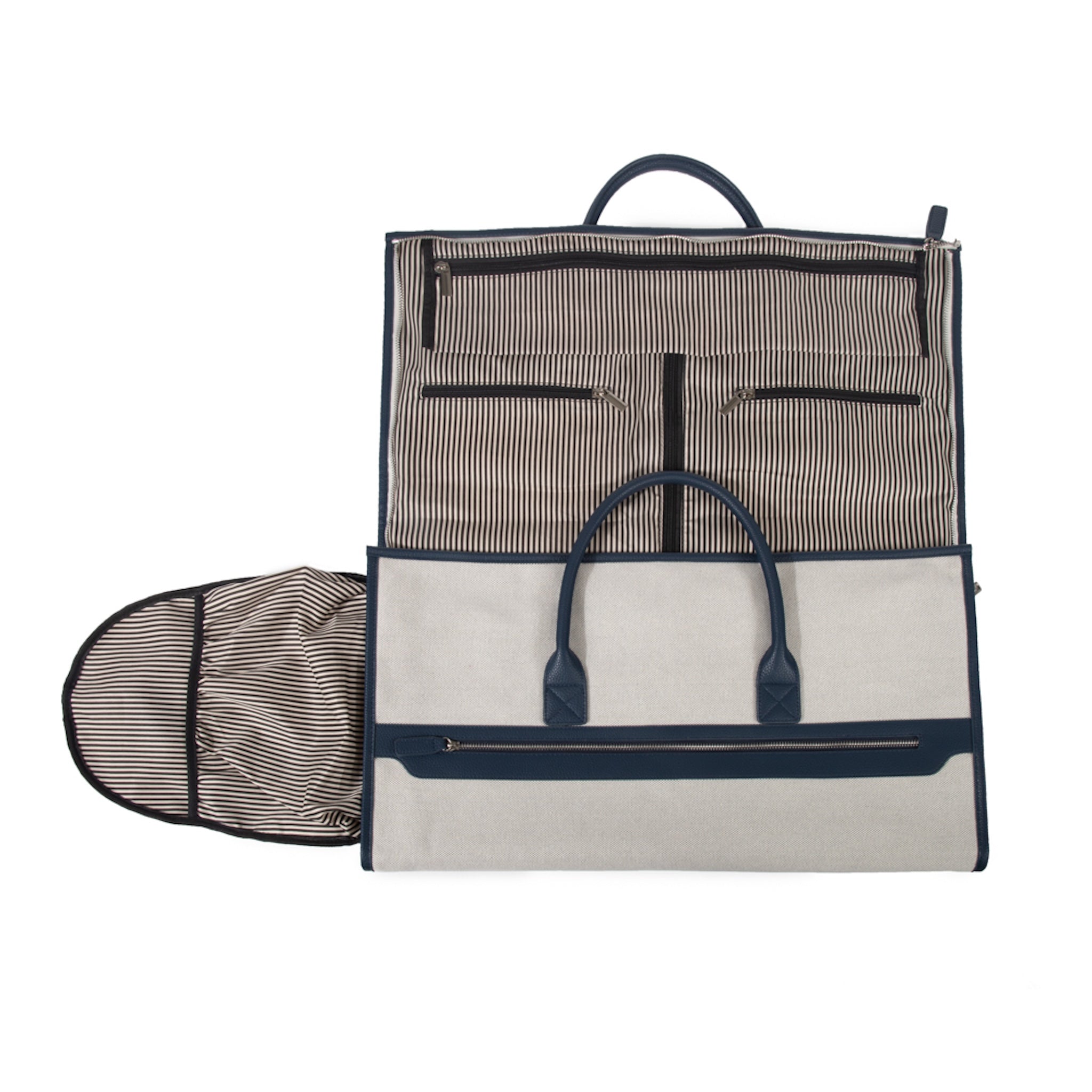 The Capri 2-in-1 garment bag is designed with the business traveler in mind, stylish enough for overnights that include some leisure time. Made from a lightweight canvas and accented with vegan leather. Features a adjustable shoulder strap; outer zipper compartment for quick access and extra interior pockets for quick access of your phone, wallet and keys.