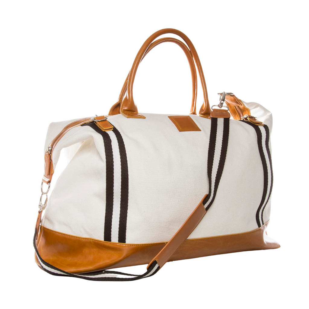 The Great Escape Weekender Bag is the perfect bag for any adventure. Large enough to fit several outfits and small enough to throw in your passenger seat, this cream cotton bag features a long removable strap, leather accents, and satin brown lining.
