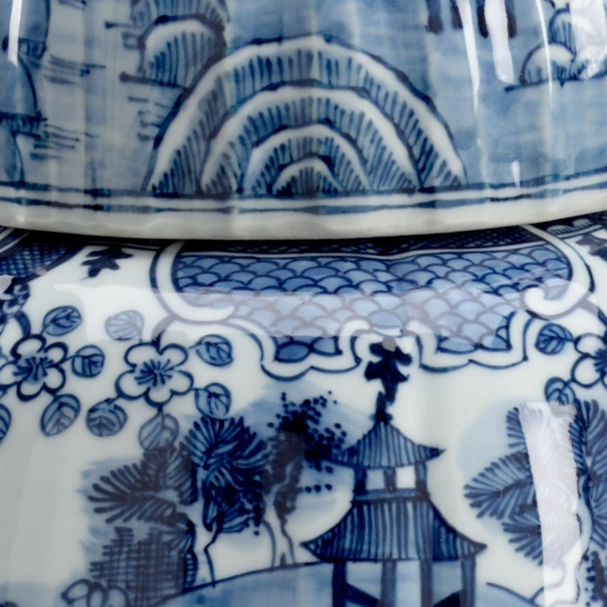 Hand painted porcelain ceramic vase with contemporary dome lid with landscape design. For decorative use only.