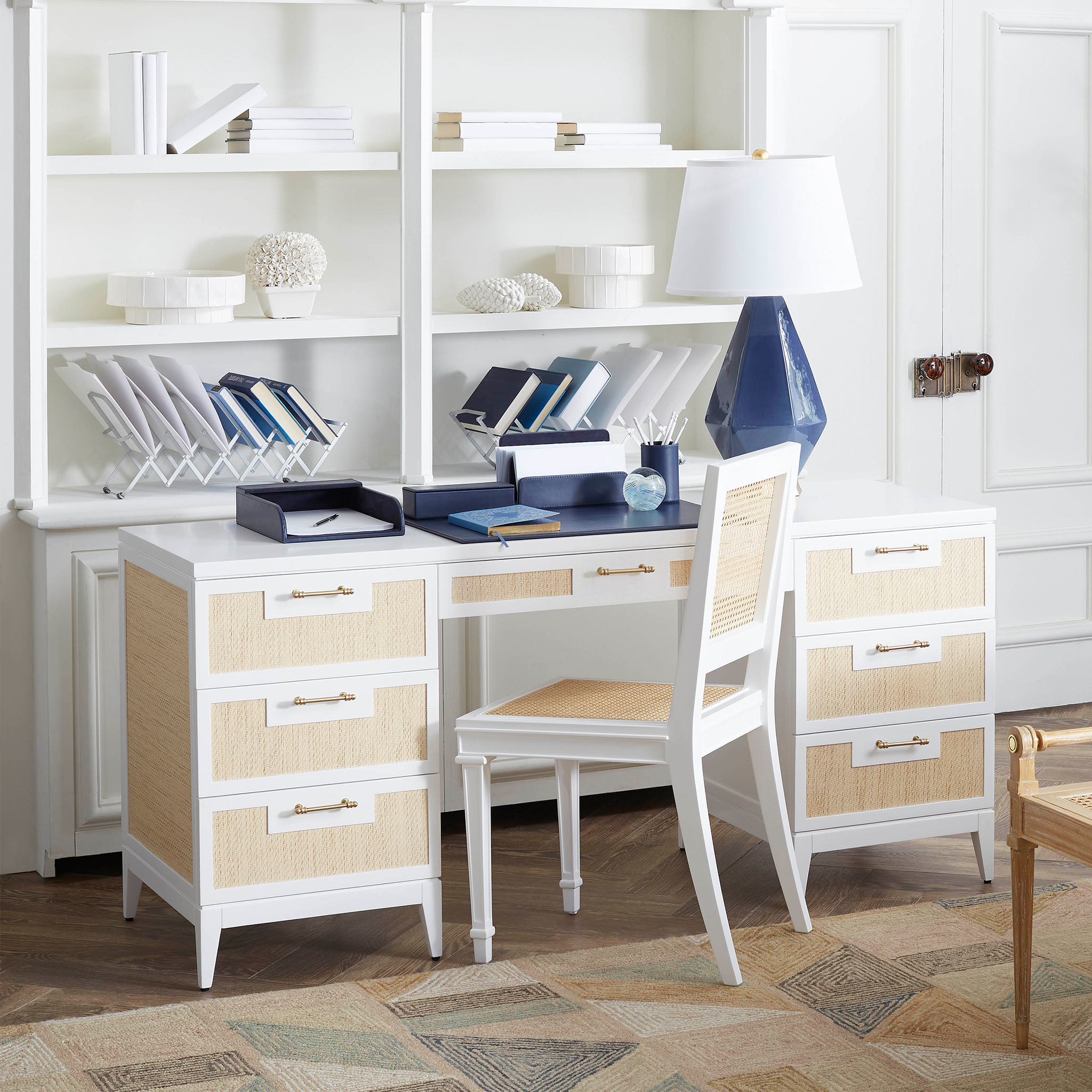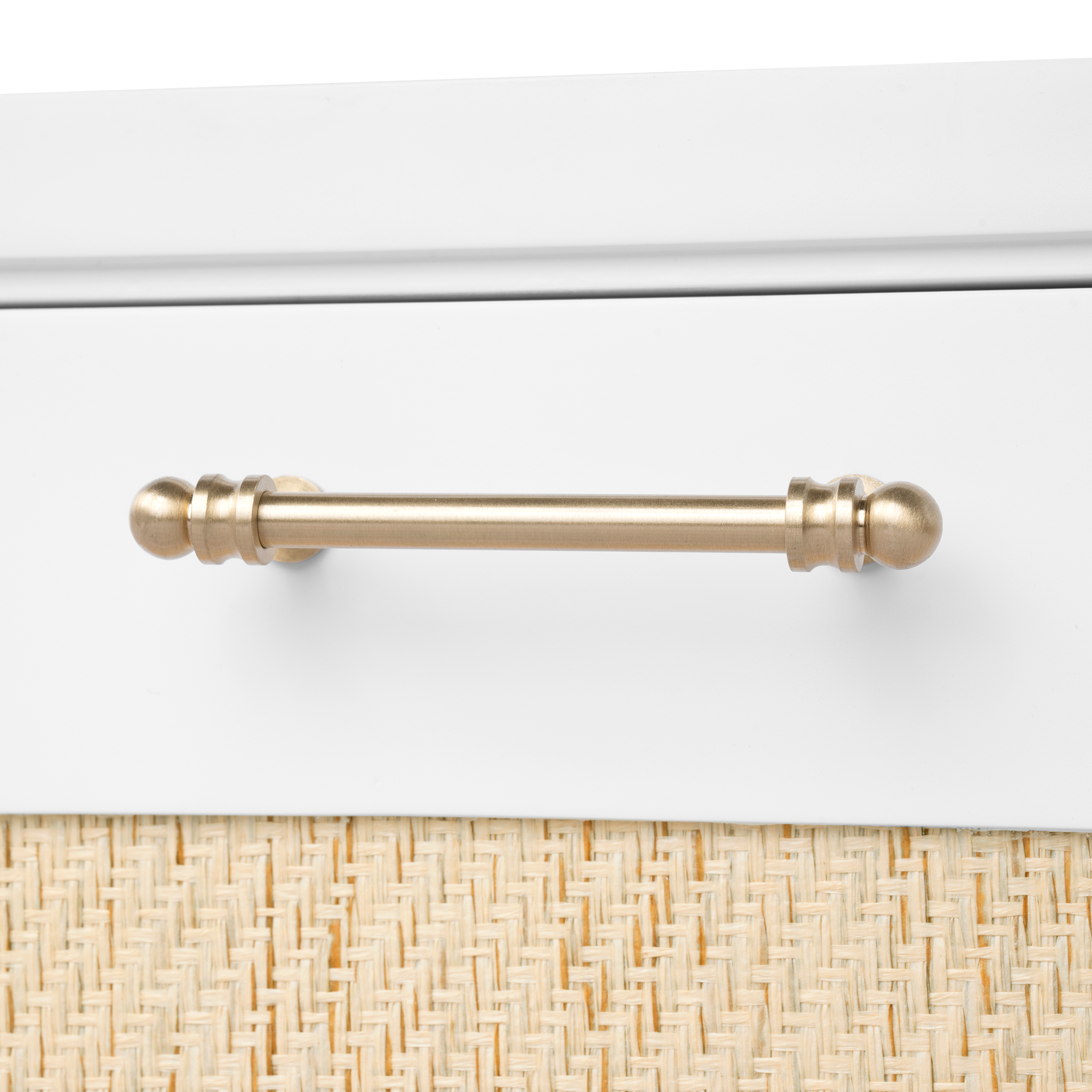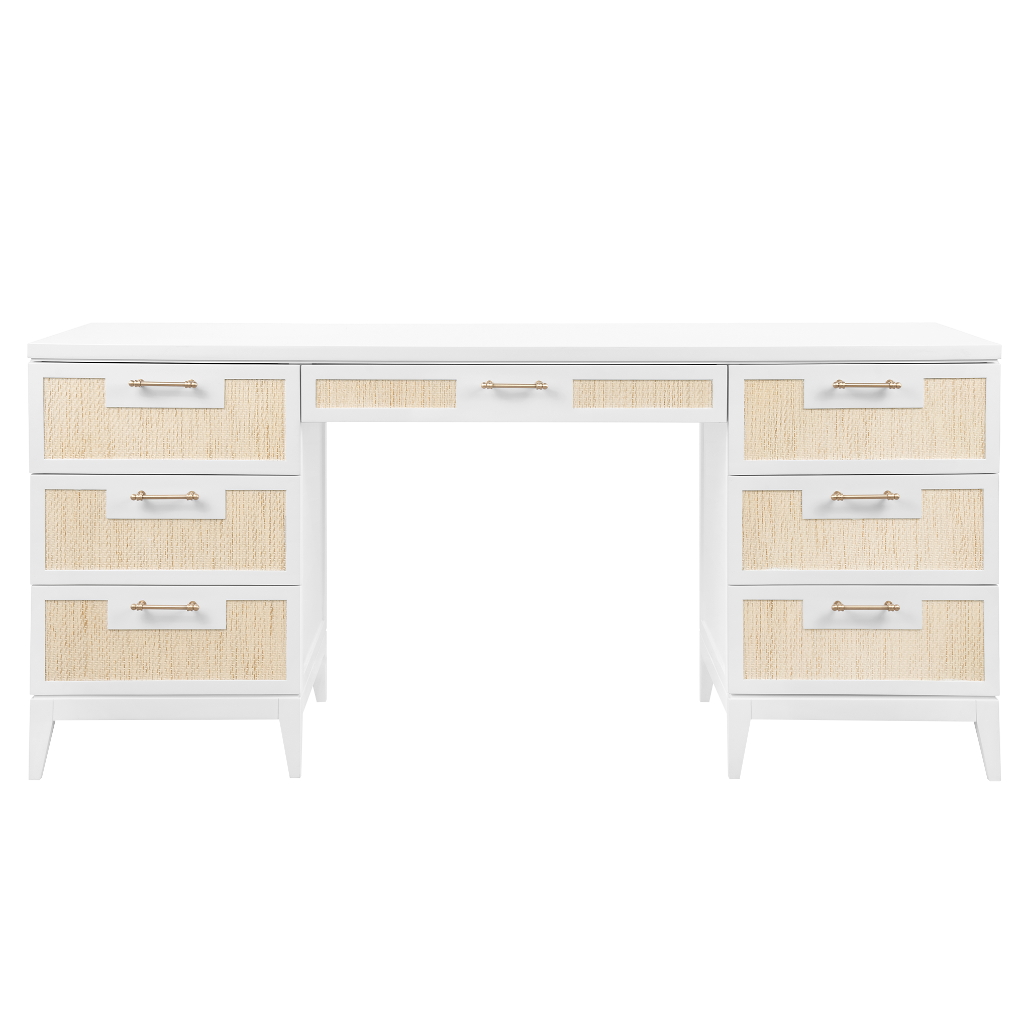 Modern minimalism meets Eastern romance in our Astor Collection, inspired by the elegance of Chinoiserie design. The Astor Desk, available in white lacquer, features panels of finely-woven grasscloth, which add a natural element. Its seven soft-closing drawers of veneered wood boast custom brushed brass pulls as the perfect finishing touch, securing its status as a chic and sumptuous piece of work. Add to a study, living room, or bedroom with worldly ambitions.