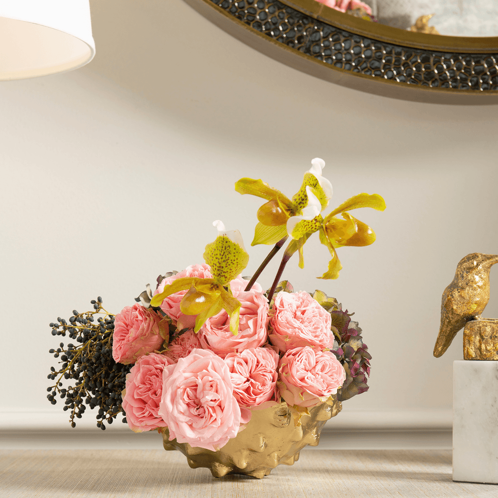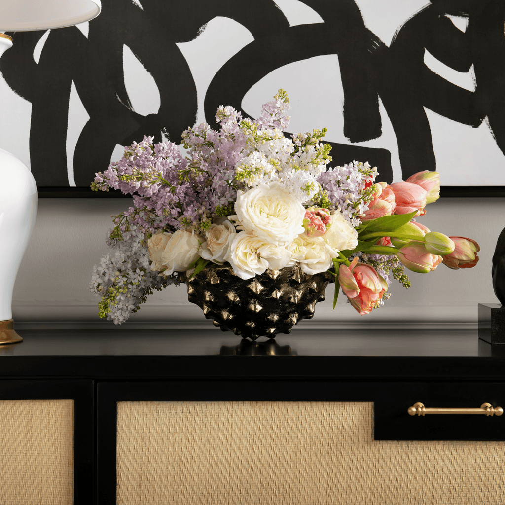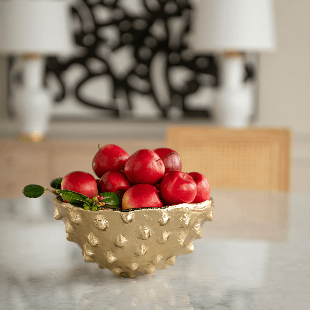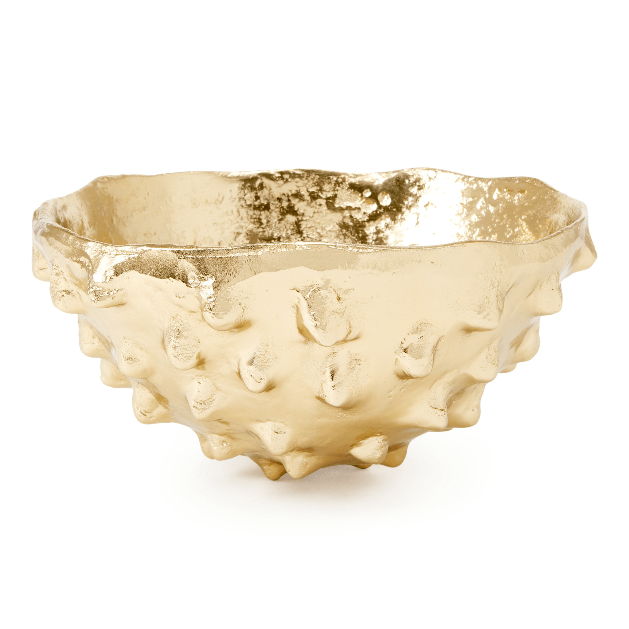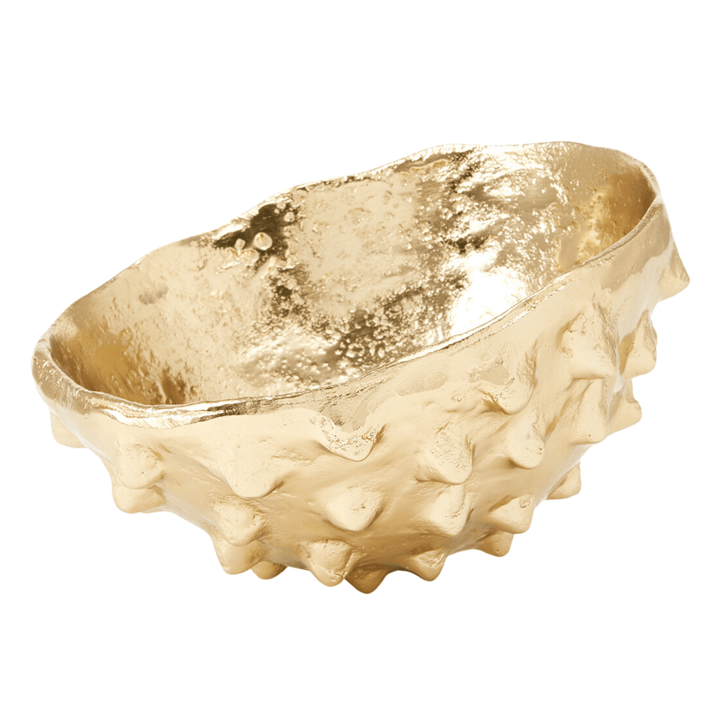 The Kiwano Bowl sparks the imagination and serves as a unique ornament for side tables, consoles, or as a centerpiece. Hand cast in metal with a glittering brass finish, the bowl feels like an otherworldly treasure, though it pulls inspiration from organic shapes and textures. Its exterior is outfitted in an energetic pattern of gilded spurs, an eye-catching adornment that recalls the shell of an exotic animal, and allows the bowl to stand at a range of angles. Evidence of its handcrafted artistry can be found in its imperfect edges and raw interior finish, which together give the piece a truly-one-of-a-kind allure. Use it to display fruit or flowers, or as a striking vessel to drop your keys in an entryway.