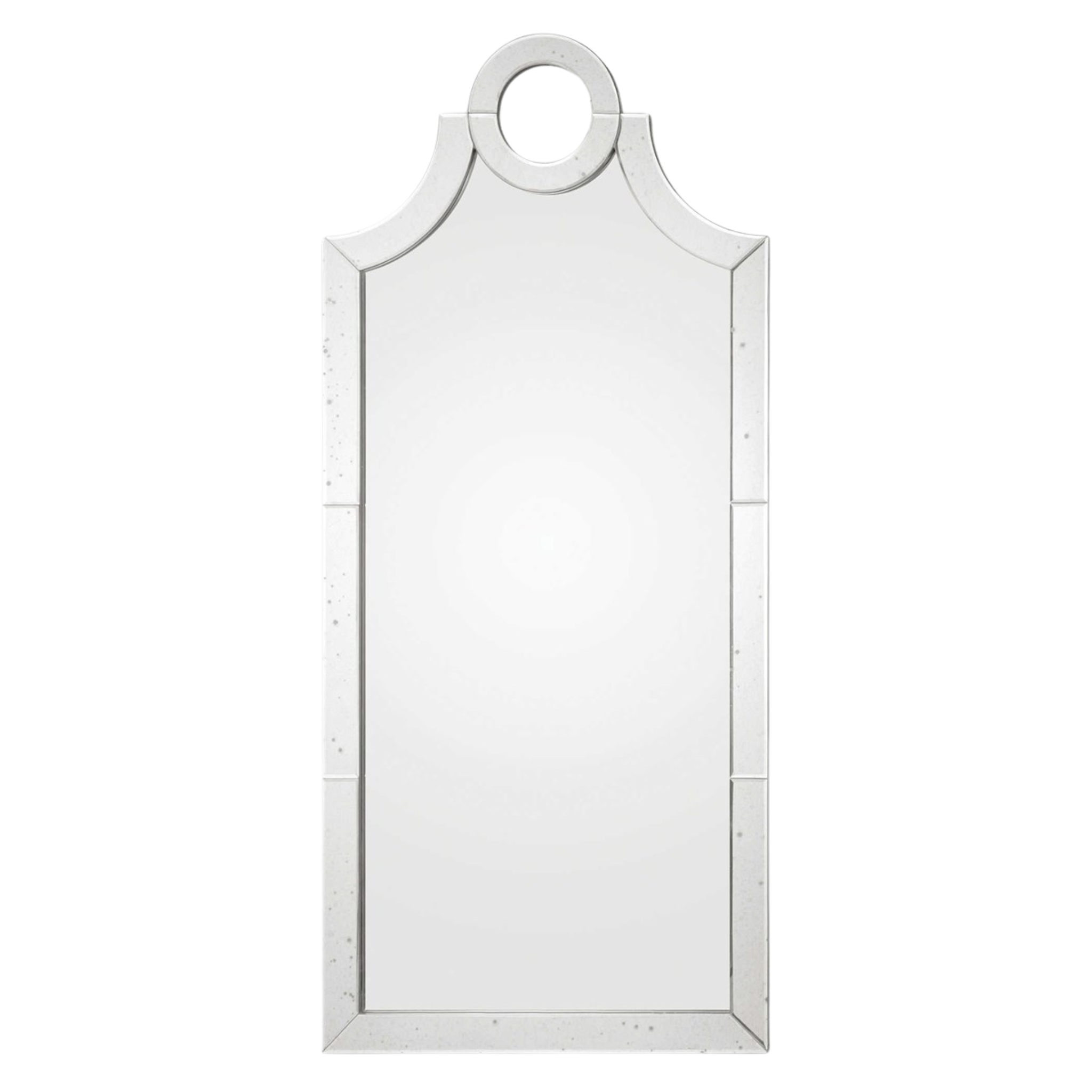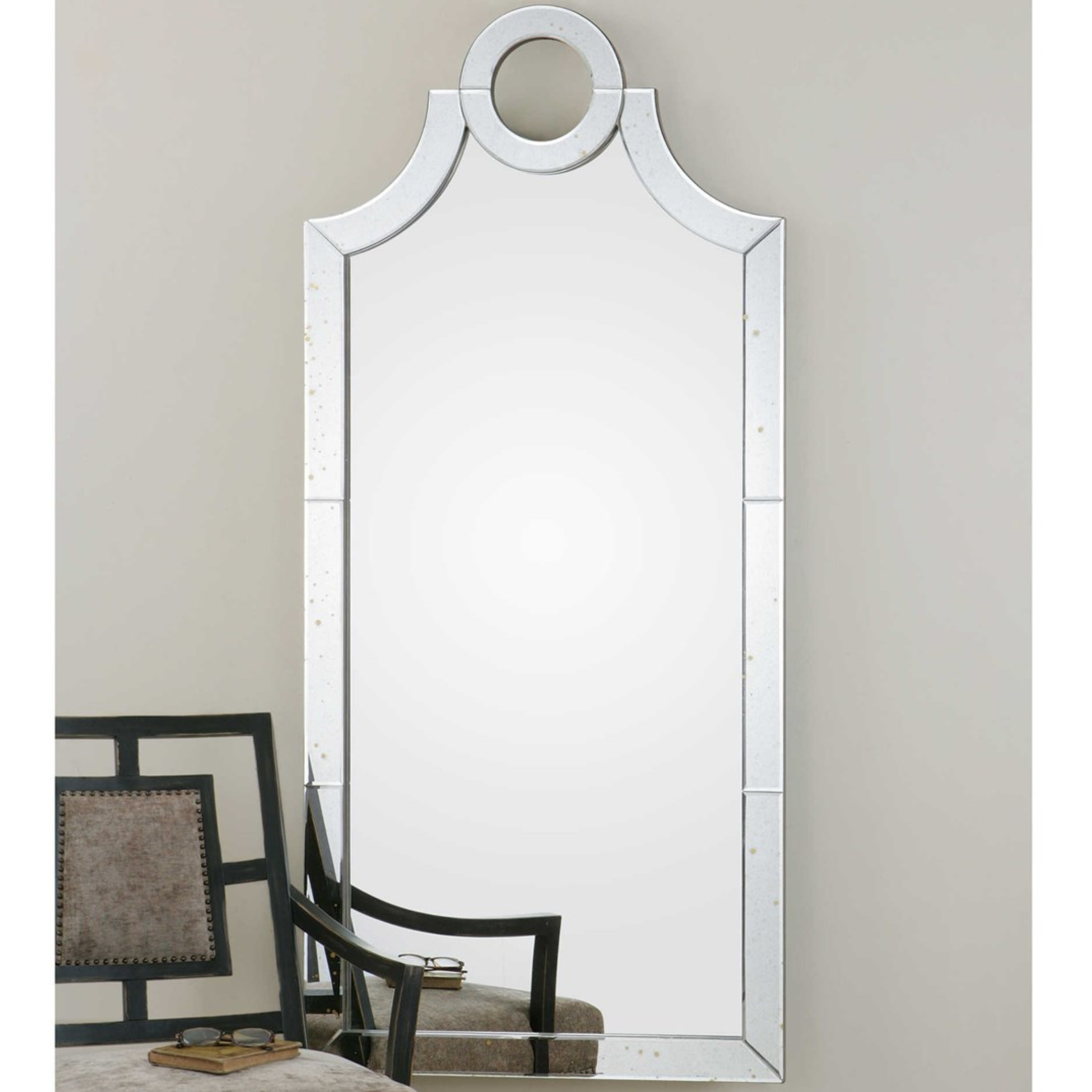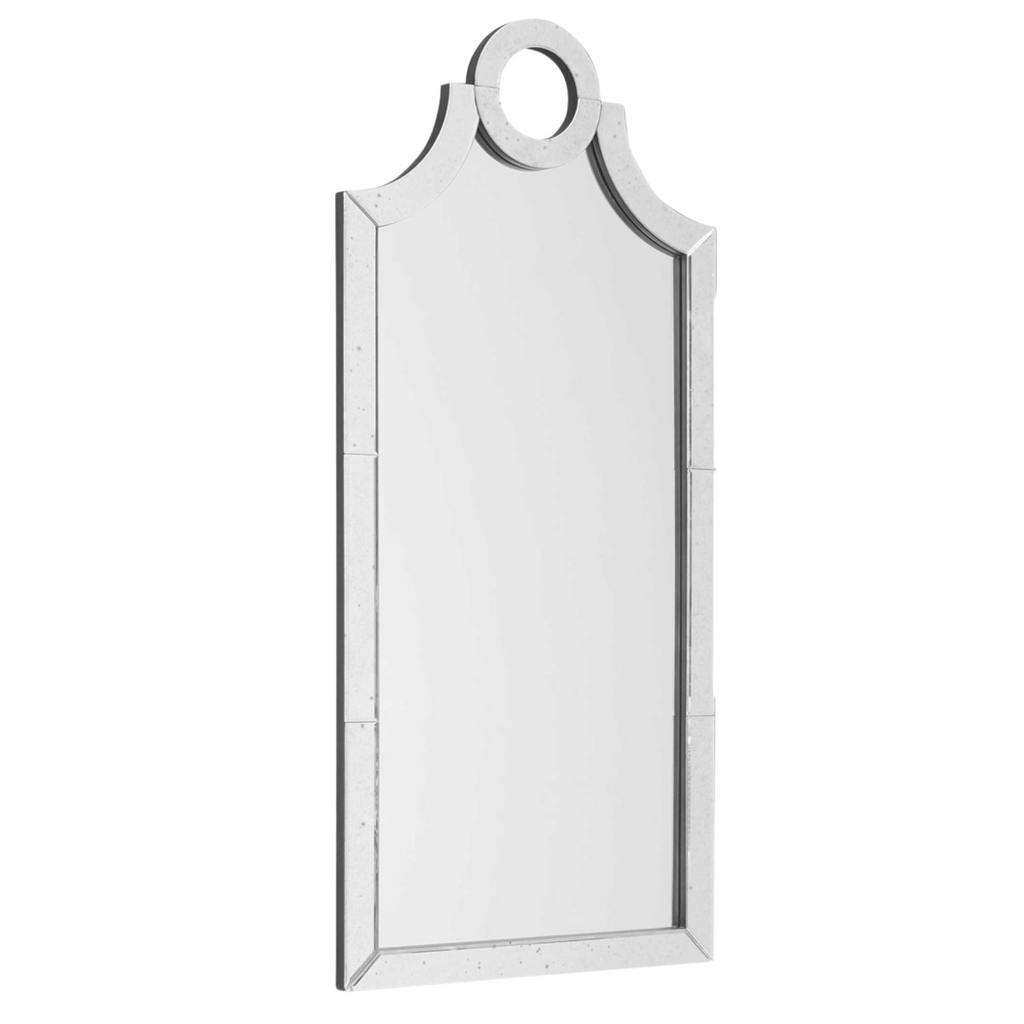 Frame is constructed of lightly antiqued, beveled mirror tiles.