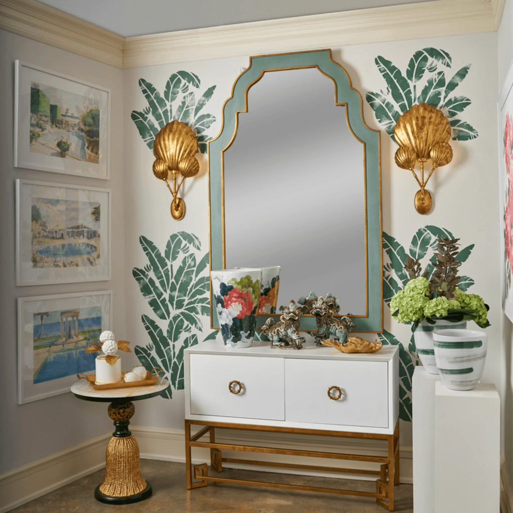 Antique mint green painted wood with antique gold leaf edges and plain clear mirror, designed by Bradshaw Orrell.