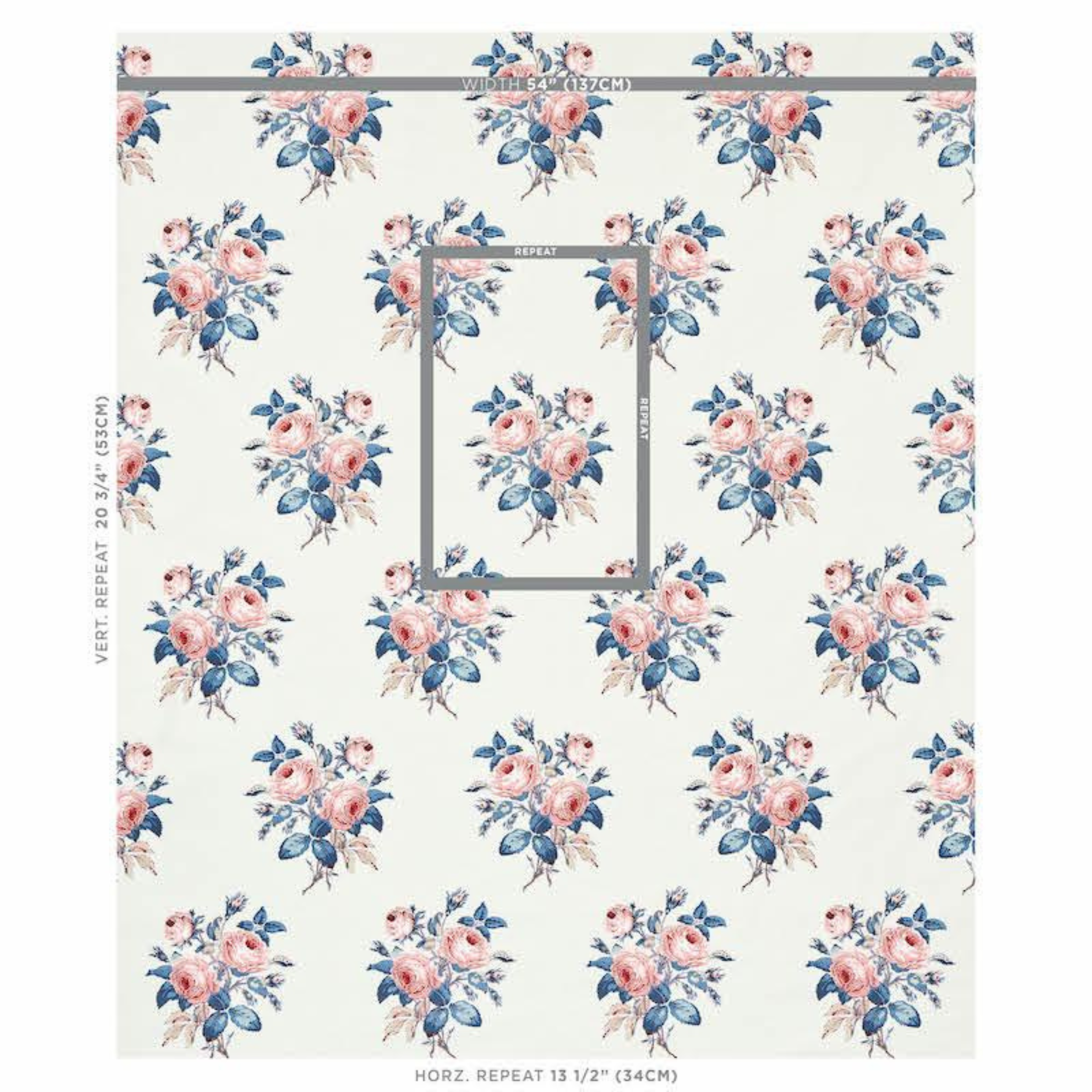 • The wallpaper measures 54 1/2" wide with a horizontal repeat of 13 1/2" and a vertical repeat of 20 3/4" with a straight match.