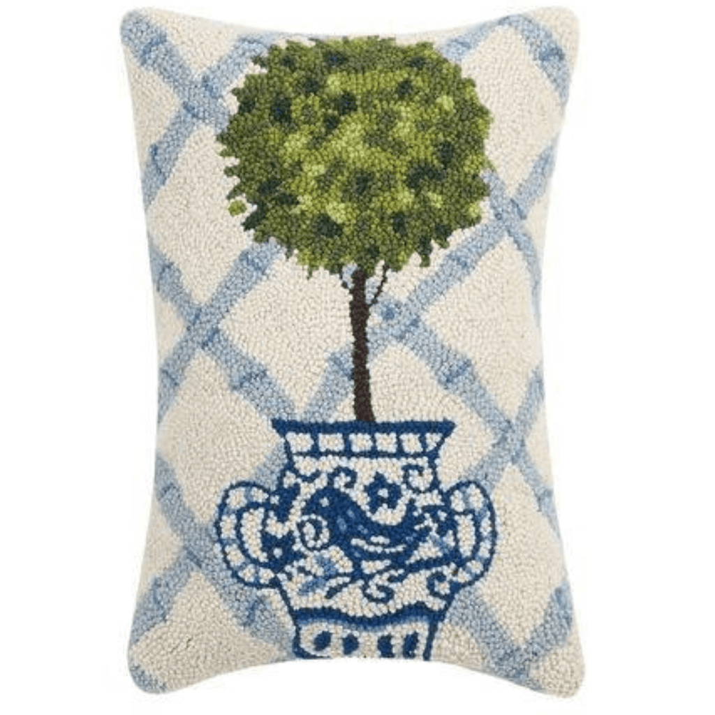This blue topiary decorative throw pillow measures 12 x 18 and is made from 100% wool and cotton.