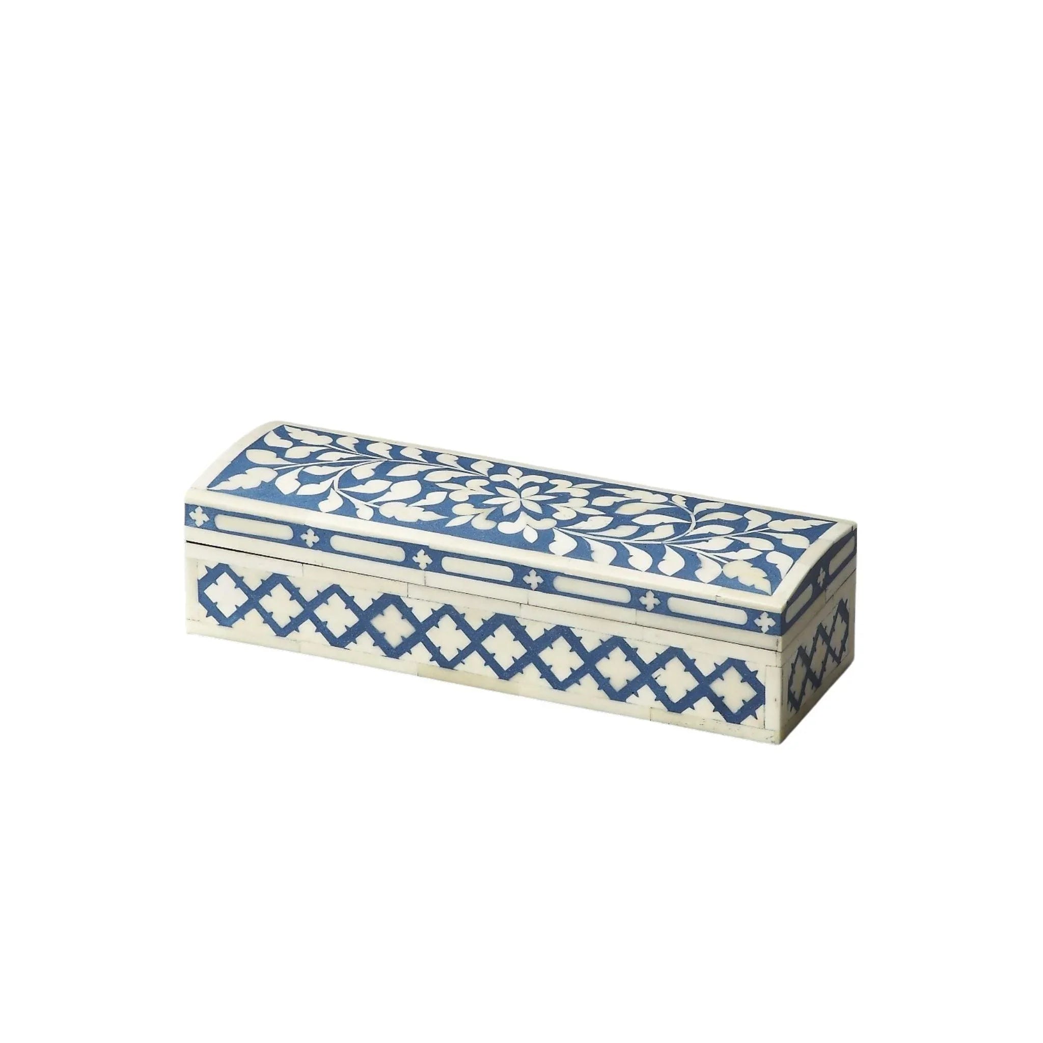 The small personal items that make life special: keepsakes, jewelry, and cufflinks, all are comfortably cared for in this bone-inlay storage box. The intricate handcrafted design makes it perfect for him or her in rich blue with iridescent bone mosaic.