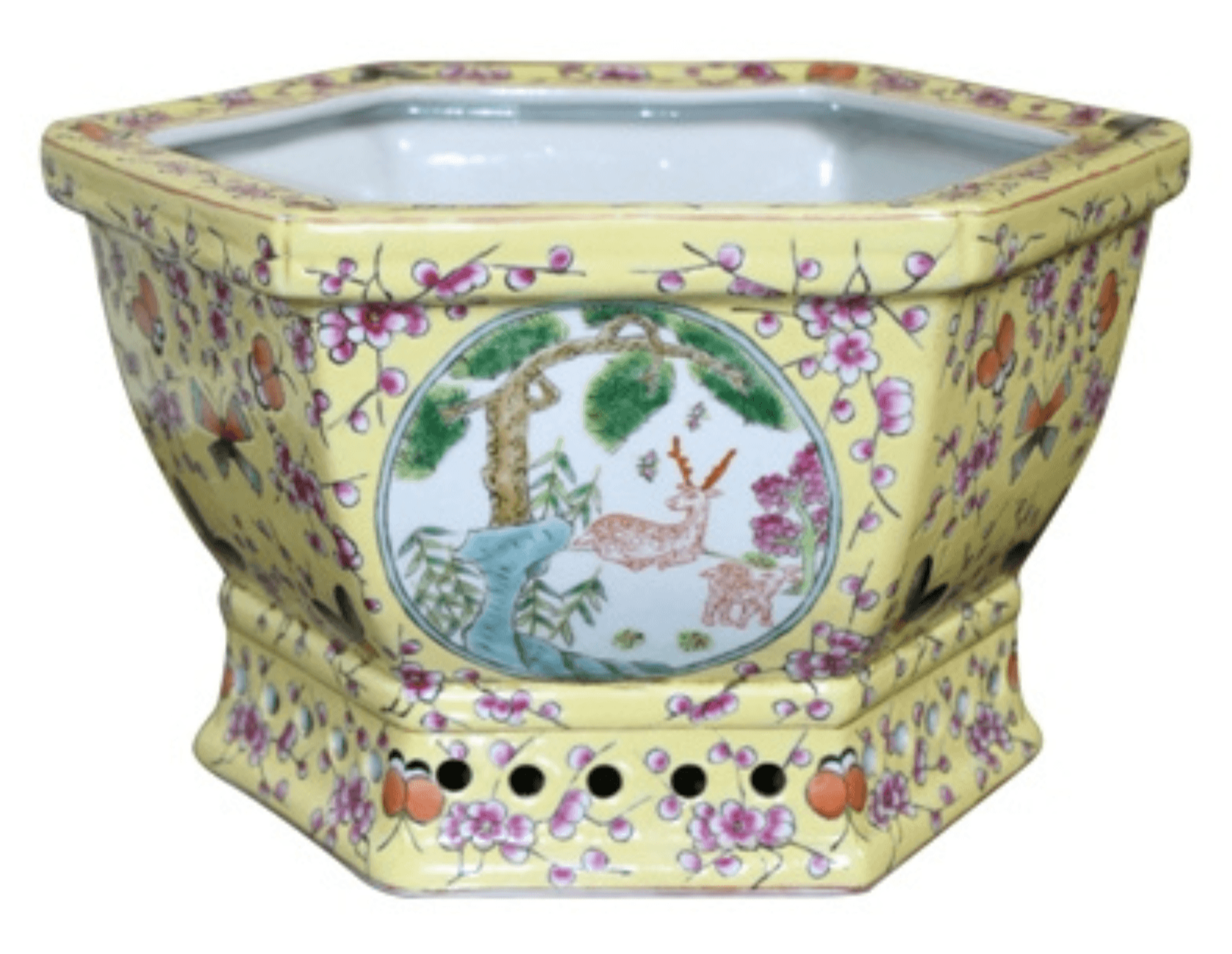 This decorative porcelain hexagonal cachepot is hand painted. This cachepot is approved for indoor or outdoor use. Measures: 10.5"L x 7"H x 8.5"D. Shade and color variations are intrinsic to the beauty of handmade items and are not a product defect. Each product is unique, and the product photo shown represents one, but colors can vary.Click image for greater detail.