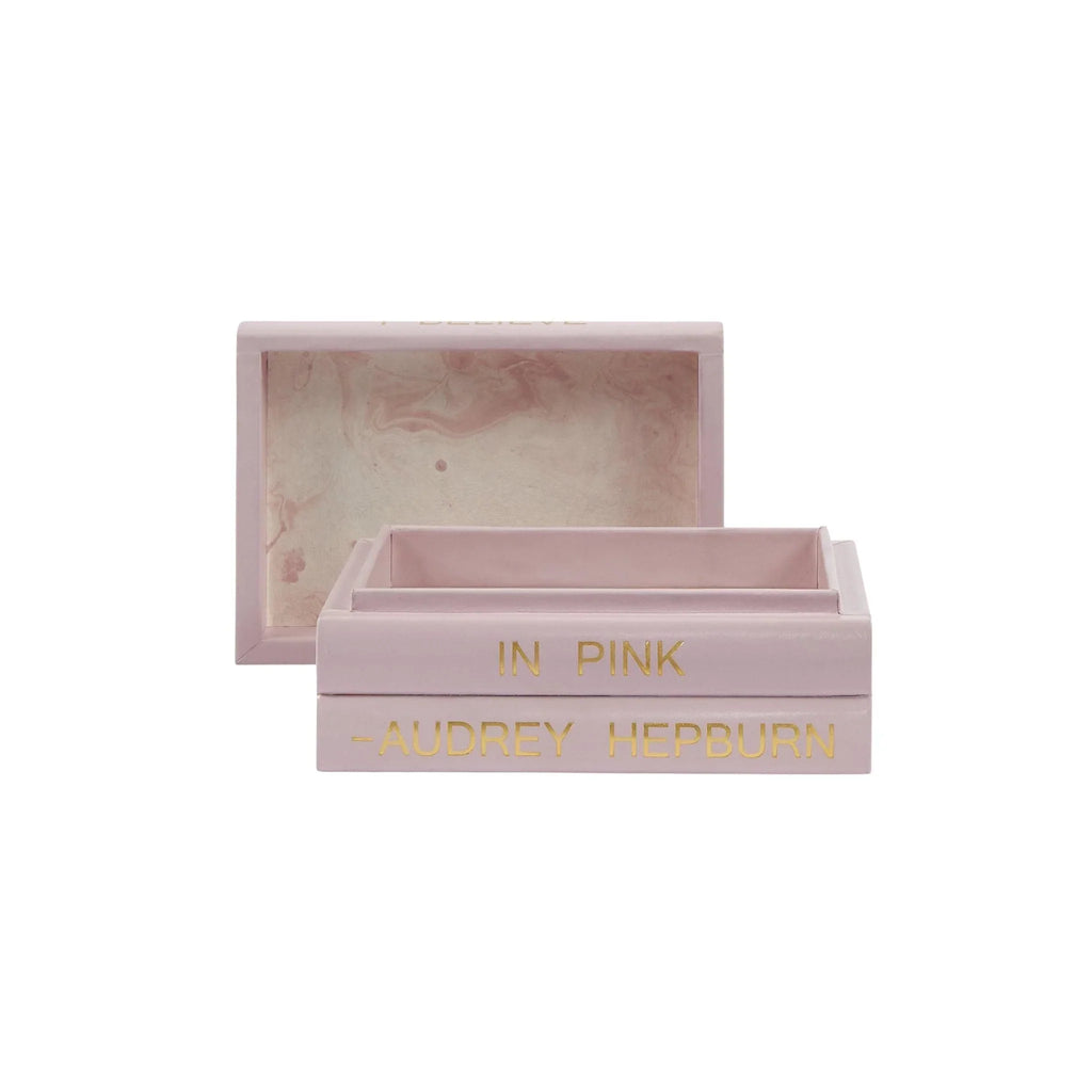 Pink leather-bound wooden box with I believe pink Audrey Hepburn quote in distressed gold lettering. The box is made to look like a stack of books. The inside of the box features a hand-painted marble design. Also makes a great gift!