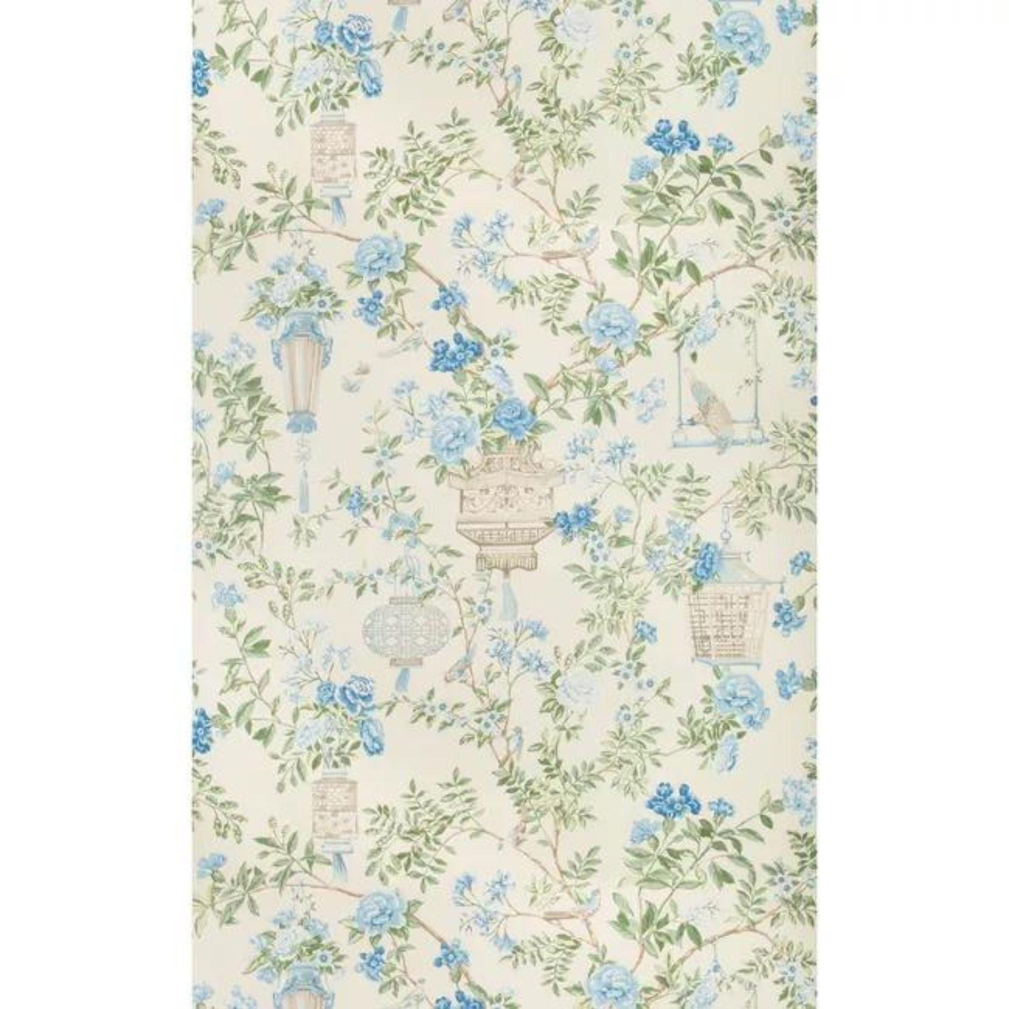 This lovely Brunschwig & Fils wallpaper features a pretty floral pattern on a delft background. Please note this wallpaper is sold as one roll, the roll measures 8.76 yards. This item is cut from a die lot upon order and may not be returned.