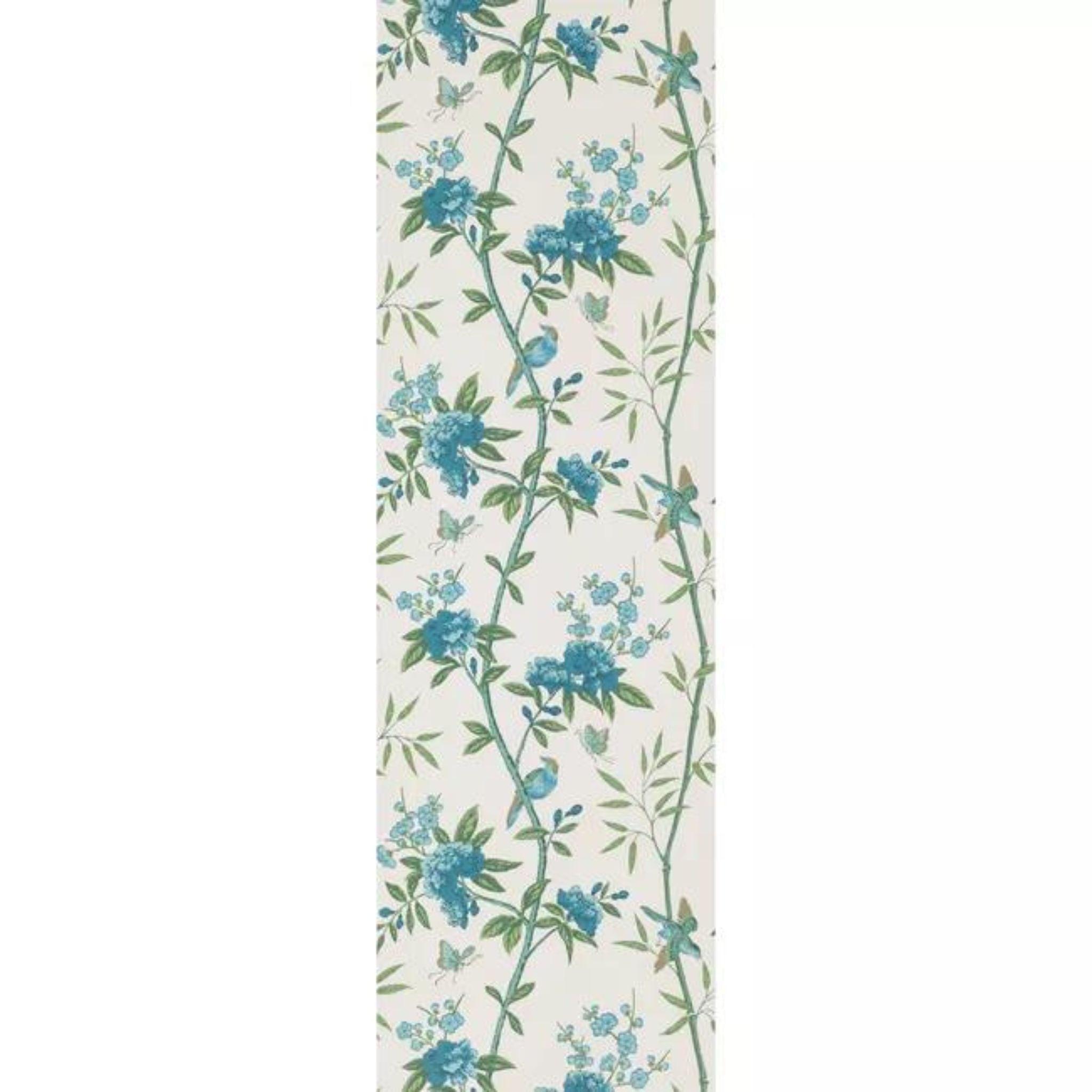 This lovely wallpaper features a lovely peony and blossom wallpaper in indigo and teal. Please note this wallpaper is sold as one roll, the roll measures 10.99 yards. This item is cut from a die lot upon order and may not be returned.