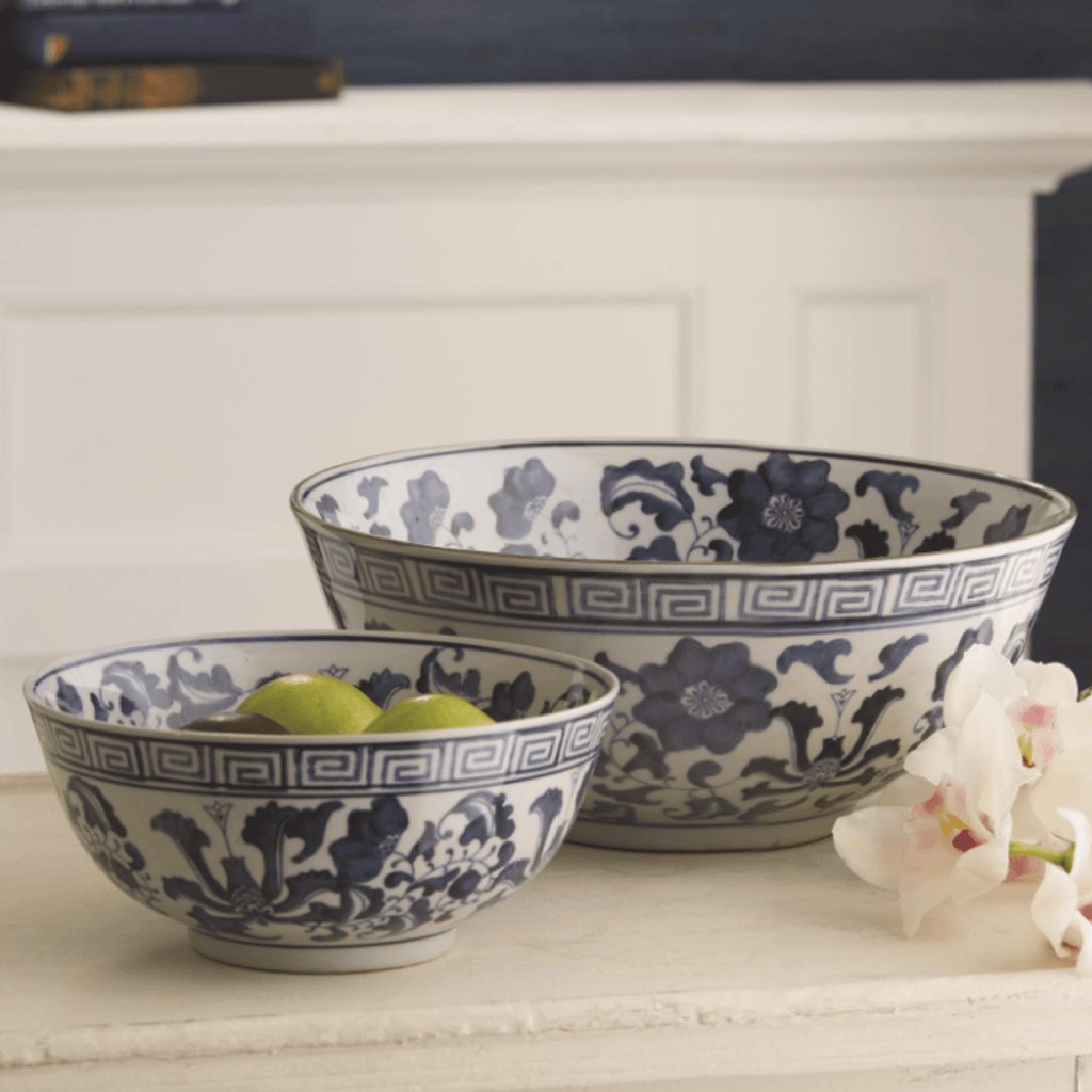 Inspired by designs from the ancient Ming and Qing dynasties, soft blue lotuses move elegantly around the outside of these porcelain bowls. Each is hand-painted with intricate detail and a soothing blue and white palette. The classic blue and white can be placed in just about any surrounding. Measures: 4 1/4" H x 9 1/2" Dia, and 6" H x 14" Dia. Click images for greater detail.