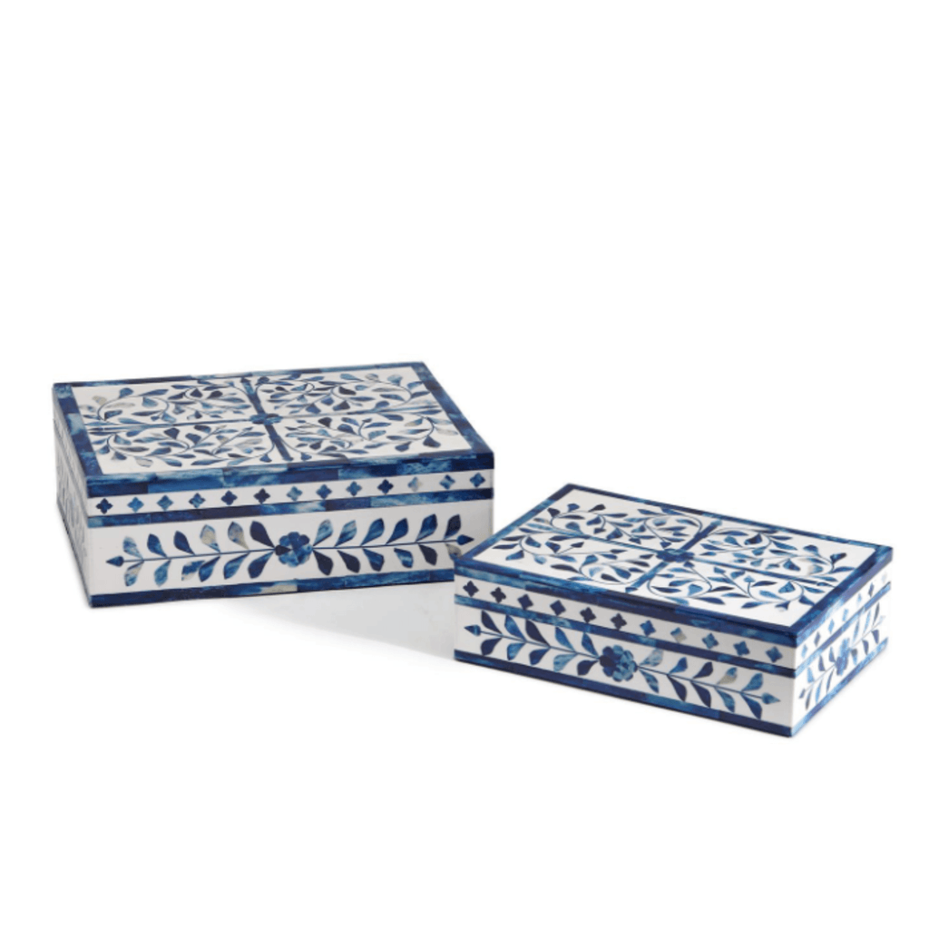 This blue and white set of 2 boxes is carefully crafted using bone and resin. Each petal is artfully placed to create an arrangement that flows so perfectly around. Each box is hinged for easy access. Measures: 10" W x 7" D x 3" H and 12" W x 9" D x 4" H. Click images for greater detail.