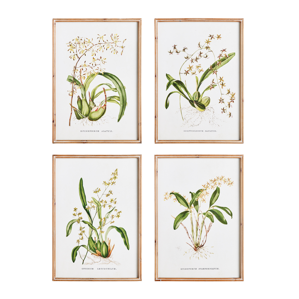 There are endless orchid species, each with their own brilliant characteristics. Those distinctive qualities are highlighted in this set of prints. Hang them together, or separate into pairs. The fir wood frames with a simple profile frame them out nicely. Click images for greater detail.