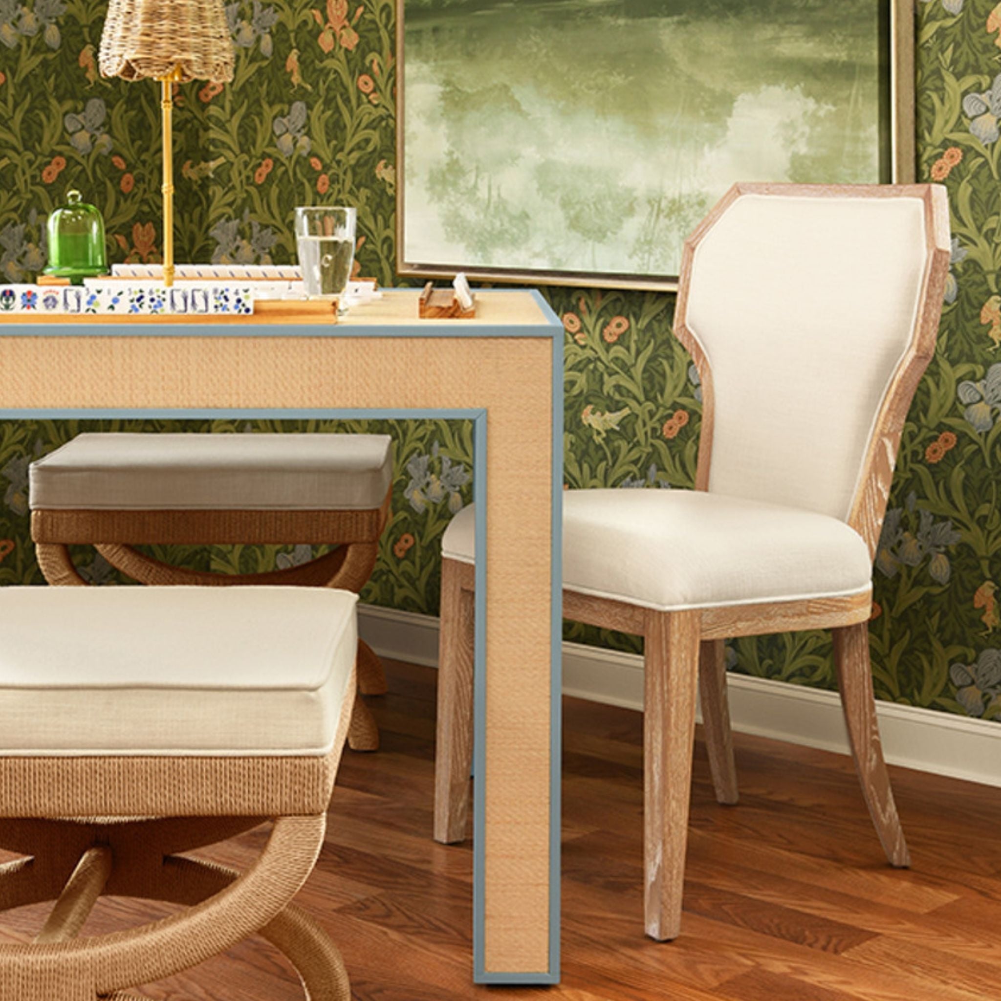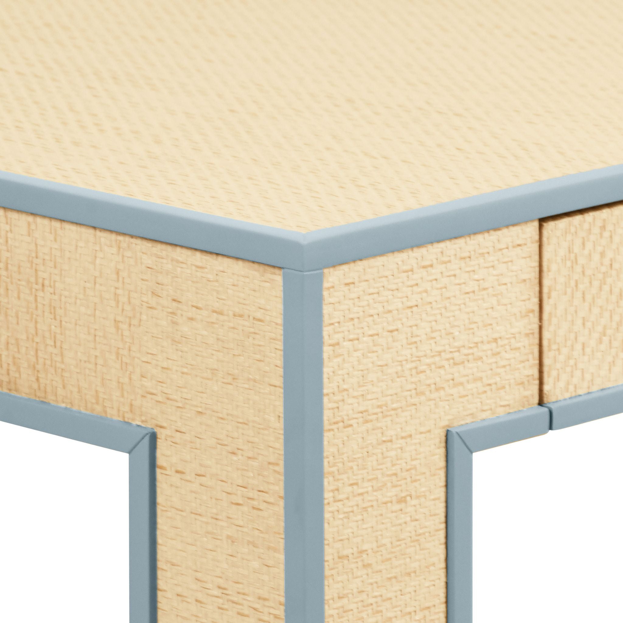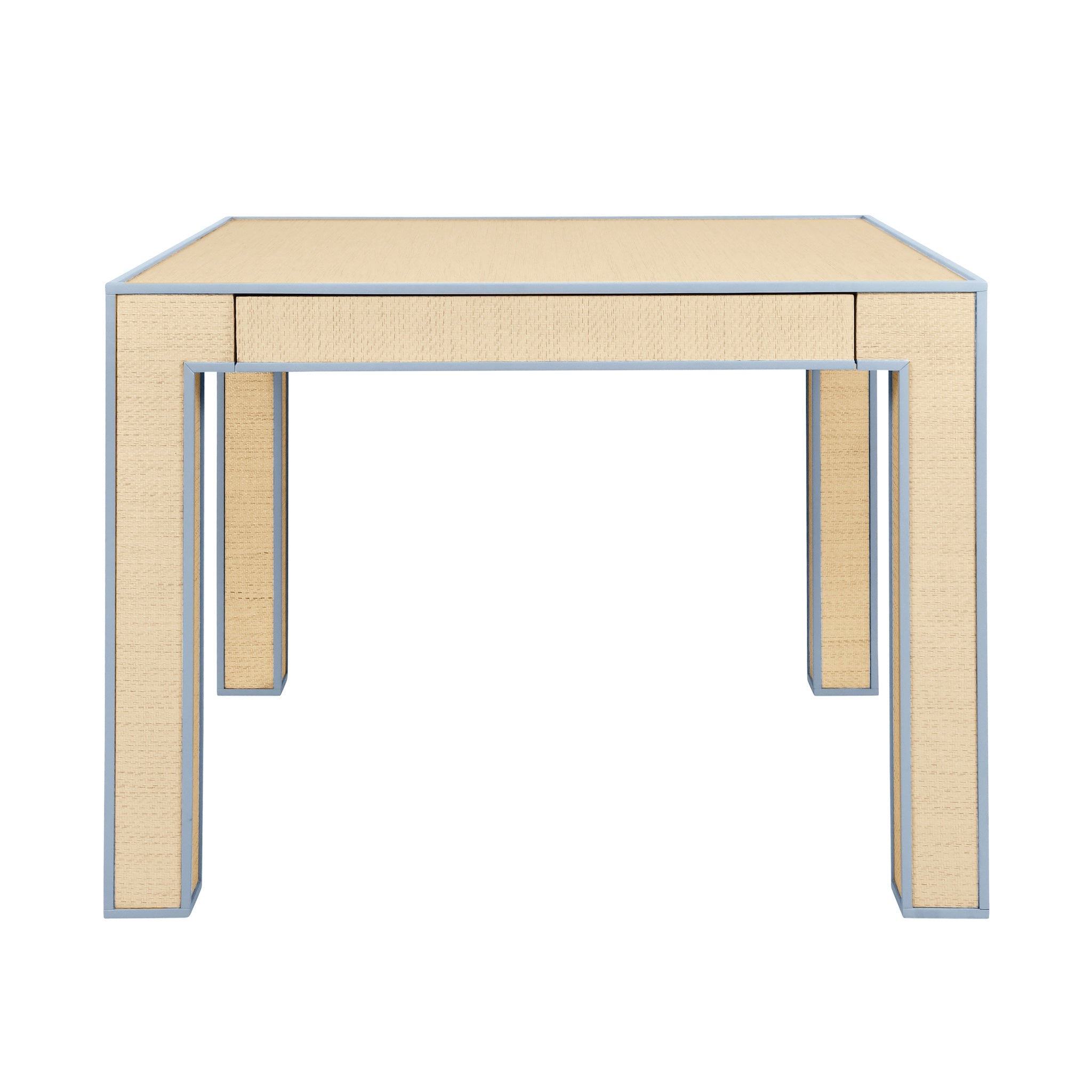 The Collins Game Table features a sleek square design with a matte light blue lacquer frame and an inset natural grasscloth top for a modern yet organic touch. .