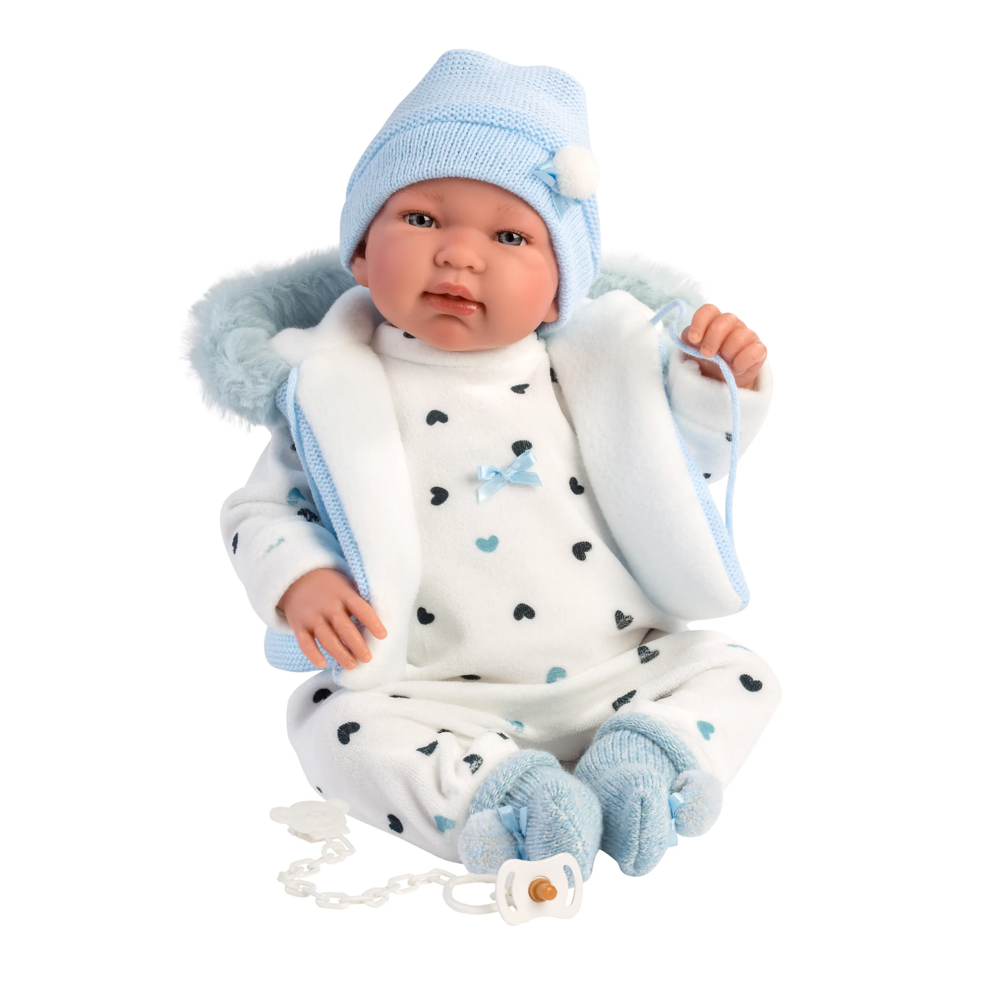 Marco is the perfect first baby doll. He is dressed in an adorable white onesie with hearts and matching blue hat, hooded vest and booties. Bright blue eyes and a smooth baby complexion. Adorable baby fingers and toes, baby rolls on belly and legs.