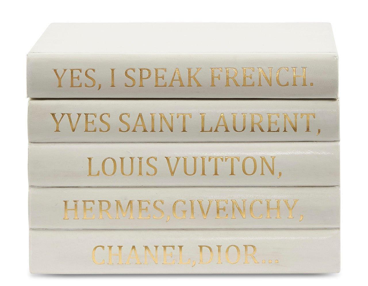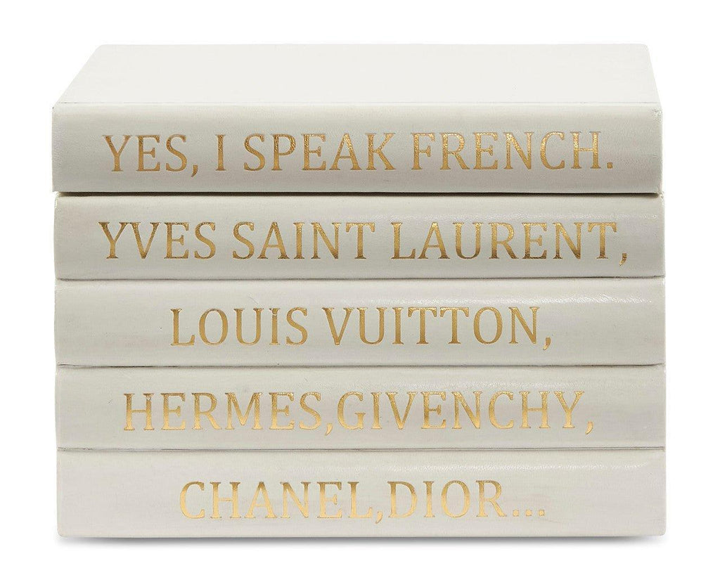 5 Volume Vellum White Leather Box with "I Speak French..." Quote Book Stack