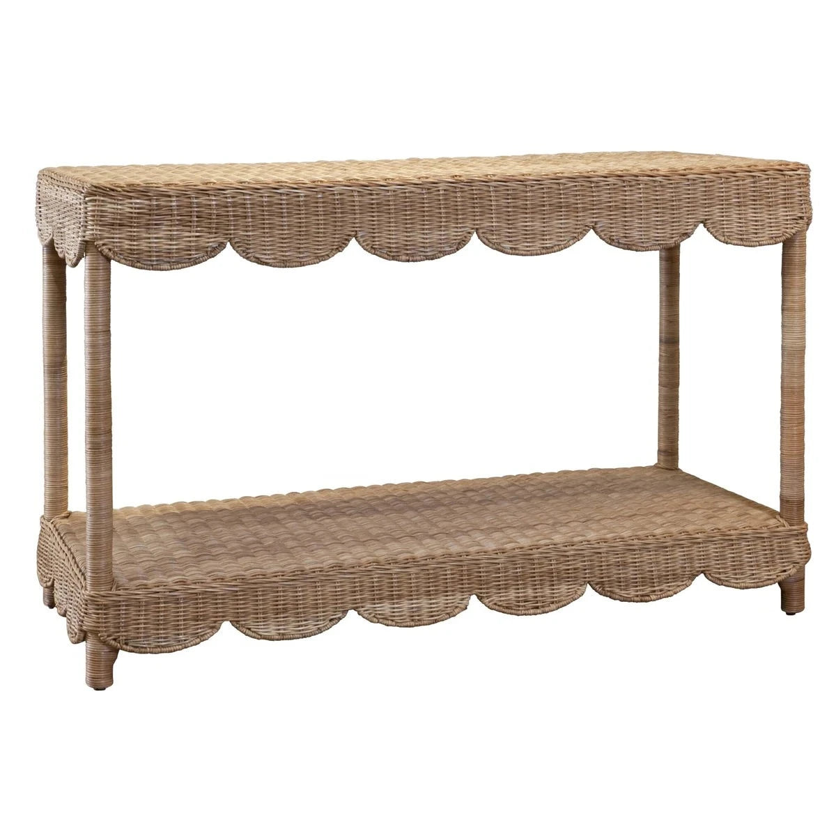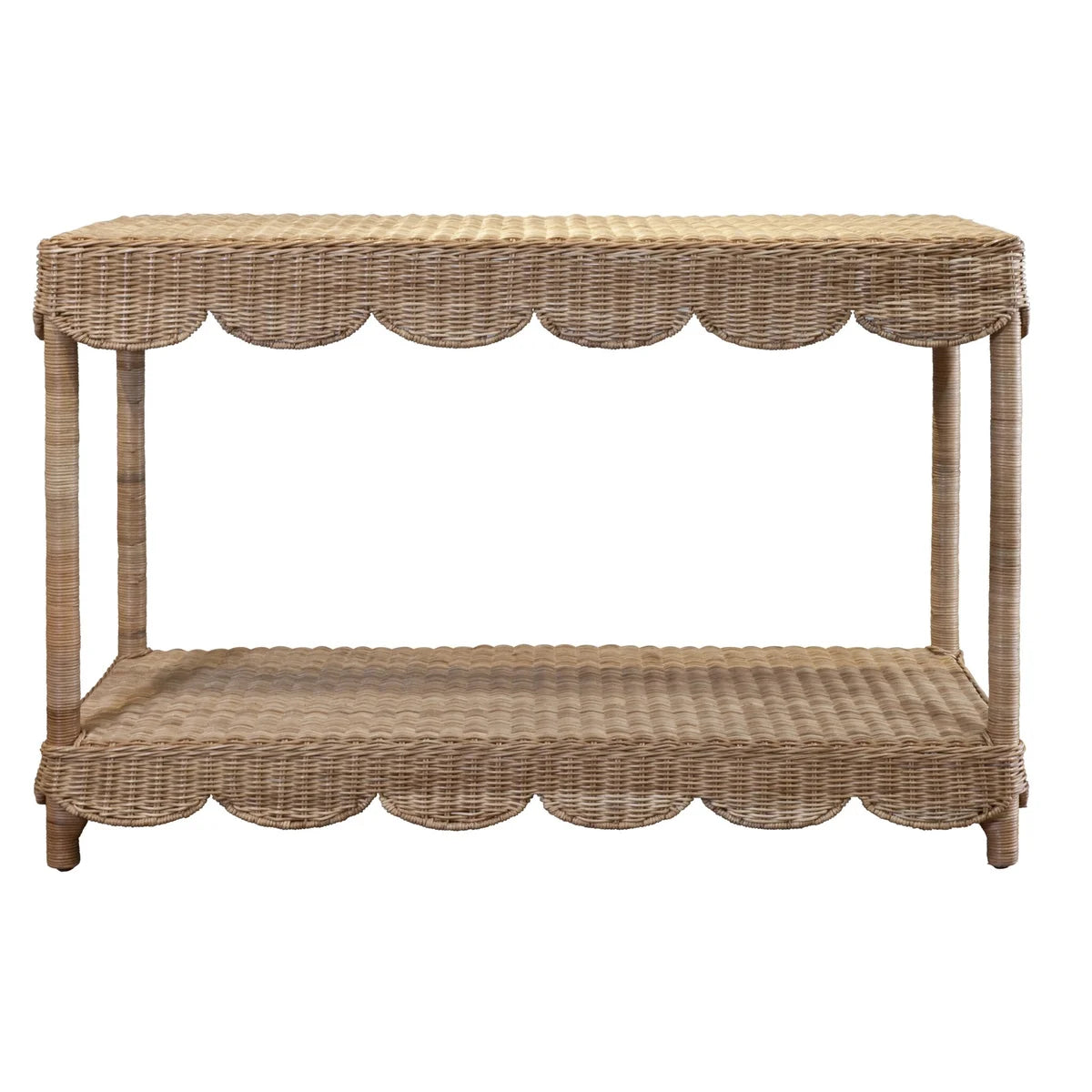This console table features a scalloped edged detail in effortless handwoven wicker and two-tiered shelving perfect for displaying accents & showing your style! Place it in a hallway, living area or dining room as the statement piece for a chic & functional accent!