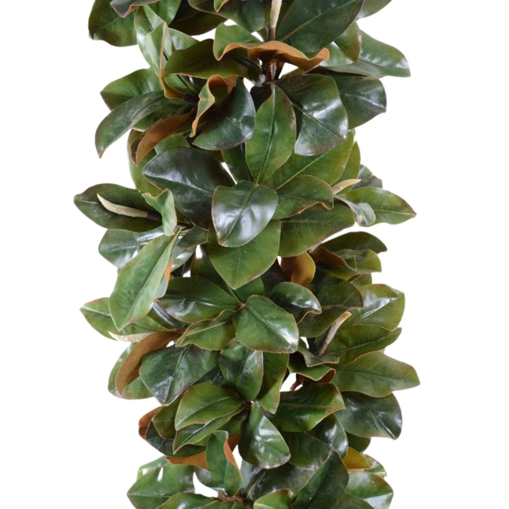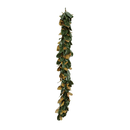 This lush garland of lifelike Magnolia leaves will stay full and healthy-looking all through the holiday season. Each leaf has a waxy gloss finish on the top and a golden suede finish on the underside for a real Magnolia look and feel. Suitable for seasonal outdoor use, but should not be left in direct sunlight for extended periods of time.